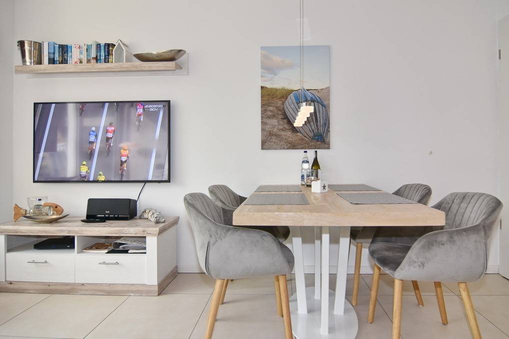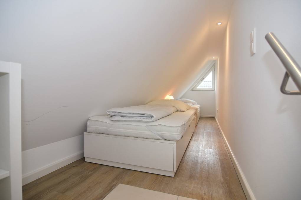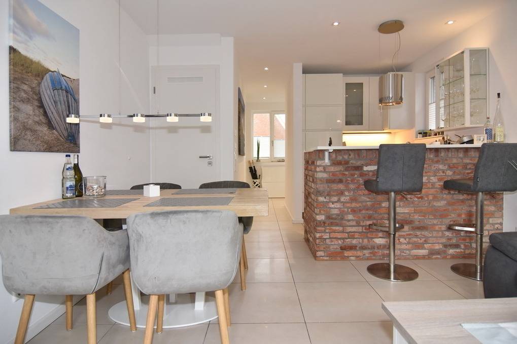 Exklusive Haushälfte für max. 6 Personen, ca. 133m². EG: Wohnraum mit Sitz- und Essbereich (Esstisch für 4 Personen, 2 Sitzplätze am Küchentresen), offene Einbauküche mit Backofen / Mikrowelle und Geschirrspüler, möblierte Südterrasse mit Markise, Flat-TV, Gaskamin/Ofen, Gäste-WC, Flurbereich mit Garderobe. OG: 1 Schlafzimmer mit Doppelbett und Flat-TV, WLAN (ohne Gewähr), 1 Dusch-/Wannenbad. offenes DG: 1 Schlafzimmer mit 2 Einzelbetten (durch Schräge maximale Stehhöhe 1,80m, kein Schrank). UG: 1 Schlafzimmer mit Doppelbett und Bettwäsche und Handtücher sind zur Anreise aufgezogen.d Flat-TV, Duschbad / WC, Sauna (3 Sitzplätze, Stehhöhe ca. 1,80m). HW-Raum mit Waschmaschine/Trockner, extra Kühl-Gefrierkombi, Kinderreisebett und Hochstuhl vorhanden. Pkw-Stellplatz mit Wallbox am Haus -100% Ökostrom - Wallbox kann kostenfrei genutzt werden. Tierhaltung ist erlaubt, muss bitte angemeldet werden. Bettwäsche und Handtücher sind zur Anreise aufgezogen.