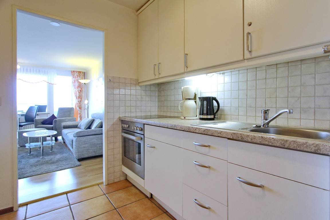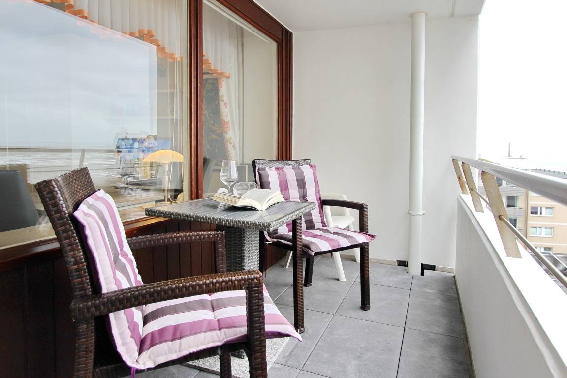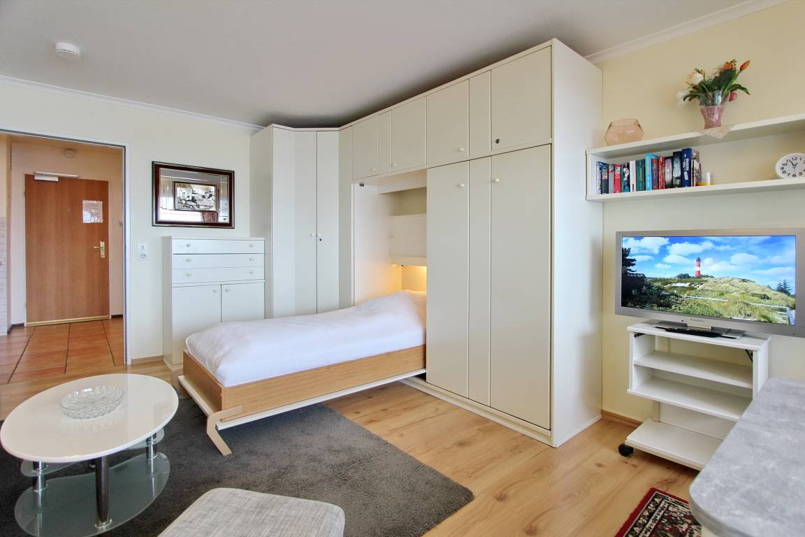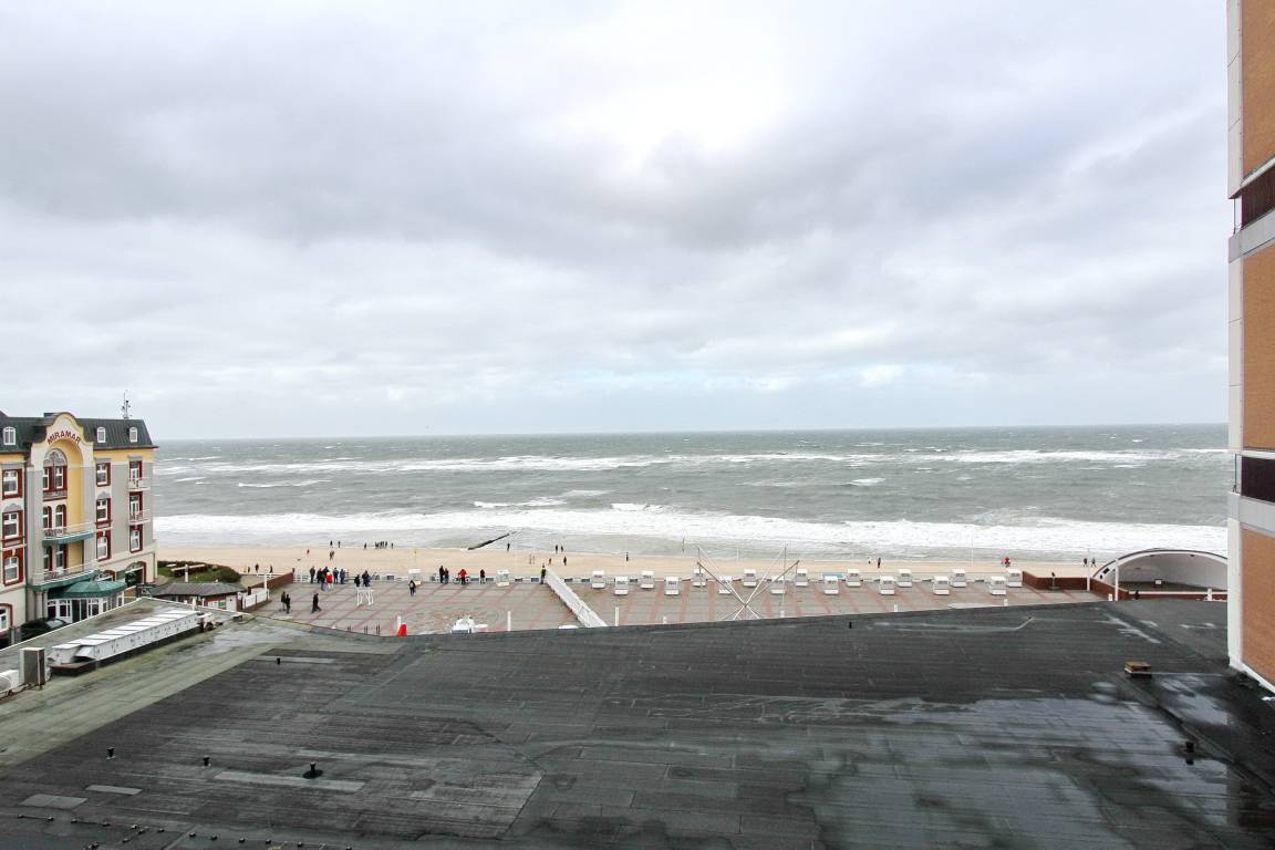 Schöne 1-Zimmer- Wohnung im Haus am Meer in der 4. Etage mit herrlichem Blick auf die Nordsee. Von der vorgelagerten Loggia haben Sie einen tollen Blick auf die Promenade und können die Sonnenuntergänge genießen. Der kombinierte Wohn-/Schlafraum verfügt über 2 Einzelschrankbetten, einer gemütlichen Couchgarnitur mit Sessel und einem Essplatz mit zwei Stühlen am Fenster. Die kleine Küchenzeile im Flur ist ausgestattet mit einem Cerankochfeld mit 4 Platten, einem Backofen und einem Kühlschrank. Modernes Duschbad/WC. Nichtraucherwohnung. Haustiere nicht gestattet. Kostenfreier W-Lan-Hotspot (WEG Haus am Meer - Passwortfrei - ohne Gewähr). Wohnungsgröße 34 m².