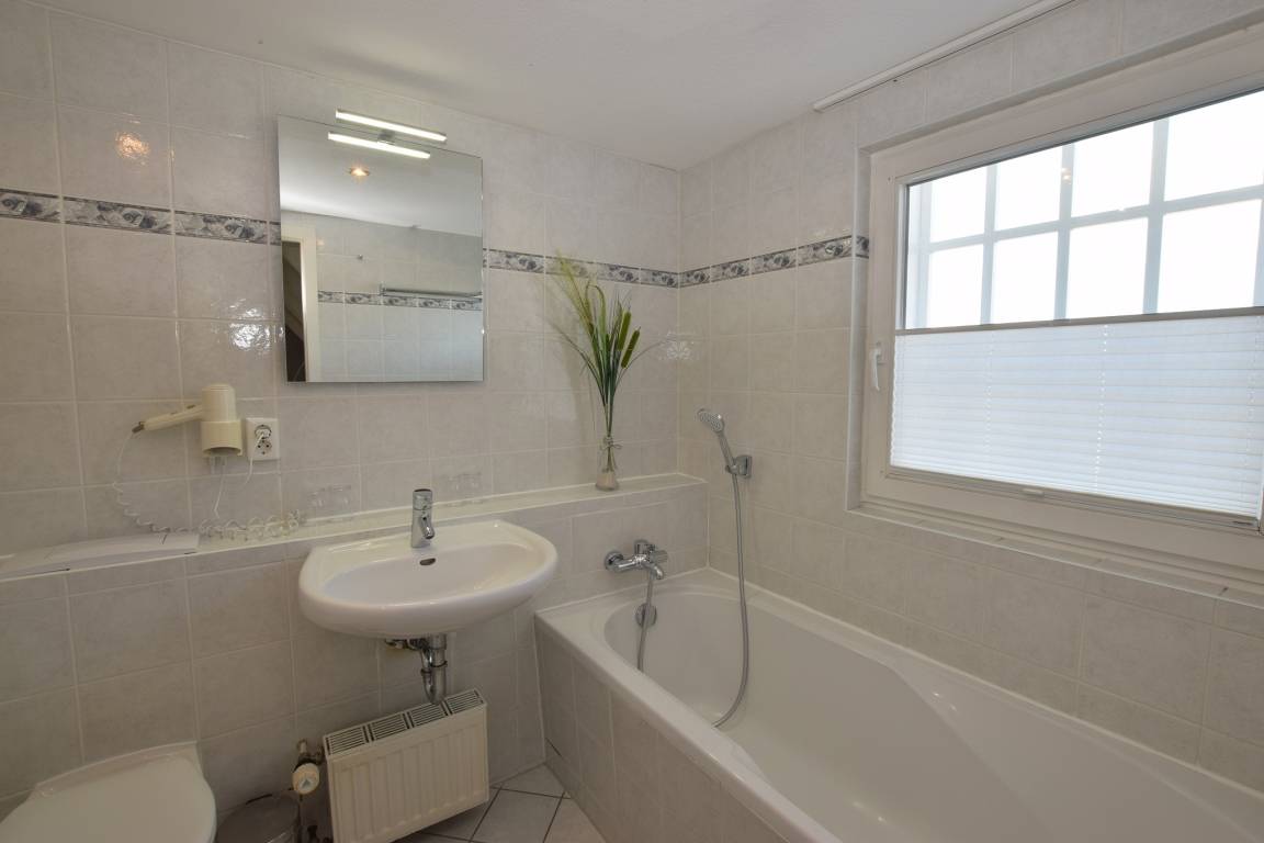 Das 1. geräumige Schlafzimmer (Vinylboden) hat ein gutes Doppelbett sowie ein schickes Wannenbad/WC.