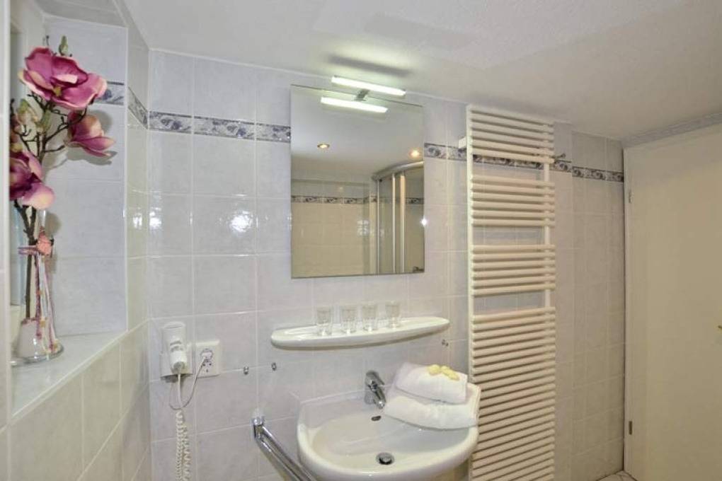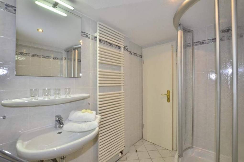Das 2. Schlafzimmer (Fliesenboden) hat ein gutes Doppelbett, ein Duschbad/WC und eine Waschmaschine unter der Treppe.