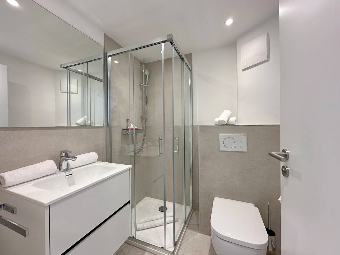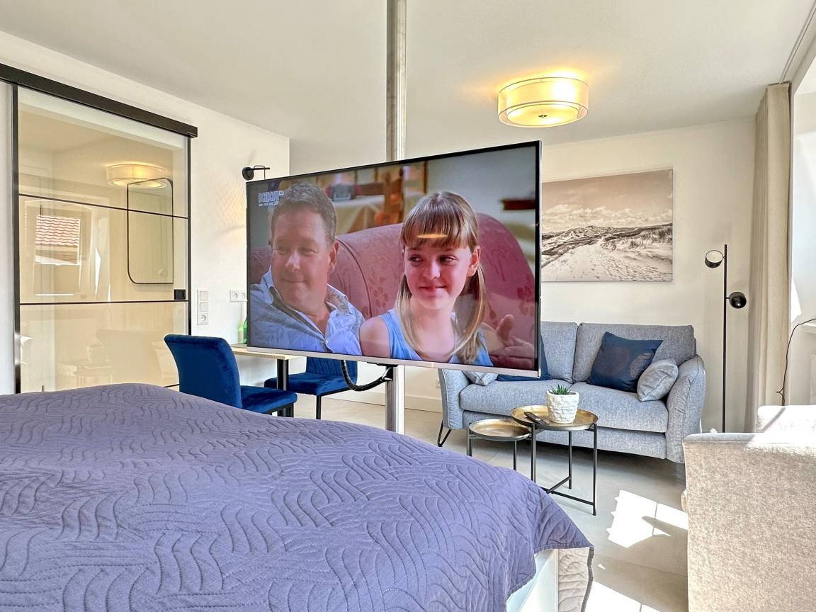 Die Wohnanlage "Olympia" bietet eine zentrale Lage in kurzer Entfernung zur Promenade, dem Badestrand und dem Meer. Auch die Fußgängerzone ist nur wenige Gehminuten entfernt. Die 1-Zimmer-Wohnung liegt im 1. Obergeschoss, wurde im Jahr 2025 von Grund auf renoviert und ist für 2 Personen ideal geeignet. Sie hat eine Größe von ca. 30 m² und besteht aus einem Wohn- und Schlafzimmer mit Doppelbett, Einbauschränken, Couch und Essplatz sowie einer geschützten Südbalkon mit Gartenmöbeln. Das TV-Gerät ist schwenkbar, sodass sowohl vom Bett als von Couch ferngesehen werden kann. Die integrierte Küche ist mit einem Induktionskochfeld und einen Kühlschrank ausgestattet. Das moderne Duschbad ist vom Dielenbereich erreichbar. In der Diele befinden sich Einbauschränke und eine Garderobe für Jacken und andere Dinge. WLAN steht zur Verfügung, jedoch ohne Gewähr. Das Mitbringen von Haustieren und das Rauchen sind nicht gestattet. Bei Anreise sind Bettwäsche und Handtücher bereits aufgezogen. Die Wohnanlage verfügt über einen Schwimmbad- und Saunabereich sowie einen zusätzlichen Wellnessbereich mit finnischer Sauna, Dampfsauna und Ruhebereich. Fahrzeuge können gegen Gebühr und vorheriger Anmeldung in der Tiefgarage abgestellt werden. Waschmaschinen und ein Trockner stehen kostenfrei zur Verfügung. Für Fahrräder gibt es einen Abstellbereich in der Garage.