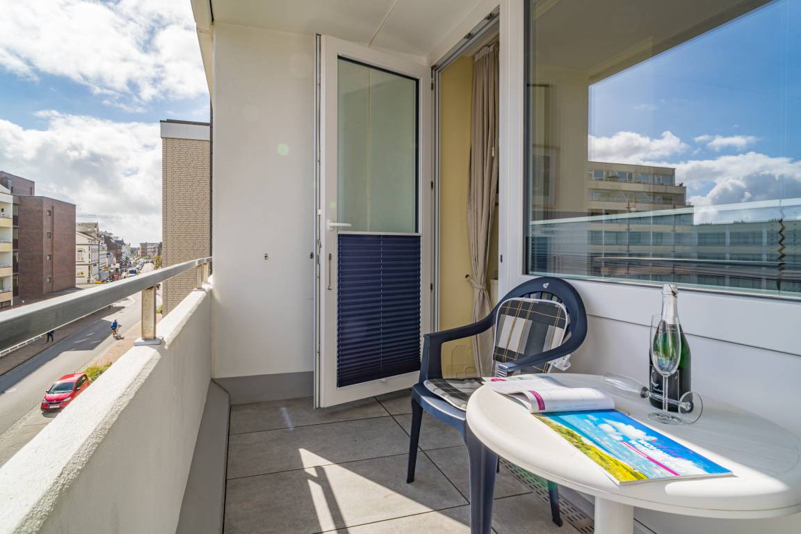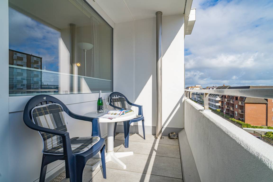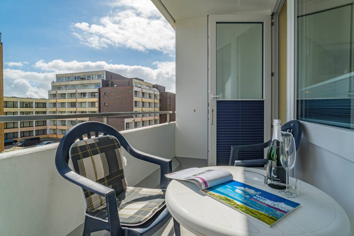 2023 teilweise renoviertes 1-Zimmer-Nichtraucher-Ferienwohnung (ca. 23 qm) in der 3. Etage zur Landseite mit Ostloggia (Morgensonne, mit Balkonmöbeln und Auflagen) für max. 2 Personen.