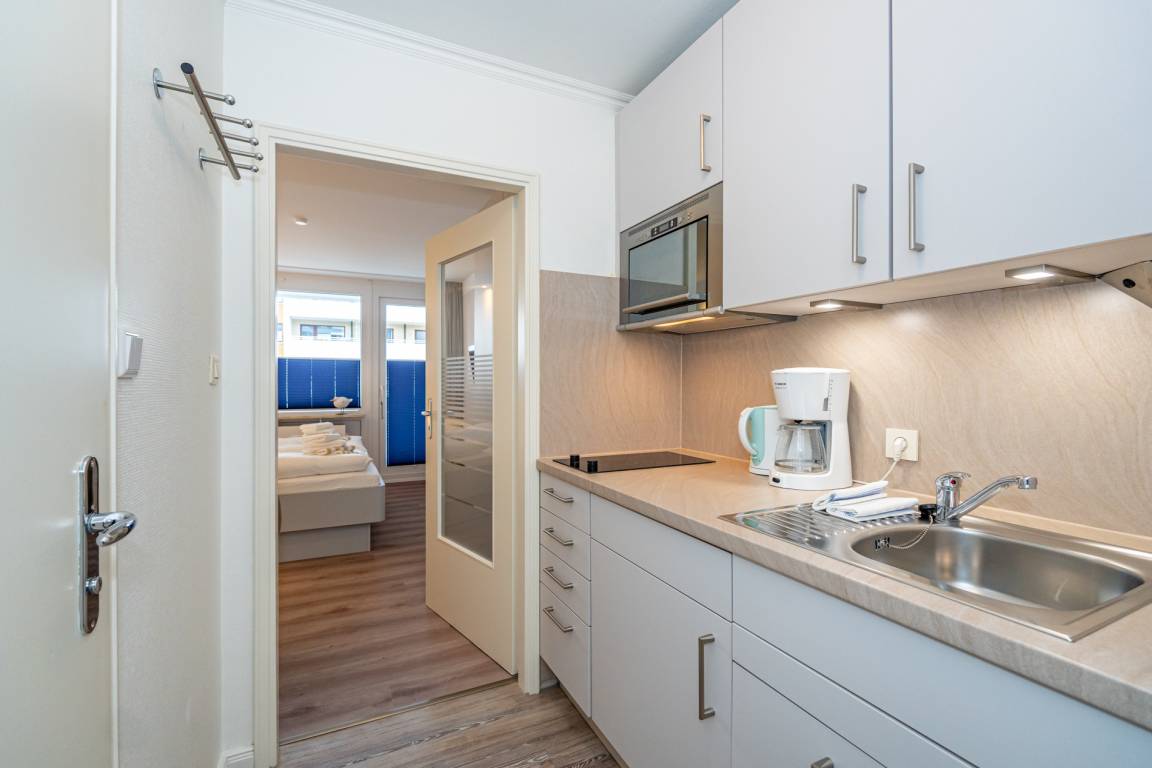 Die Küchenzeile hat ein 2-Platten-Kochfeld und einen Kühlschrank mit 3*-Gefrierfach, eine Mikrowelle und einen Geschirrspüler. Kaffeemaschine, Wasserkocher und Toaster gehören zur Grundausstattung.