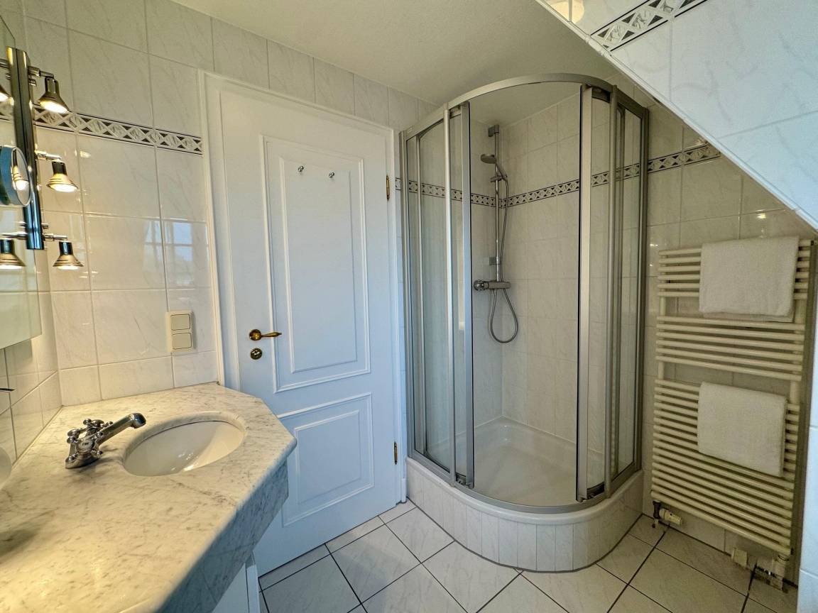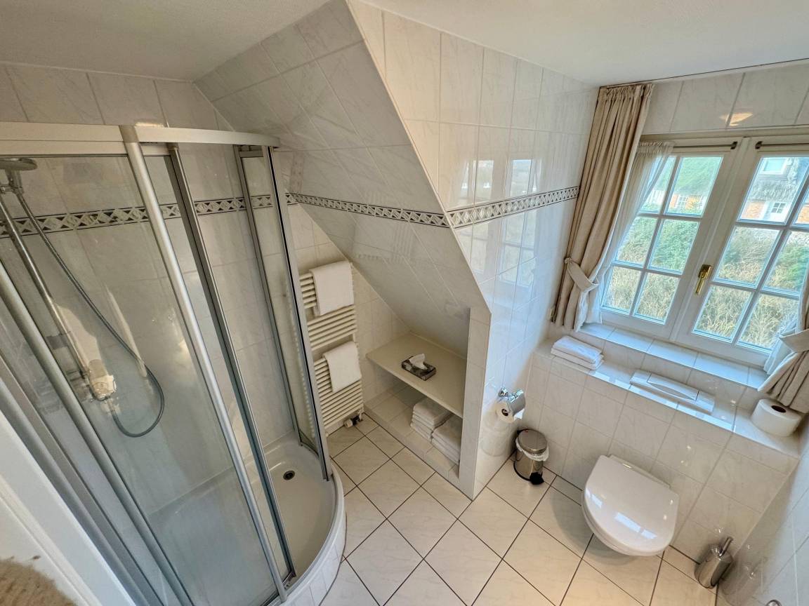 Das Badezimmer im Obergeschoss mit Nordseeblick ist mit Marmorwaschtisch, Dusche, Föhn, Handtuchtrockner und Toilette ausgestattet.