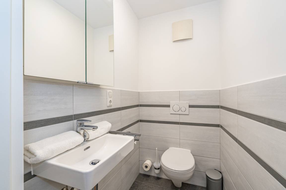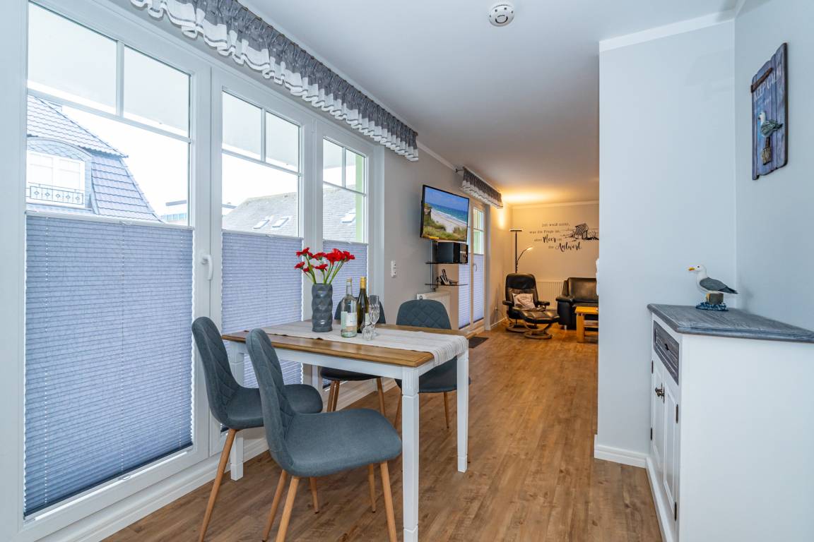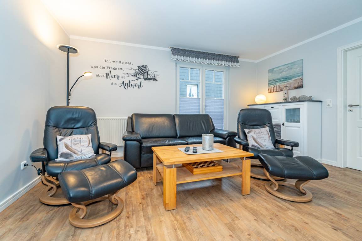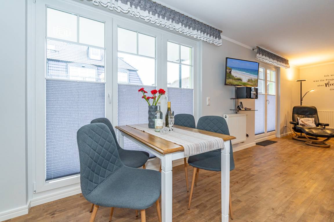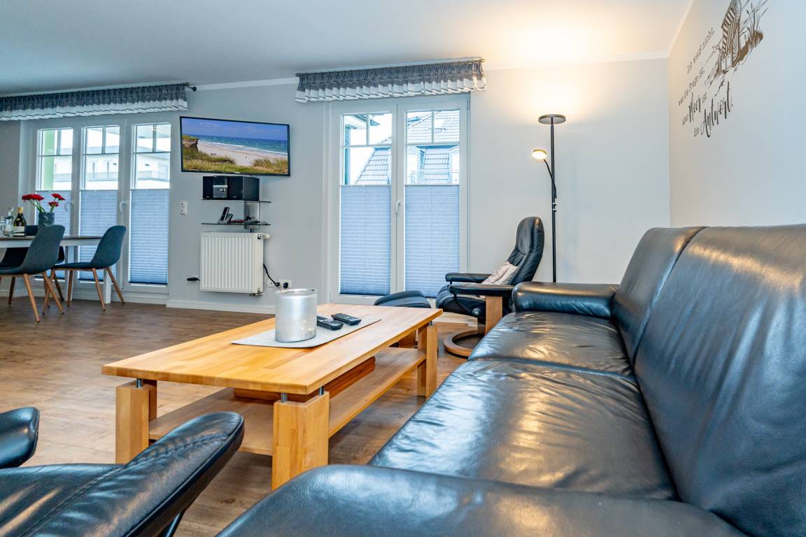 Vom einladenden Vorflur mit Garderobe gelangen Sie direkt in das helle Wohnzimmer mit Zugang zur Terrasse, in die separate Küche sowie in das praktische Gäste-WC. Der Wohnbereich ist mit einem modernen Designerboden in Holzoptik, einer hochwertigen Sitzgarnitur (2-Sitzer-Couch und Sessel), einem Essplatz sowie einem großen Kabel-Flachbild-TV (4K Ultra HD, Streaming-Dienste, Sprachsteuerung) und einem Radio ausgestattet – der perfekte Raum zum Entspannen.