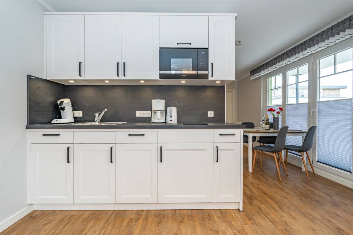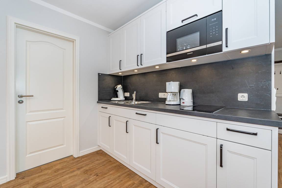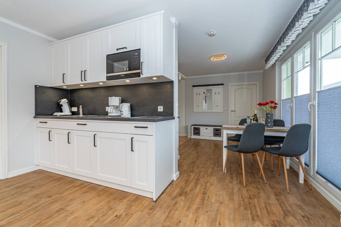 Die separate, neuwertige Küche ist bestens ausgestattet: Geschirrspüler, Cerankochfeld (4 Kochfelder), Mikrowelle und ein Kühlschrank mit 3*-Gefrierfach stehen zur Verfügung. Kaffeemaschine, Wasserkocher und Toaster gehören selbstverständlich zur Grundausstattung.