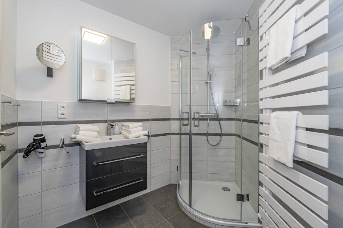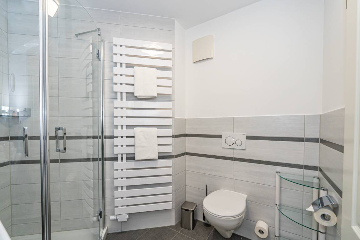 Vom Wohnzimmer aus betreten Sie das Schlafzimmer mit einem Doppelbett (zwei Einzelmatratzen je 0,80 x 1,95 m). Auch hier haben Sie Zugang zur Terrasse. Das helle Duschbad ist mit WC, Fön und modernen Armaturen ausgestattet.