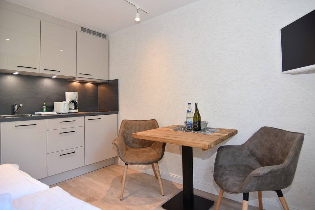 Schönes, modernes 1-Zimmer-Apartment im 1. OG mit sonnigem Westbalkon und Blick auf den Dünenkamm im Haus "Lee", ca. 25 m², Nichtraucher. Wohn-/Schlafzimmer mit festem Doppelbett (140x200), Einbauschränken und integrierter, kleiner Küchenzeile, Essplatz für 2 Personen, Einbauschrank, Duschbad/WC. Flat-TV (Radiosender integriert), W-LAN (ohne Gewähr). Tierhaltung ist nicht gestattet. Schwimmbad und finnische Sauna. Garage Nr. 11 kann kostenlos dazugebucht werden. Münzwaschmaschine und -trockner. Bettwäsche und Handtücher sind zur Anreise aufgezogen!