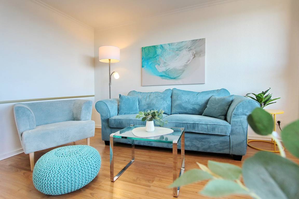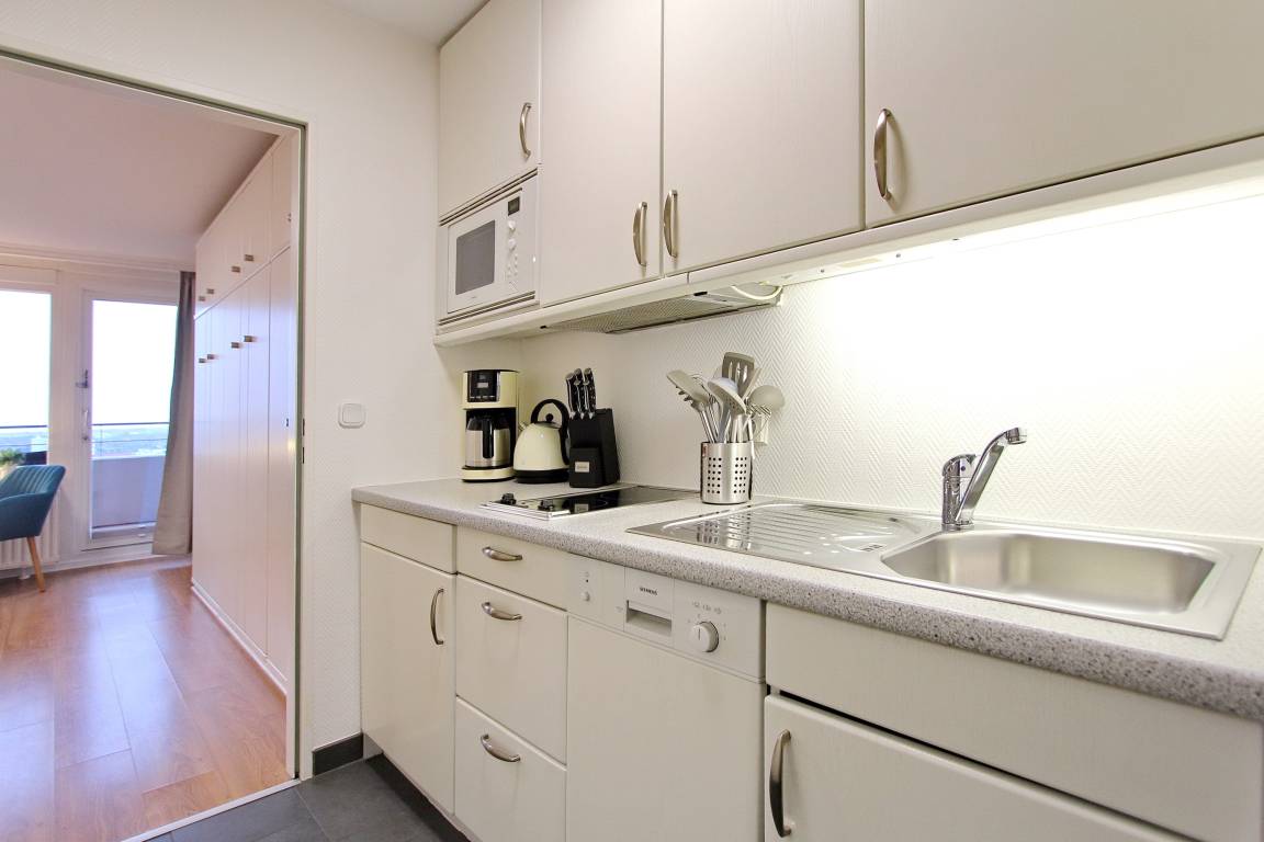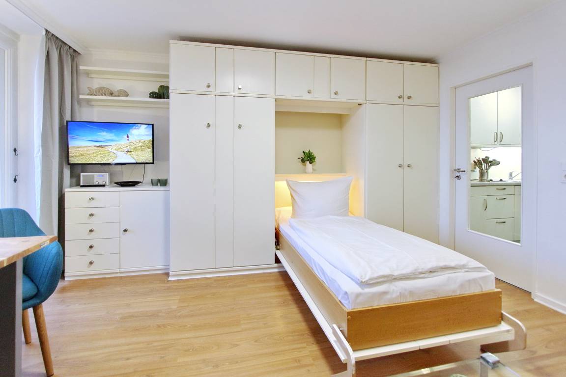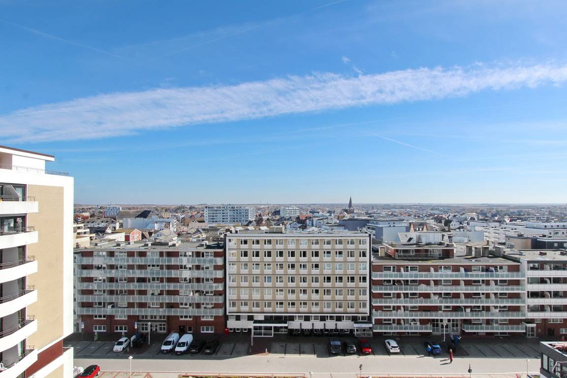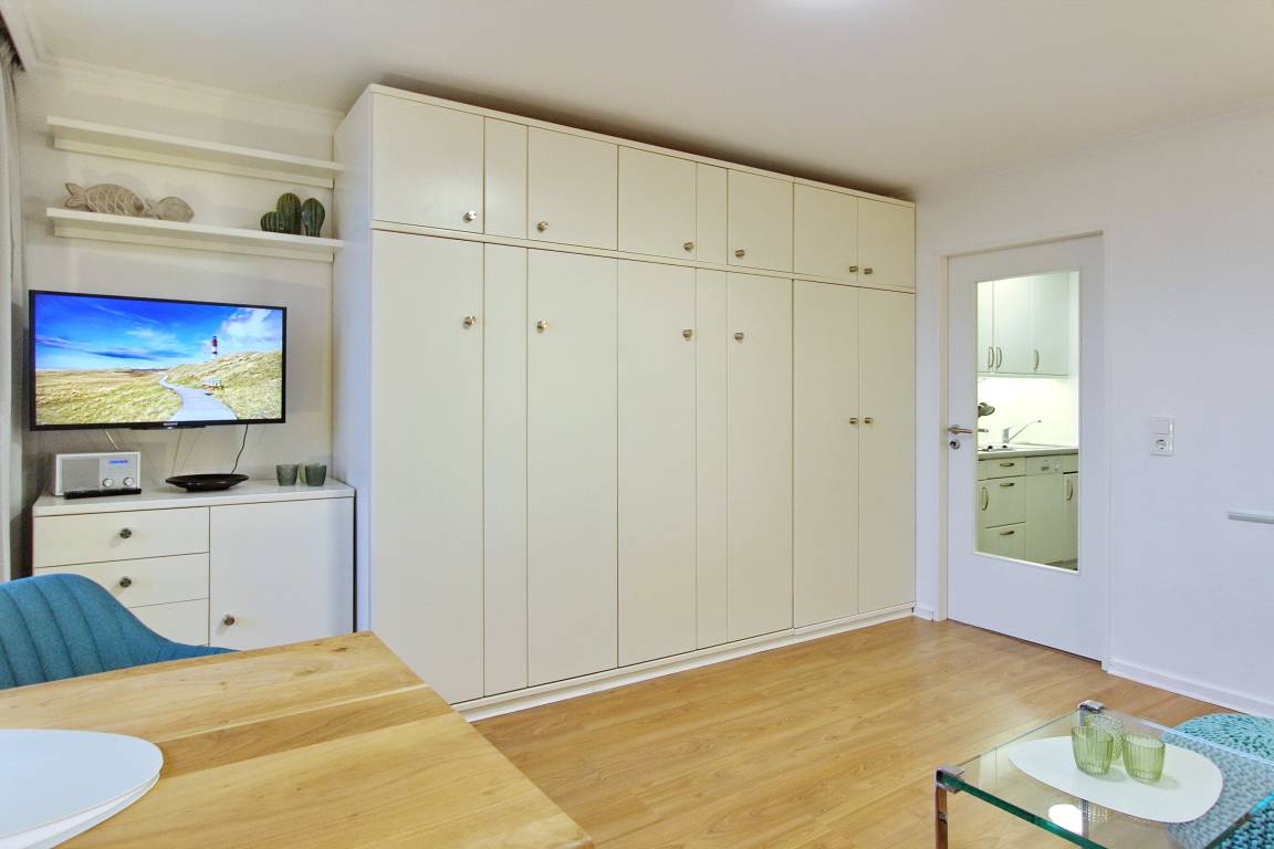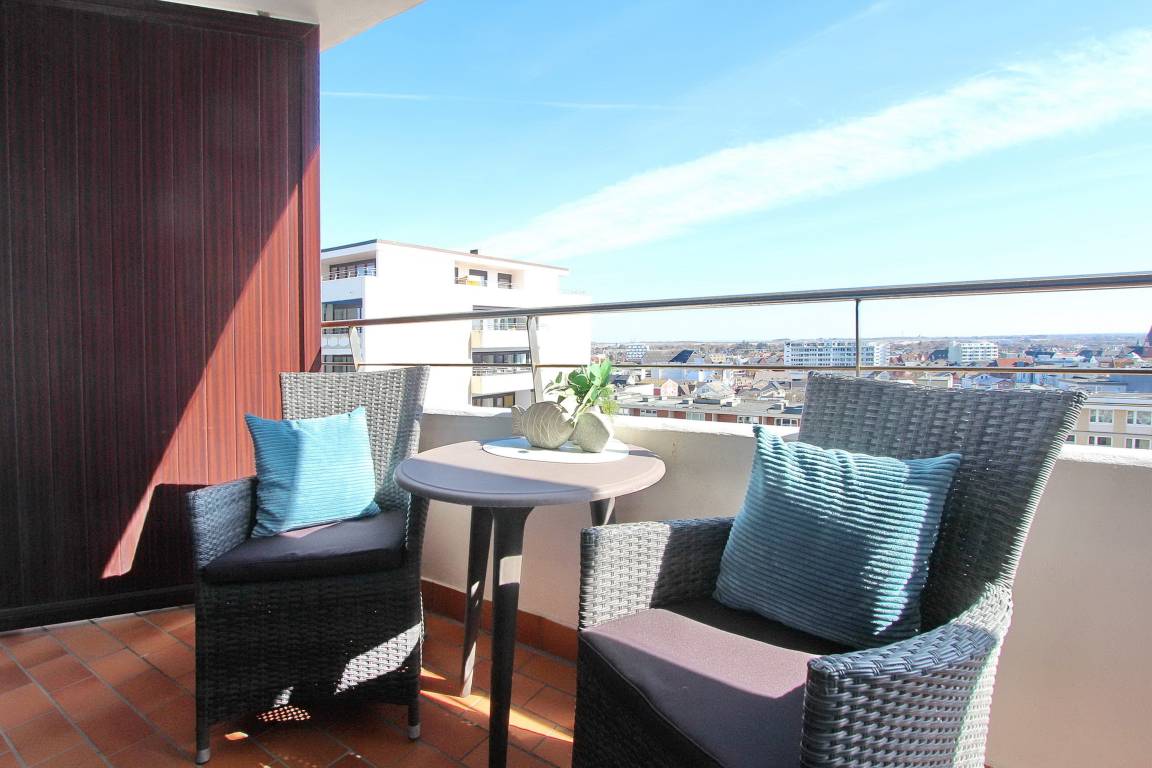 Hell und klassisch modern eingerichtete Einzimmerwohnung in der 7. Etage im Hause Metropol mit herrlichem Weitblick über die Dächer von Westerland. Vom Balkon aus können Sie das Frühstück bei aufgehender Sonne windgeschützt genießen mit Blick bis zum Wattenmeer. Der Wohn-Schlafraum ist mit zwei Schrankbetten, einer Ledercouch (WK), einem Draenert Glastisch, einem Relaxsessel und einem großzügigen hellen Tisch (USM) nebst zwei azurblauen Hansenstühlen ausgestattet. So kann die Wohnung auch für eine Büroauszeit mit Arbeitsmöglichkeit genutzt werden. Helles Laminat und Grafiken des Sylter Künstlers Sprotte runden die besondere Atmosphäre ab. Das neue moderne Badezimmer verfügt über eine große Dusche mit flachem Einstieg, einen Fön und Handtuchtrockner. Ausreichend Ablage- und Stauraum für Ihre persönlichen Dinge ist vorhanden. Um sich selbst zu verpflegen gibt es im Flur eine kleine Küchenzeile mit Cerankochfeld (2 Herdplatten), eine Mikrowelle, zusätzliche Nespressomaschine und Geschirrspüler. Zur technischen Ausstattung dieser Wohnung gehört: ein Flachbildfernseher von Sony und eine Stereoanlage mit CD Spieler. Ein freies WLAN Netzwerk (WEG Haus Metropol - Passwortfrei - ohne Gewähr) steht ihnen kostenfrei zur Verfügung. Haustiere sind ausdrücklich Willkommen. Wohnungsgröße: ca. 30 m².