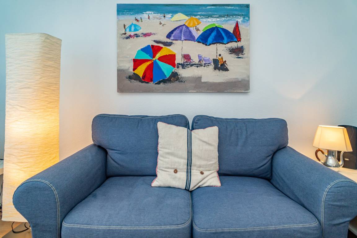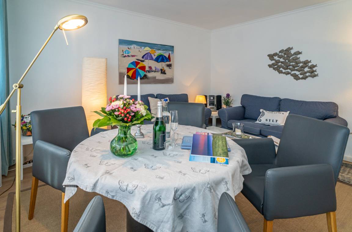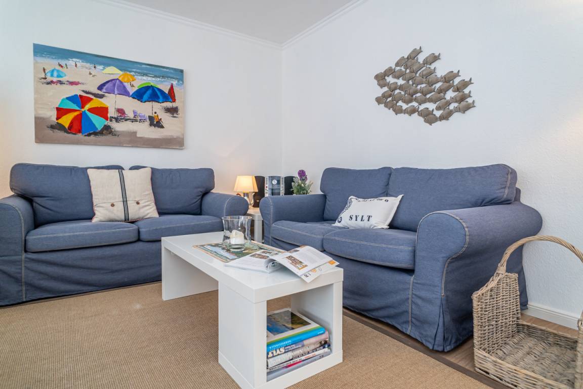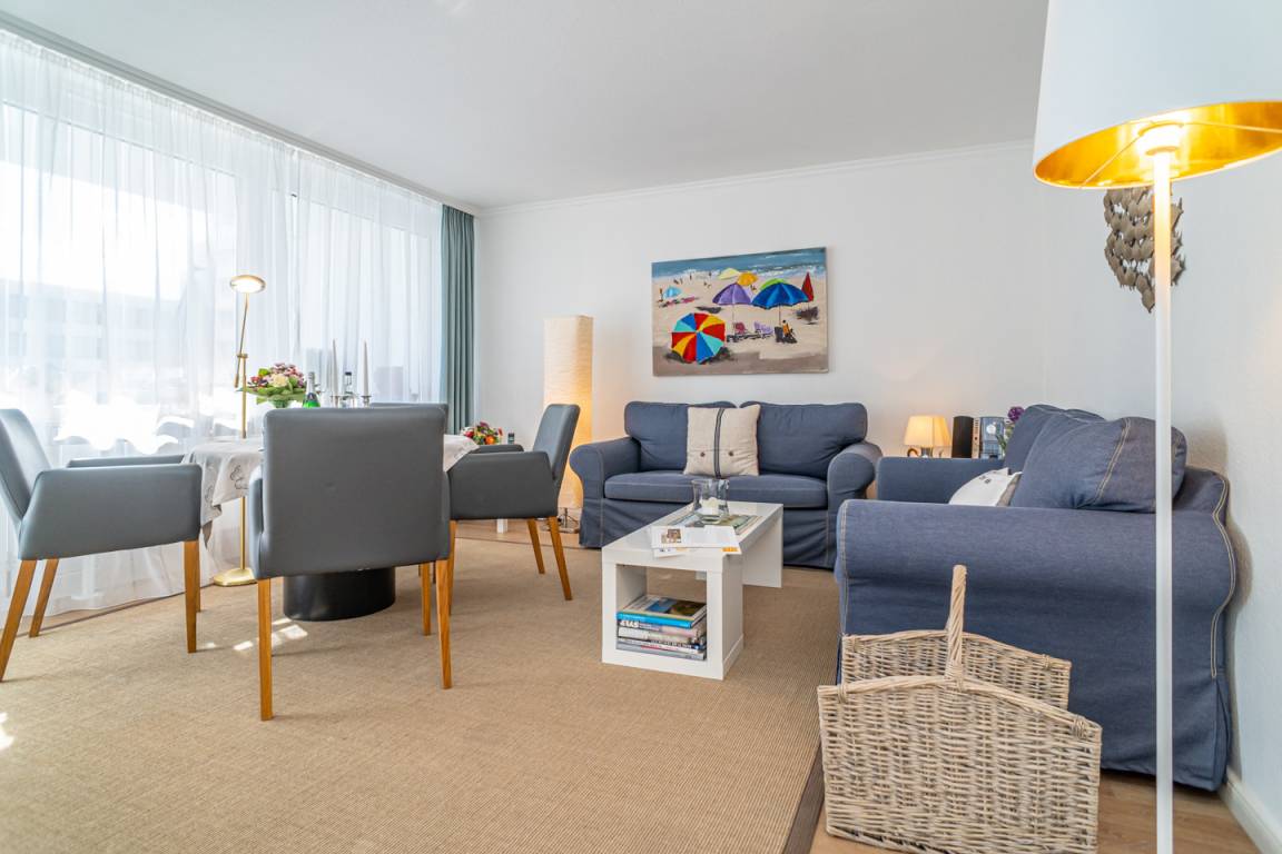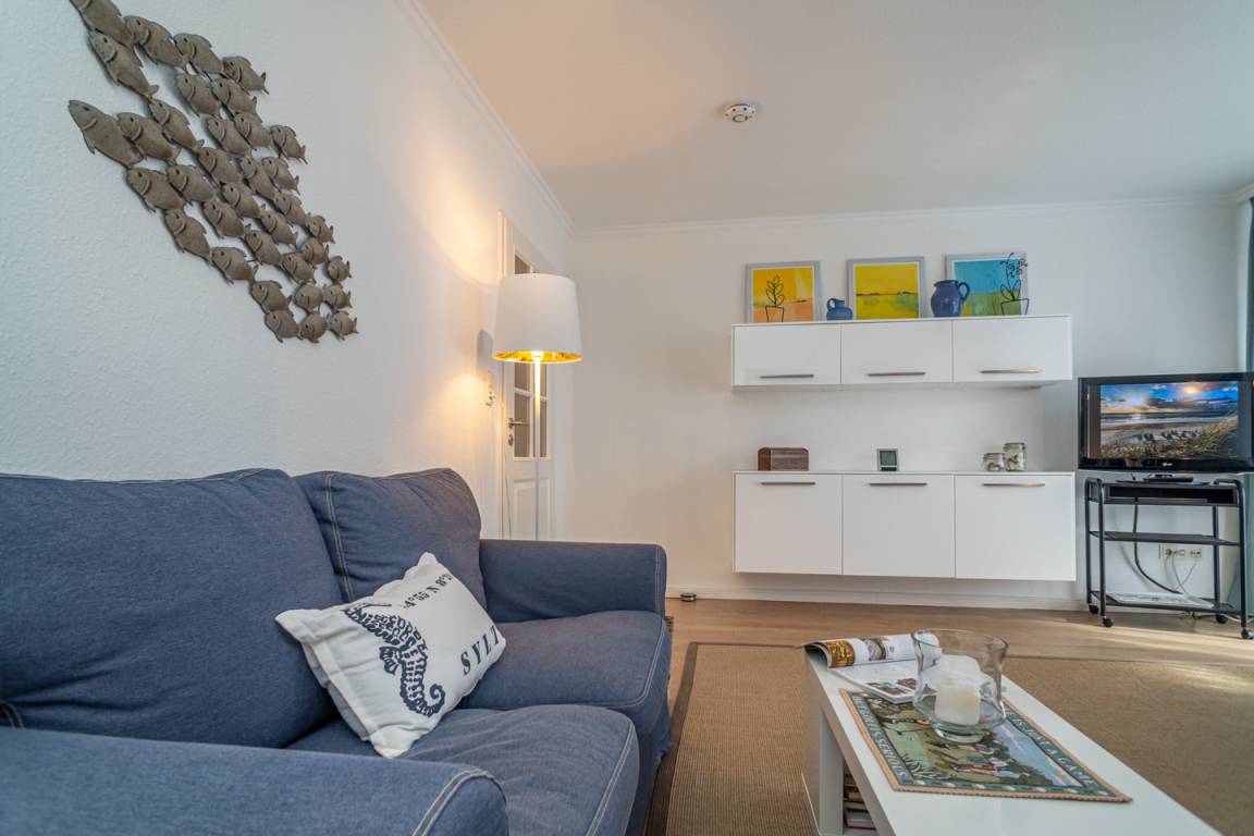 Der Wohnraum besteht aus einer Sitzgarnitur (2 x 2-Sitzer-Couch), einem Essplatz, Kabel-Flachbild-TV, Radio/CD.