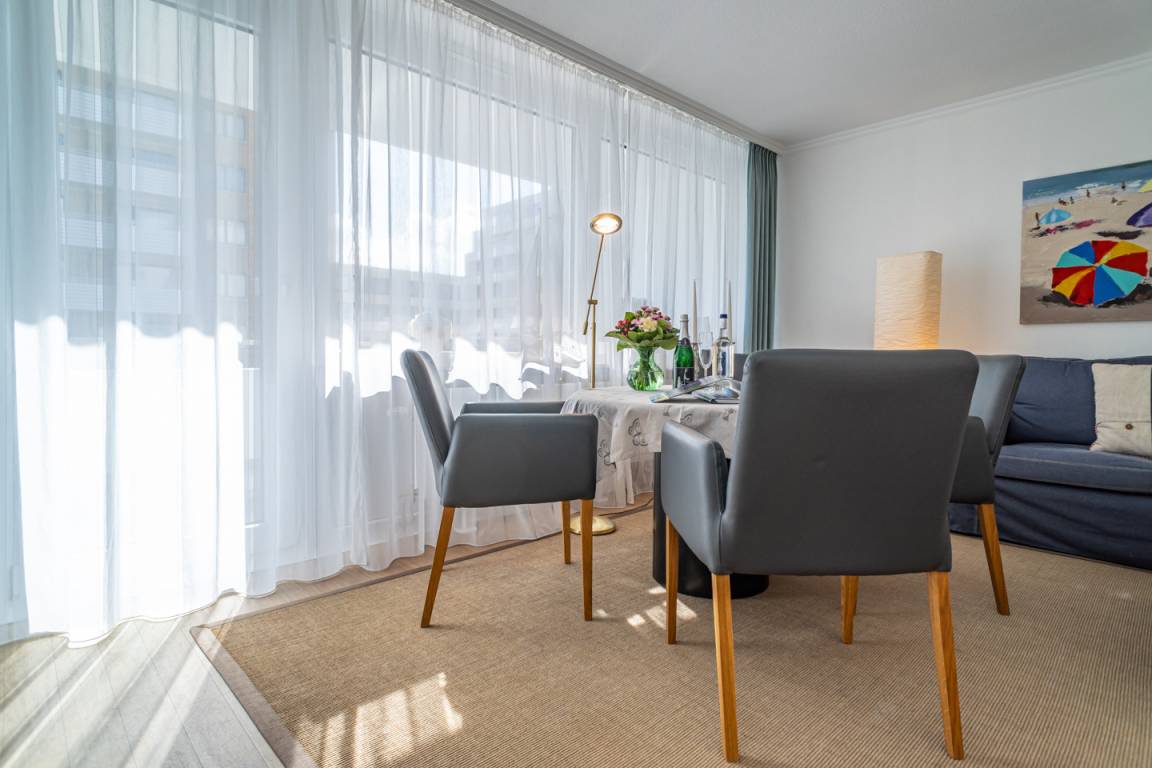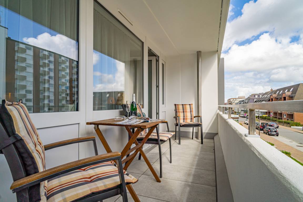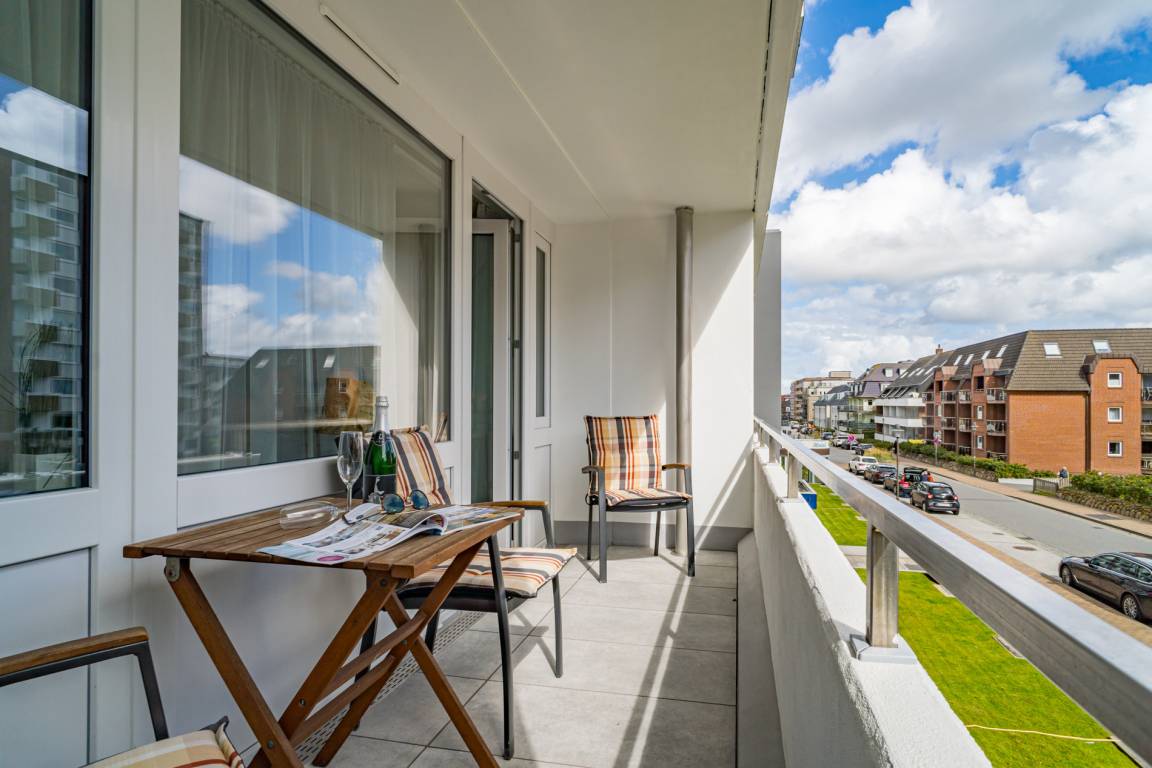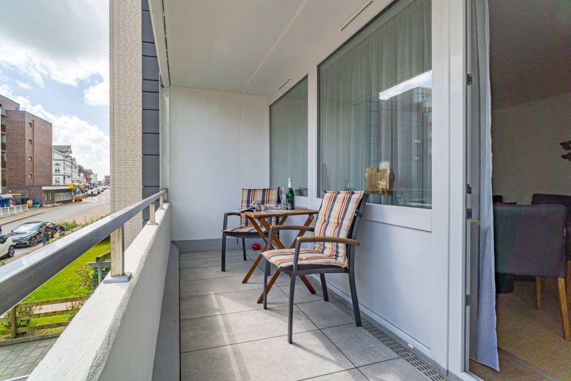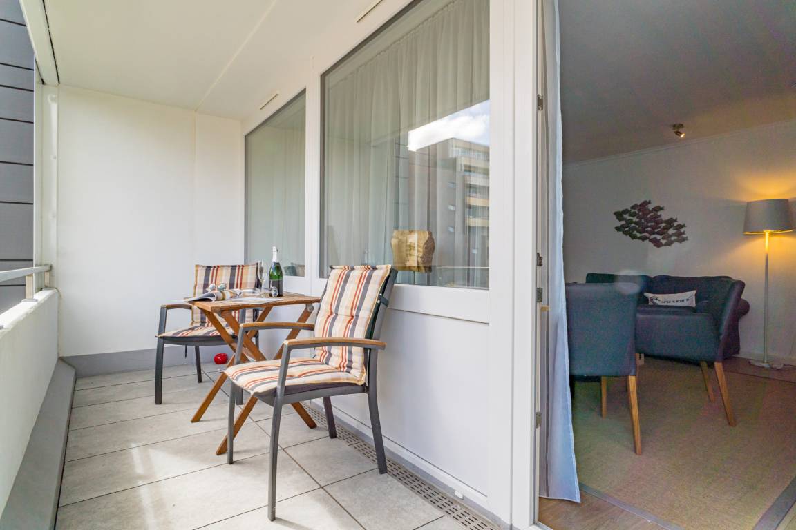 3-Zimmer-Nichtraucher-Ferienwohnung (ca. 63 qm) in der 1. Etage zur Landseite mit Ostloggia (Morgensonne, mit Balkonmöbeln und Auflagen) für max. 3 Personen.