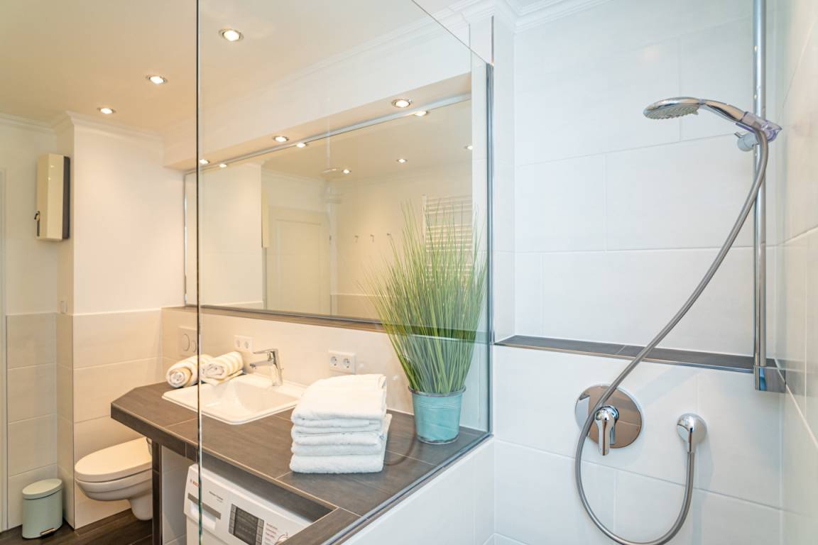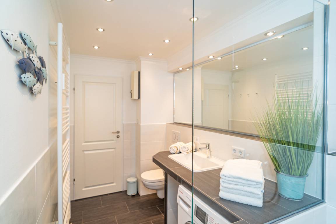 Das großzügige Duschbad/WC hat ein Fenster, einen Waschtisch, einen Handtuchtrockner, ein Fön und ein Waschmaschinen/Trockner-Kombigerät.