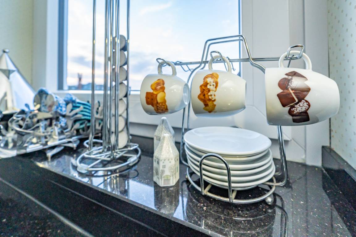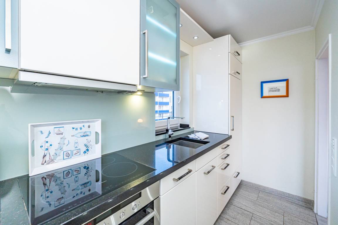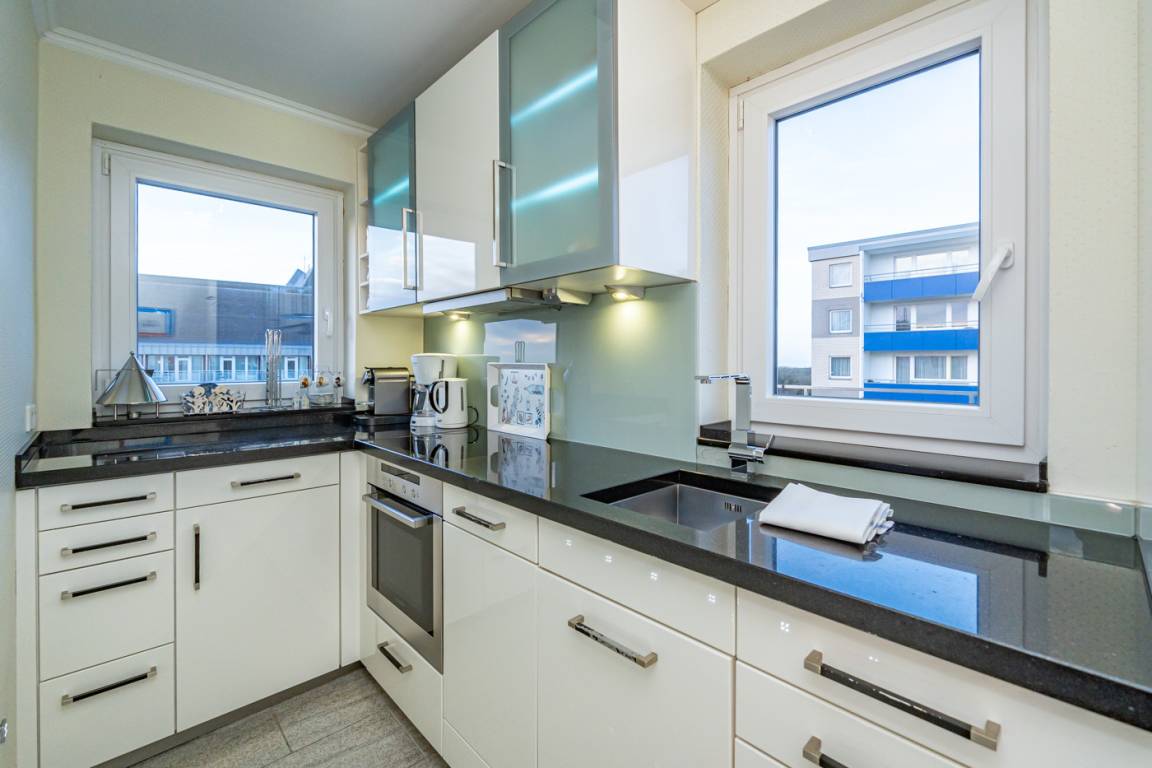 Die vom Wohnraum begehbare exklusive, neue Küche mit zwei Fenstern und Granitarbeitsplatte besteht aus Geschirrspüler, Induktionskochfeld (4 Kochfelder), Backofen mit Mikrowellenfunktion und einem Kühlschrank mit 4-Sterne-Gefrierfach.