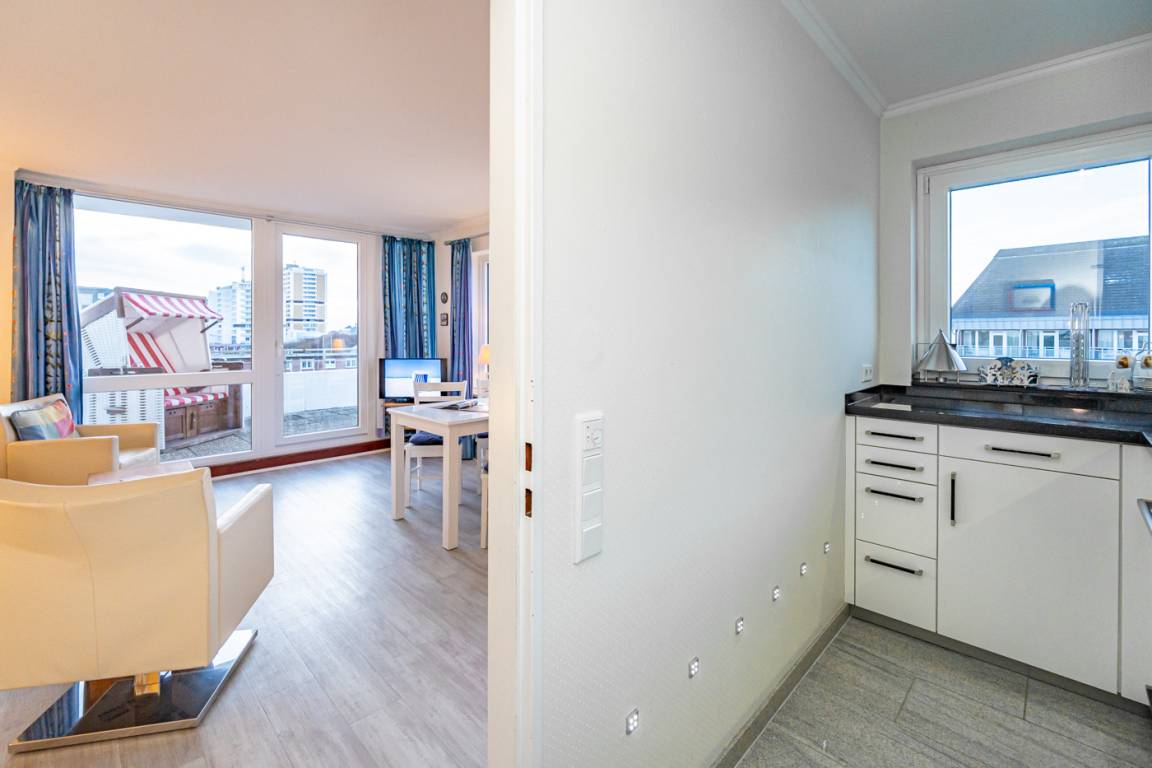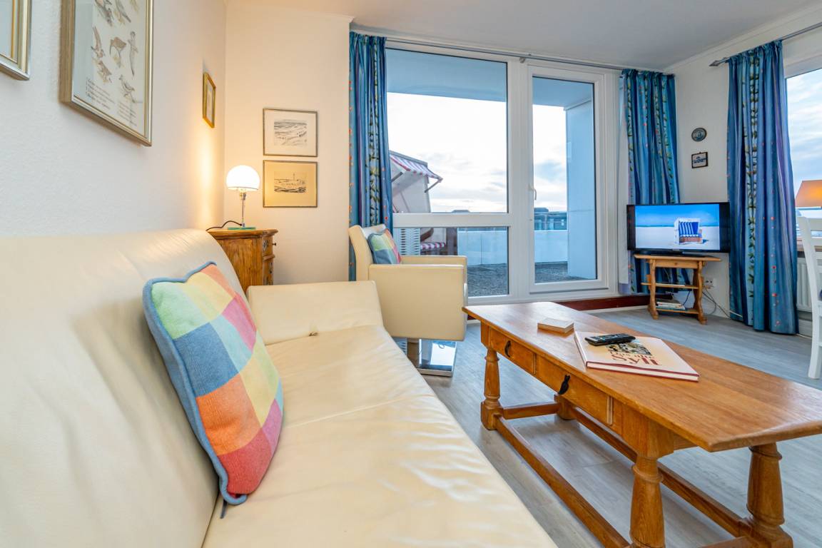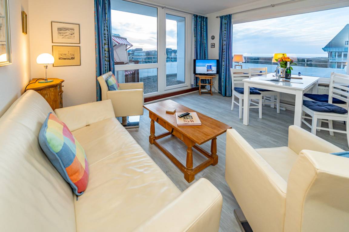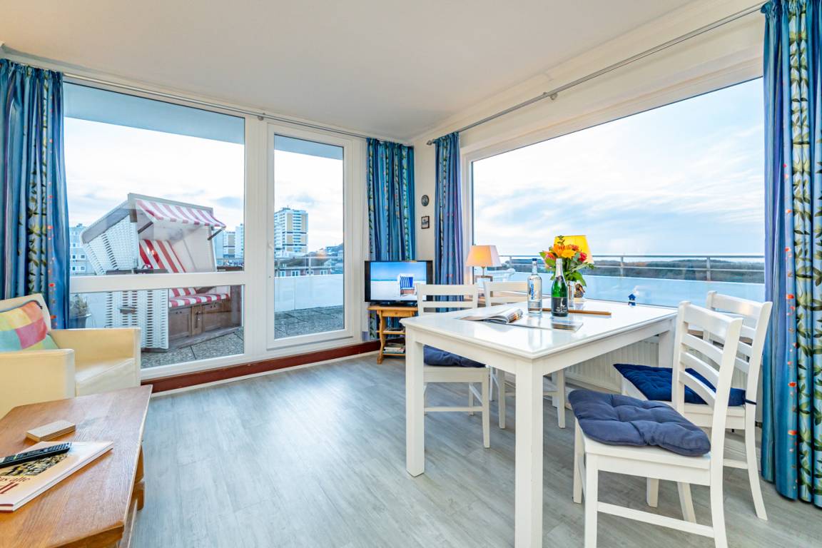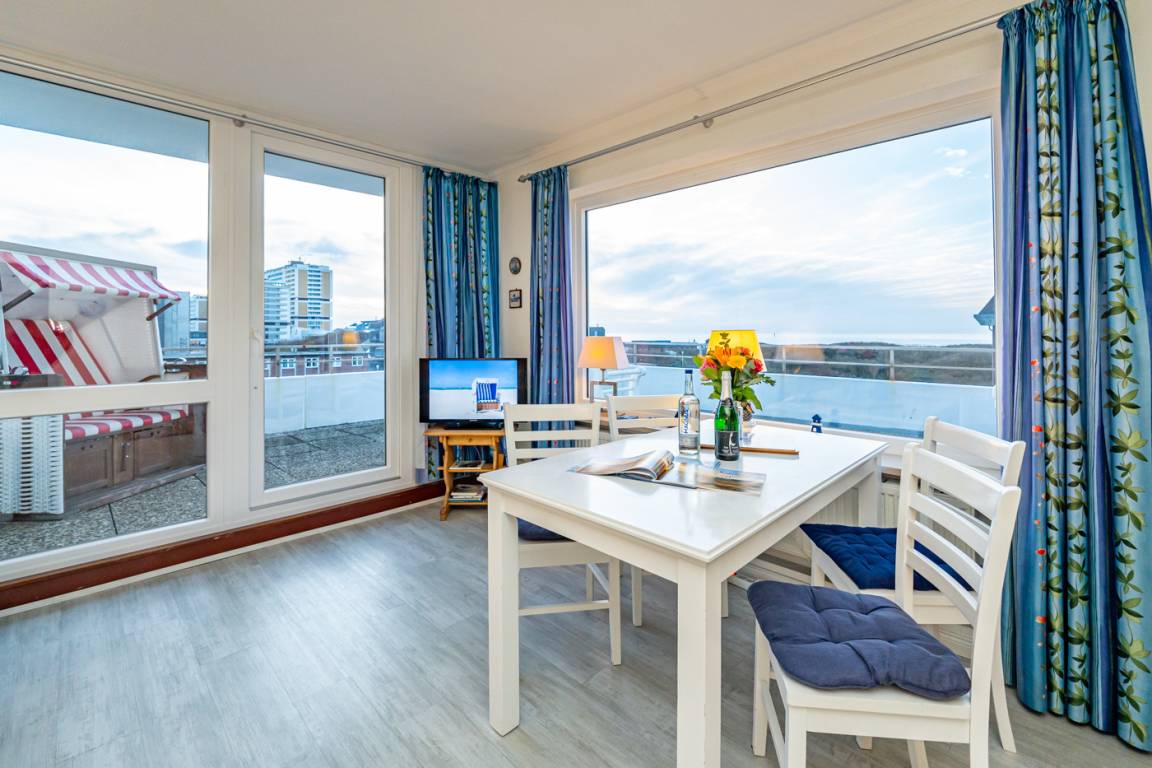 Dieses komfortable Penthouse mit grandiosem Meerblick und großzügiger, von Süden nach Westen umlaufender Dachterrasse gehört sicherlich zu den begehrtesten Ferienwohnungen in Westerland.