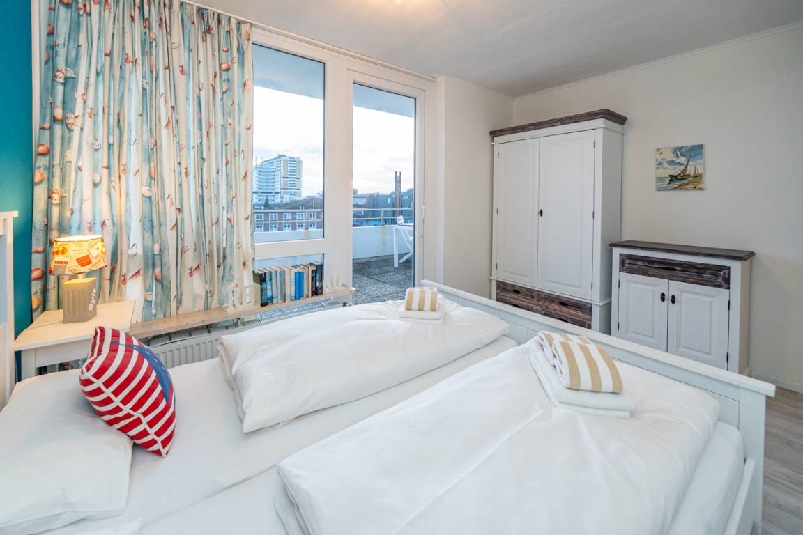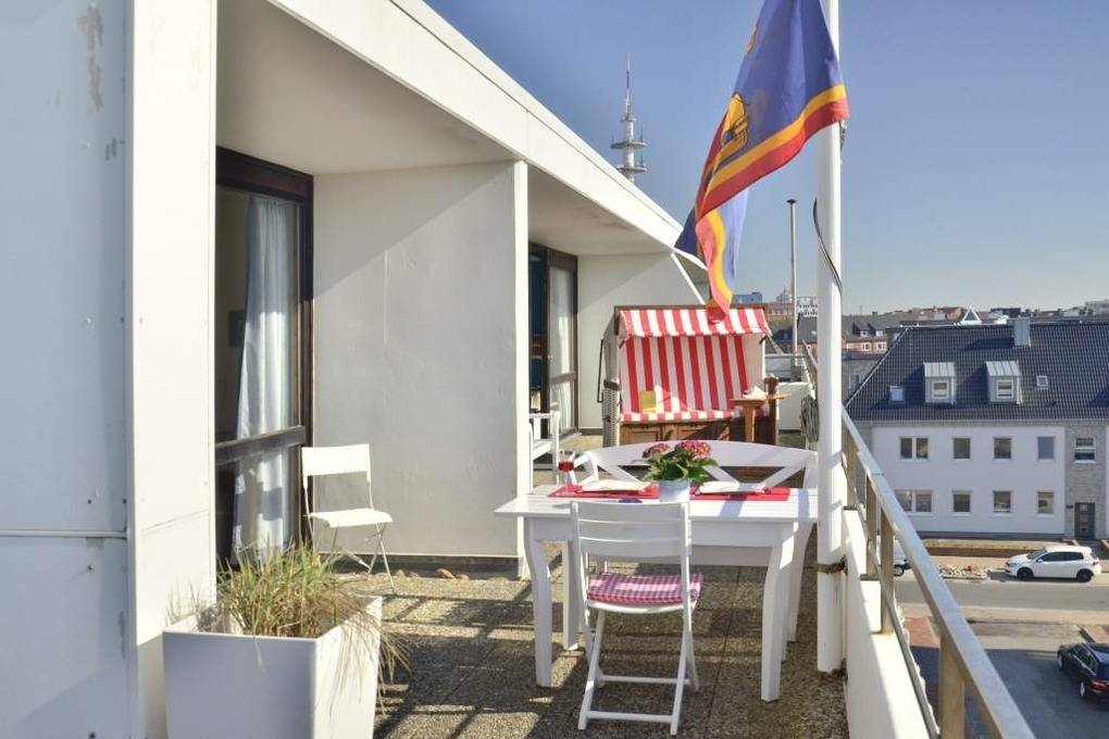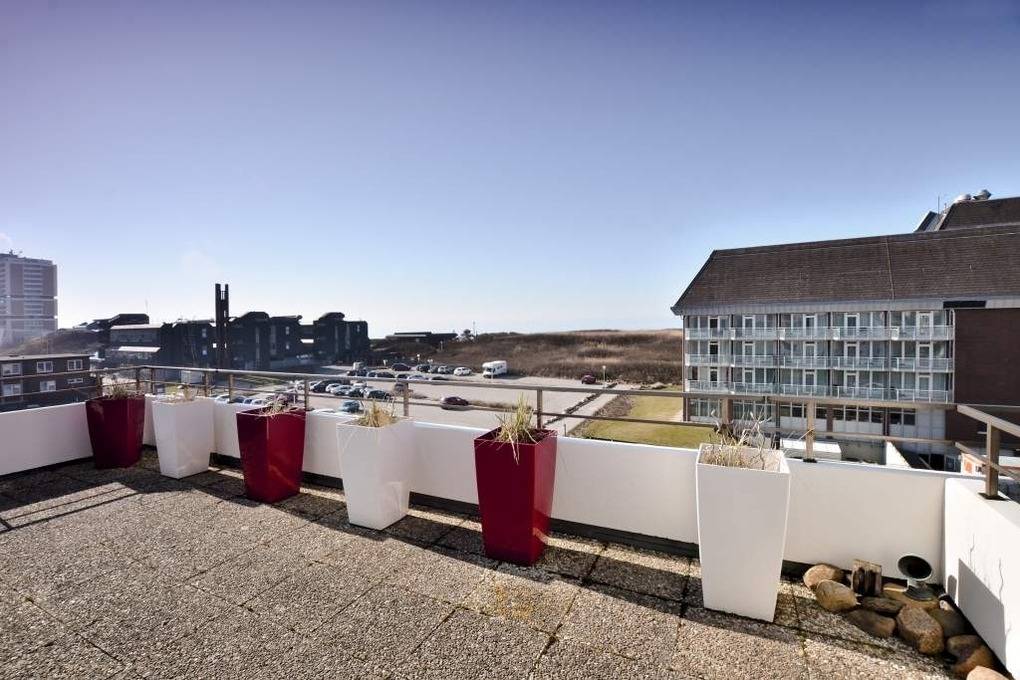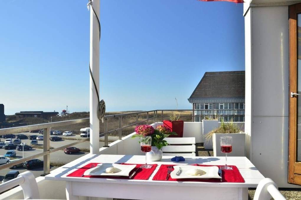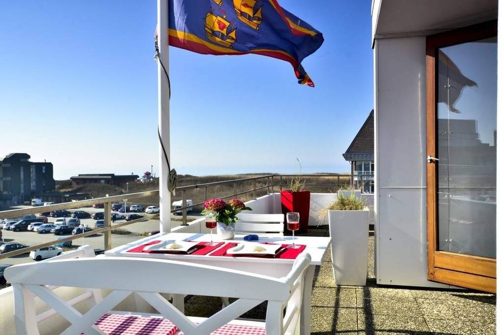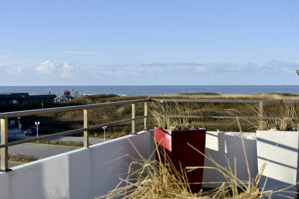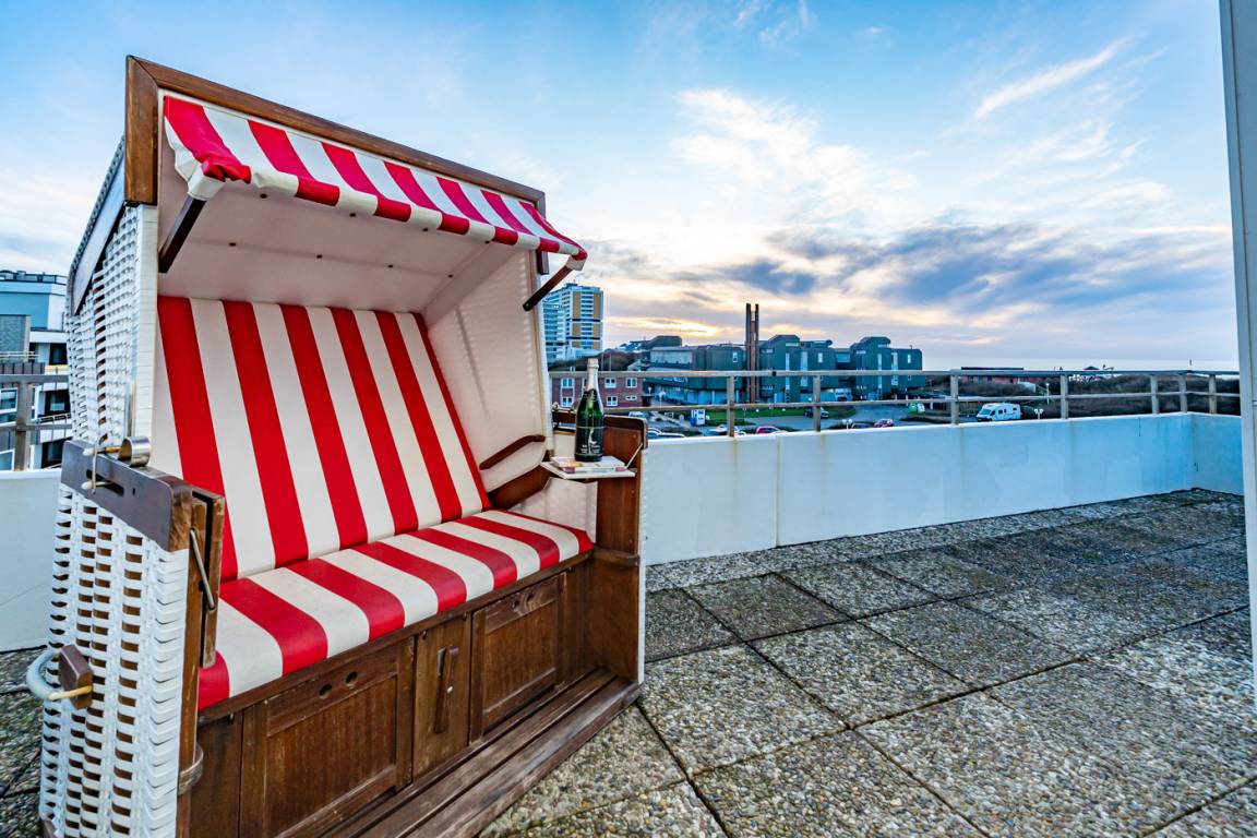 Es besteht aus 3 Zimmern für max. 3-4 Personen und hat eine Wohnfläche von ca. 75 m² im Staffelgeschoss des Hauses (wie 4. Etage). Die großzügige, umlaufende Dachterrasse mit Strandkorb (für 2 Personen) und Terrassenmöbeln bietet nahezu aus jeder Perspektive einen herrlichen Blick auf die Nordsee und die Dünen.