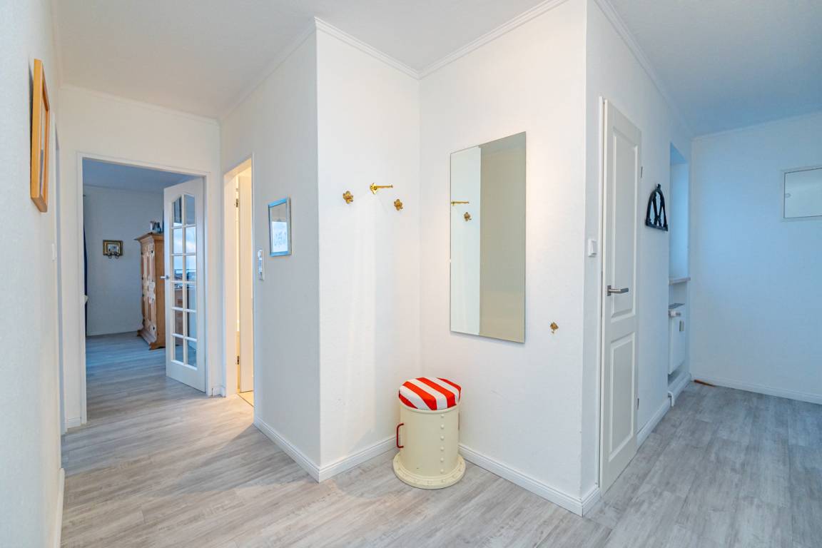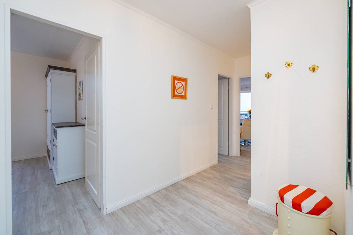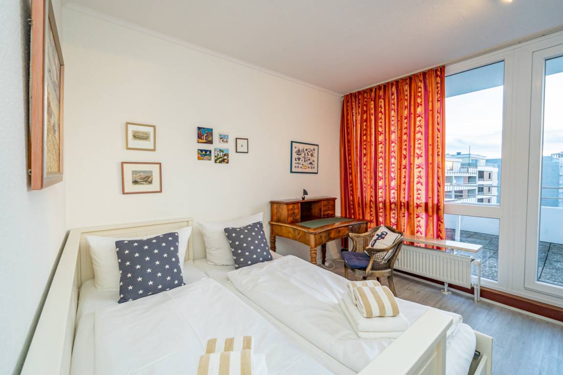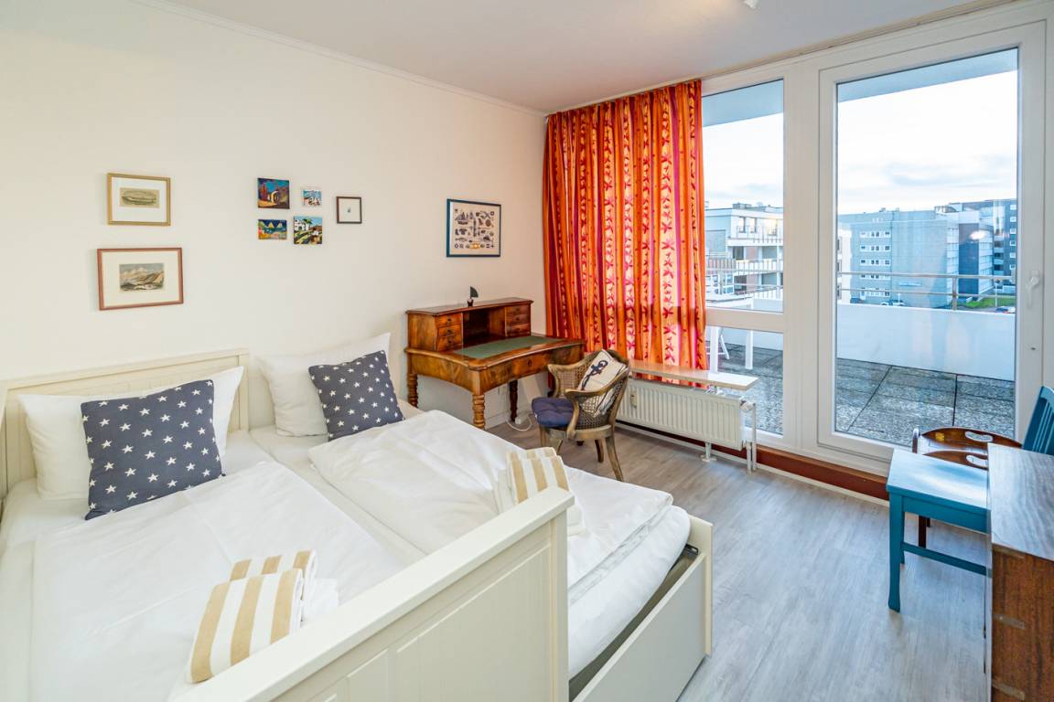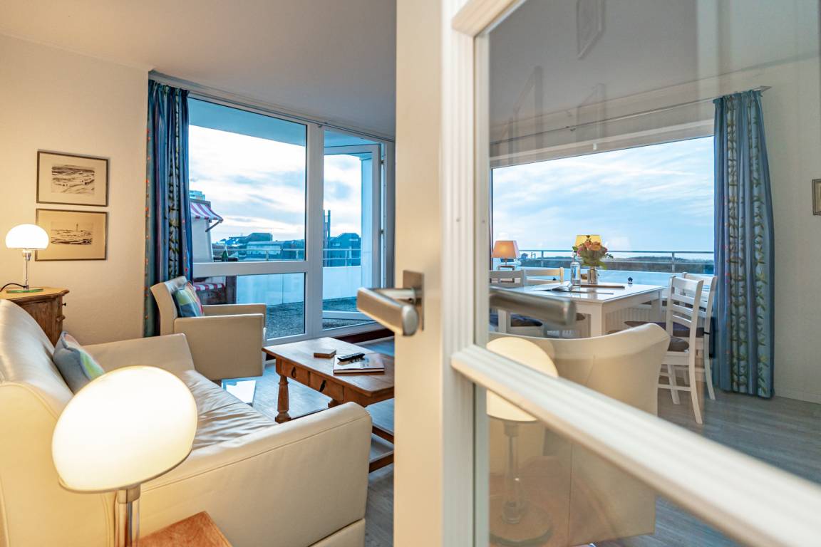 Es besteht aus 3 Zimmern für max. 3-4 Personen und hat eine Wohnfläche von ca. 75 m² im Staffelgeschoss des Hauses (wie 4. Etage). Die großzügige, umlaufende Dachterrasse mit Strandkorb (für 2 Personen) und Terrassenmöbeln bietet nahezu aus jeder Perspektive einen herrlichen Blick auf die Nordsee und die Dünen.