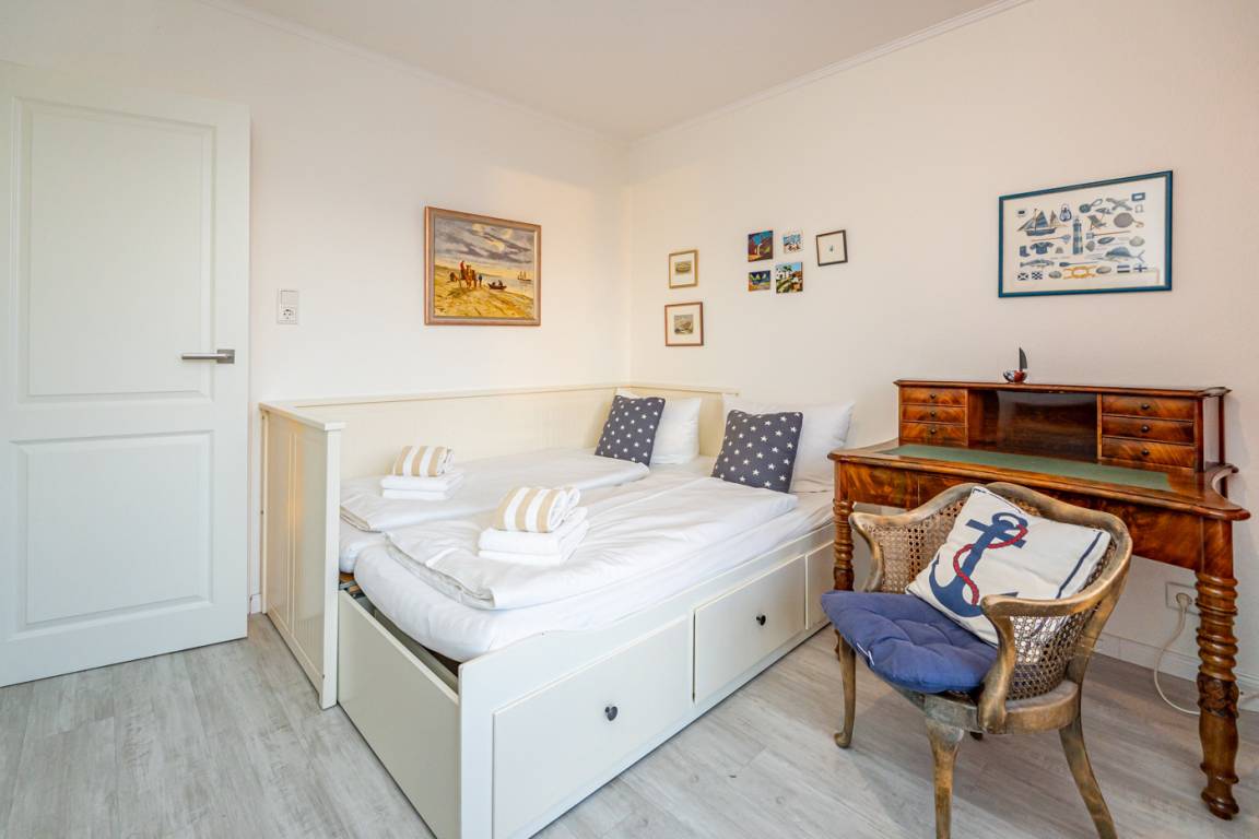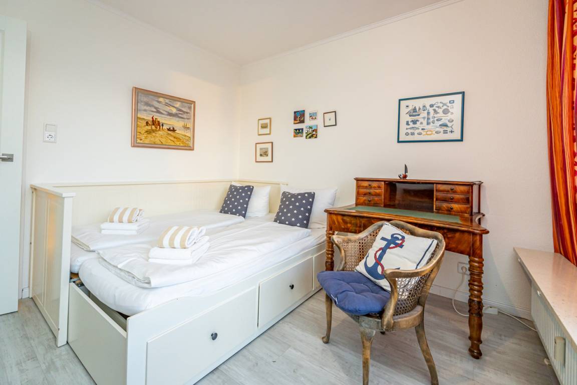 Lese- bzw. Spielzimmer hat neben einem Sekretär und Kommode ein Einzelbett[nbsp][nbsp](Liegefläche 0,80 x 2,00 m), dass sich (durch Auszug einer Schublade) zu einem Doppelbett umbauen lässt (neue Liegefläche dann 1,60 x 2 m). Auch von diesem Zimmer hat man Zugang zur Dachterrasse.