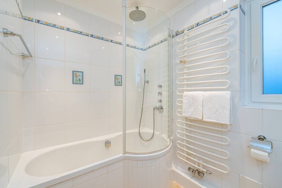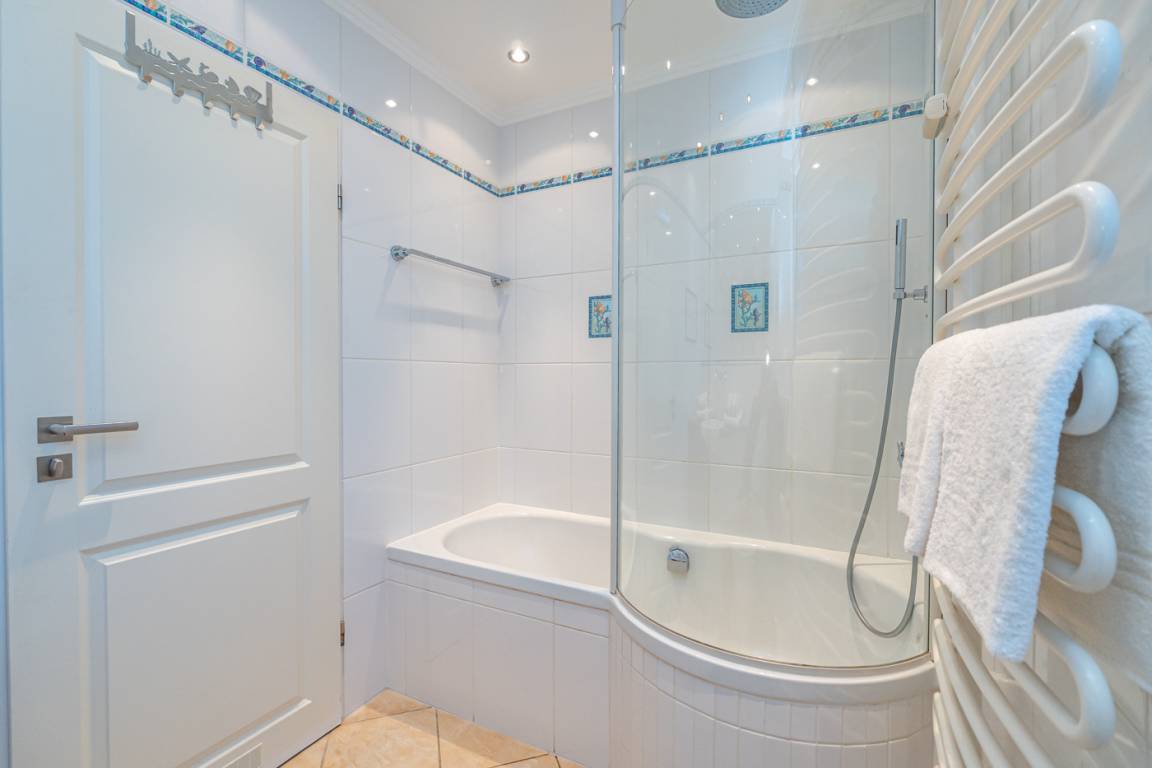 Im neuwertigen Badezimmer mit Fenster steht eine Badewanne mit Duschmöglichkeit[nbsp][nbsp](Glasabtrennung) , Waschtisch, WC und Fön zur Verfügung.