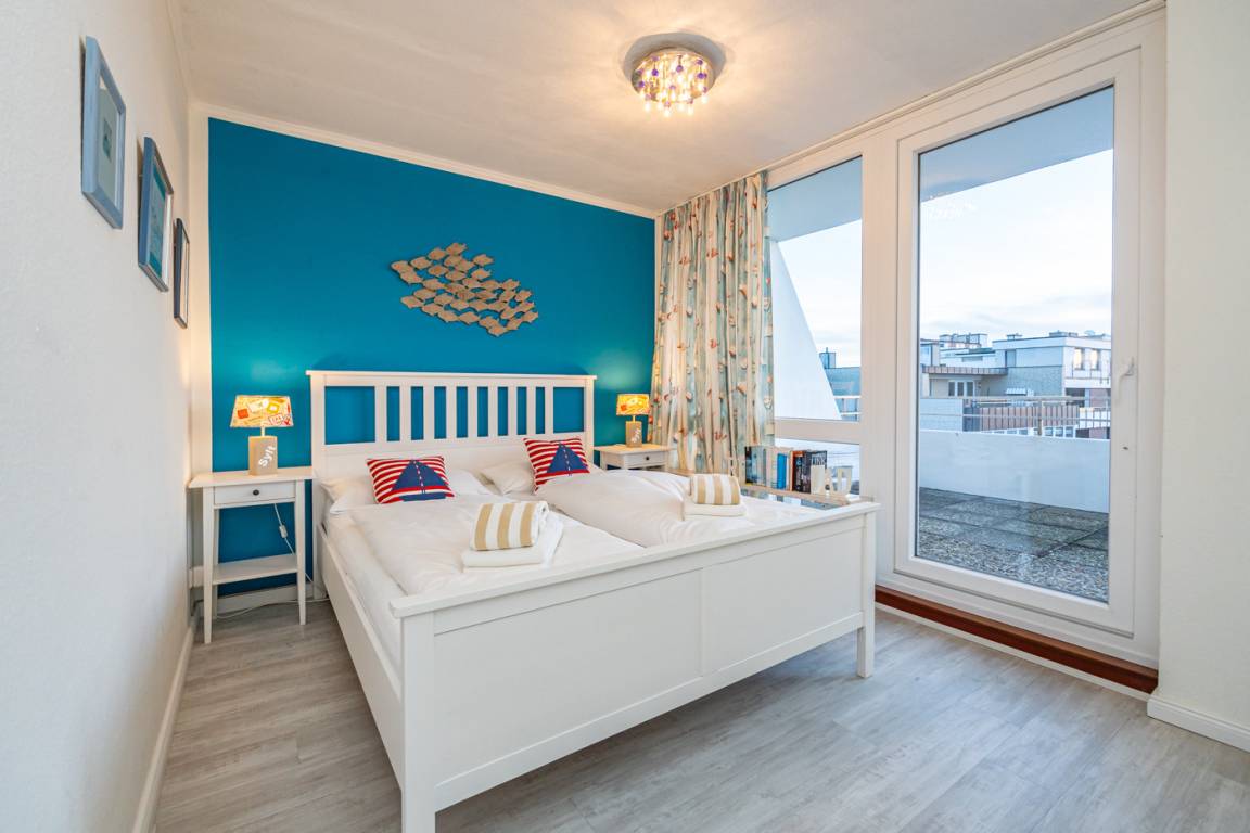 Das große Schlafzimmer ist mit einem Doppelbett (1,60 x 2,00 m) mit guten Einzelmatratzen und Zugang zur Dachterrasse ausgestattet. Das