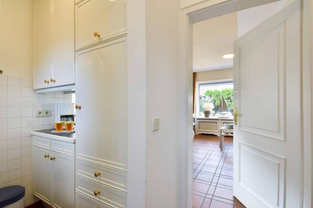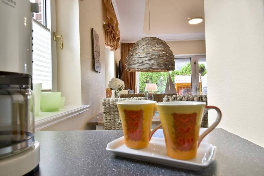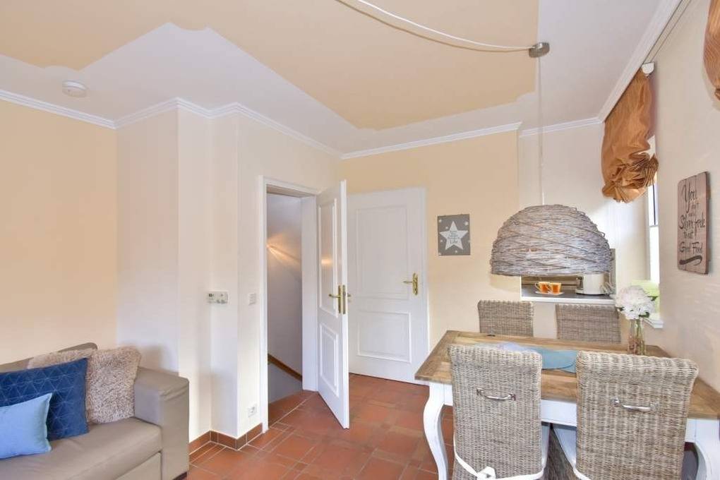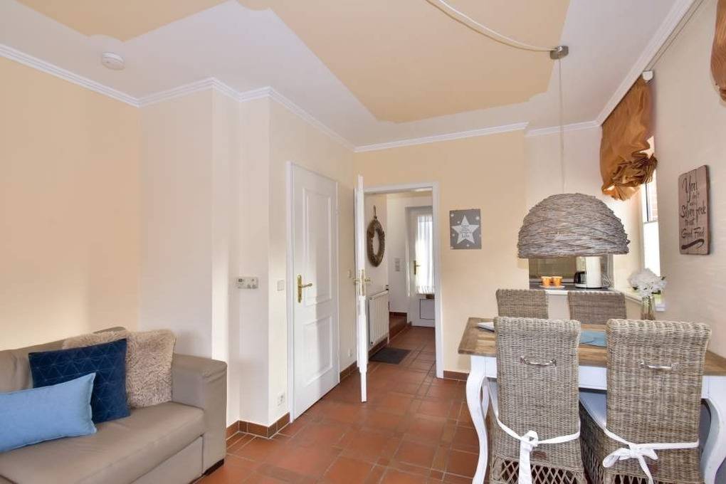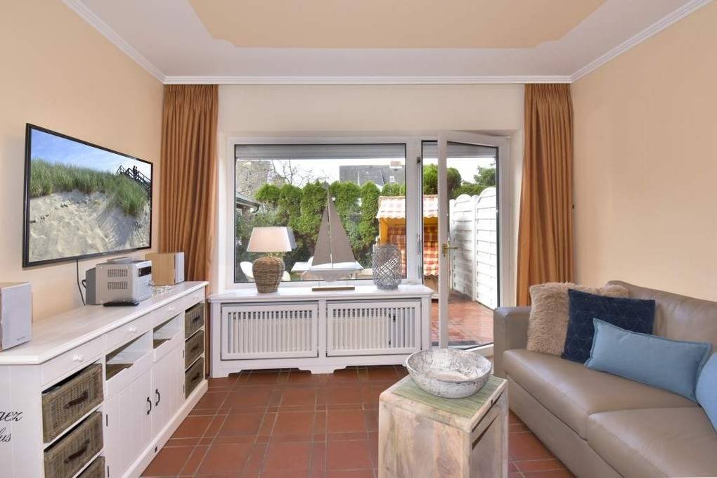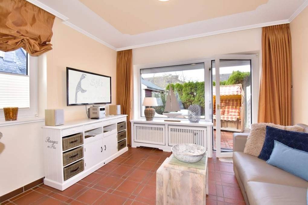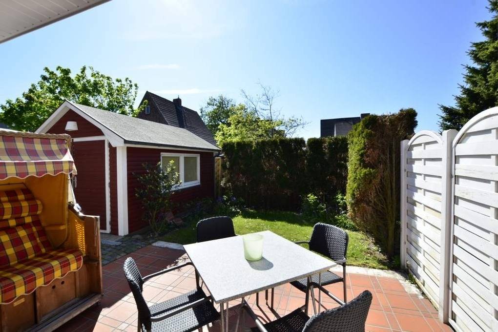 Vom Wohnzimmer betritt man die nach Westen ausgerichtete Sonnenterrasse mit eigenem Strandkorb und Gartenmöbeln.