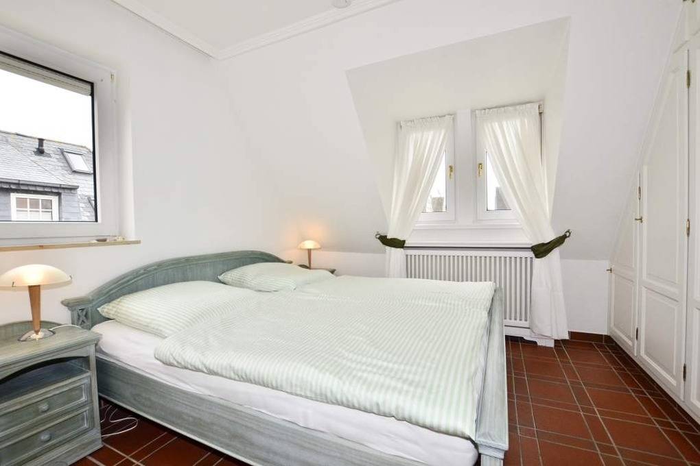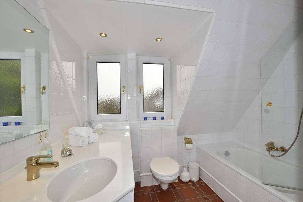 Im 1. Obergeschoss befindet sich ein Doppelschlafzimmer und ein Wannenbad. Das Schafzimmer hat ein Doppelbett (Maß: 0,90 m x 2,00 m, mit Einzelmatratzen) und Kleiderschrank.