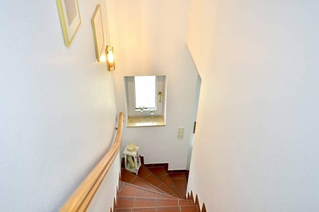 Im Erdgeschoss gelangt man von der Diele in das gemütliche Wohnzimmer und in die Küche mit Durchreiche zum Esstisch.
