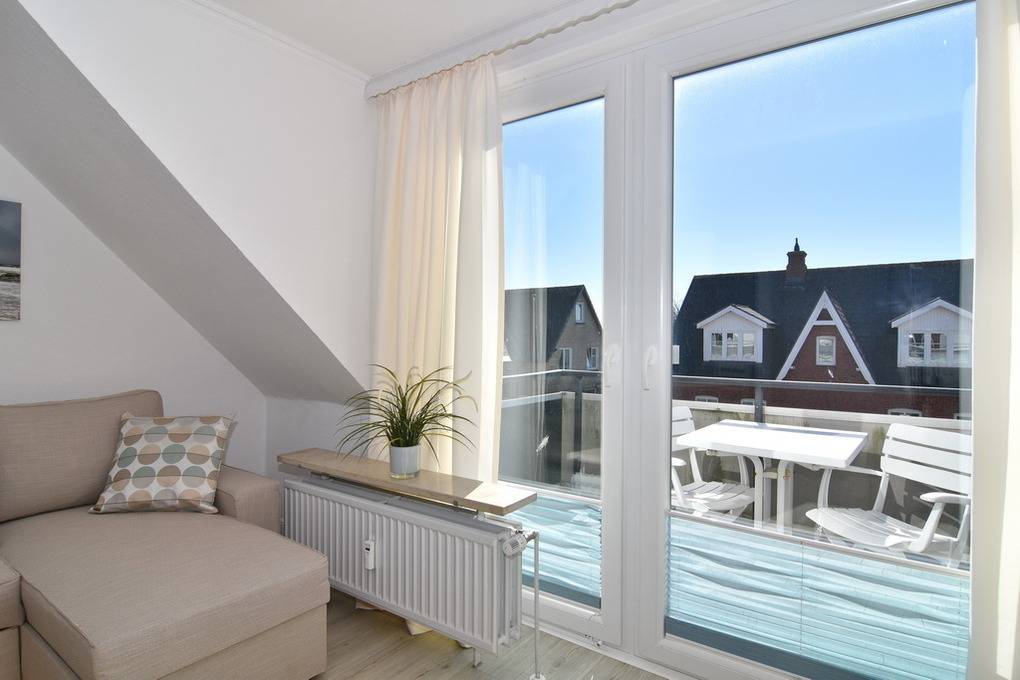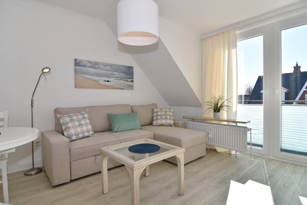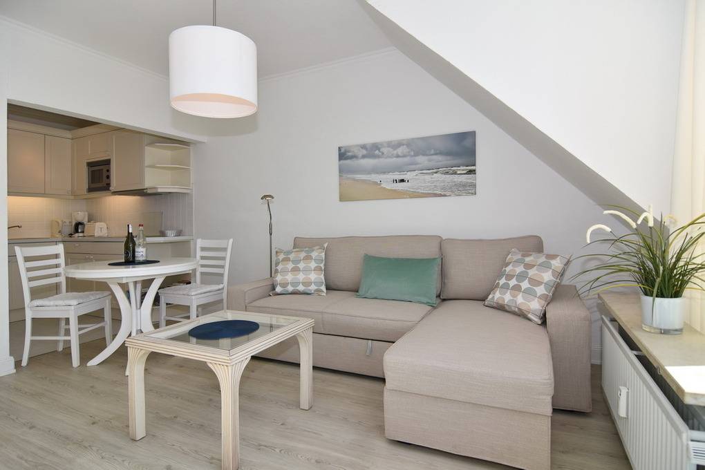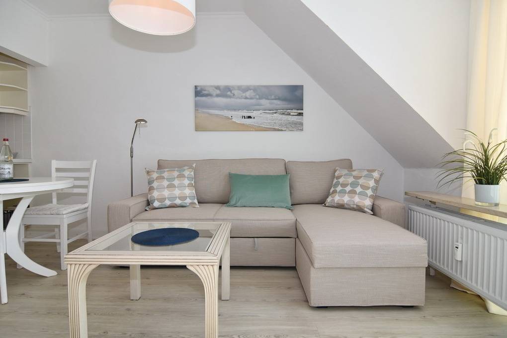 Hübsche 2-Zimmer-Ferienwohnung, ca. 45 m², 2. OG / DG, App. 14, "Nichtraucher". Obergeschoss: Wohnraum mit Schlafcouch und Sessel, Essplatz, Kabel-TV, Radio, W-Lan (ohne Gewähr), offene Küche mit Mikrowelle und Waschmaschine, Südbalkon mit Balkonmöbeln, Duschbad/WC. Dachgeschoss: Schlafzimmer mit Doppelbett (steht an der Wand) und Abstellraum. Tierhaltung und rauchen im Appartement ist nicht gestattet. Wohn- und Schlafzimmer sind mit Laminat ausgelegt. PKW-Stellplatz Nr. 14 auf dem Hof. Bettwäsche und Handtücher sind zur Anreise aufgezogen. Auf dem gegenüberliegenden Grundstück entsteht ab März 2024 ein Neubauvorhaben, hier kann es zu Lärmbelästigungen kommen.