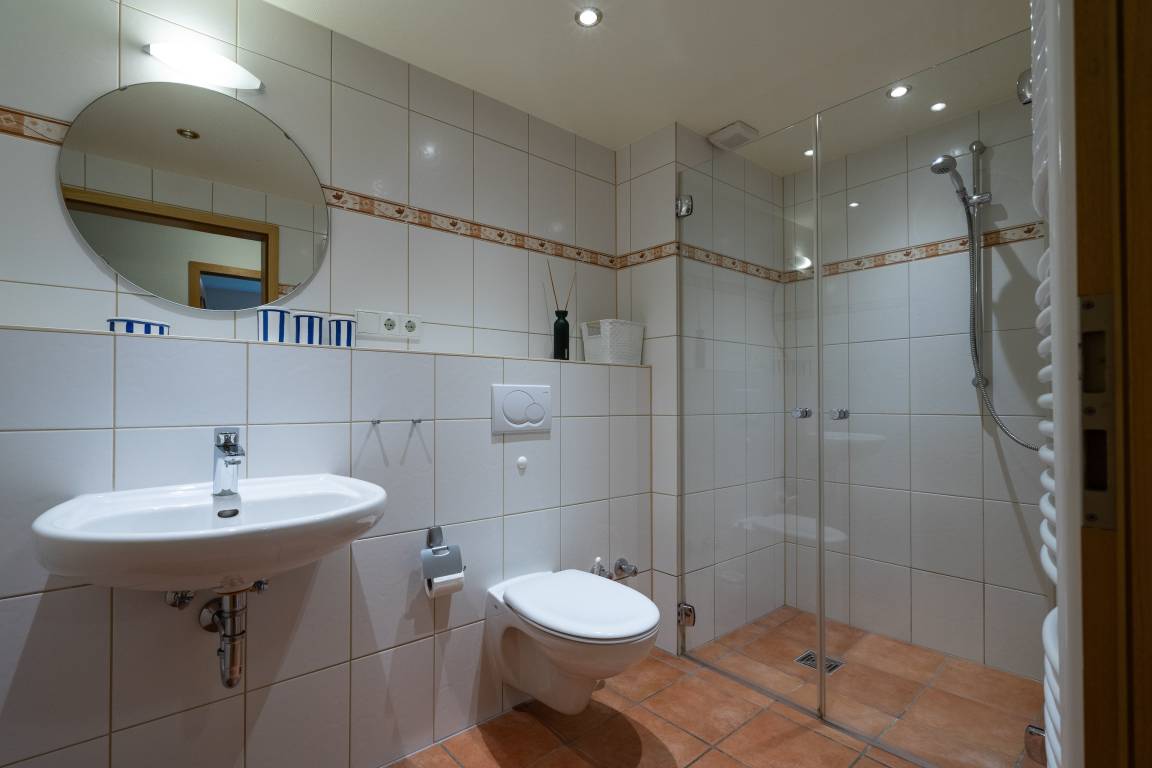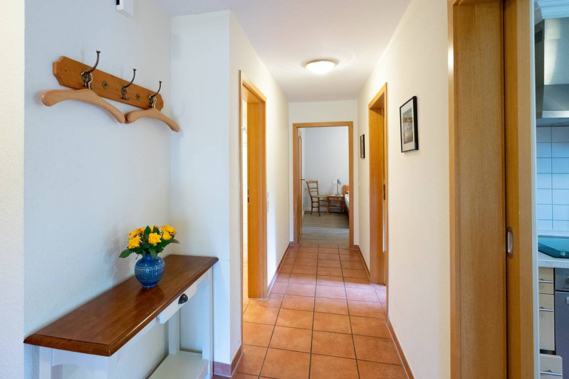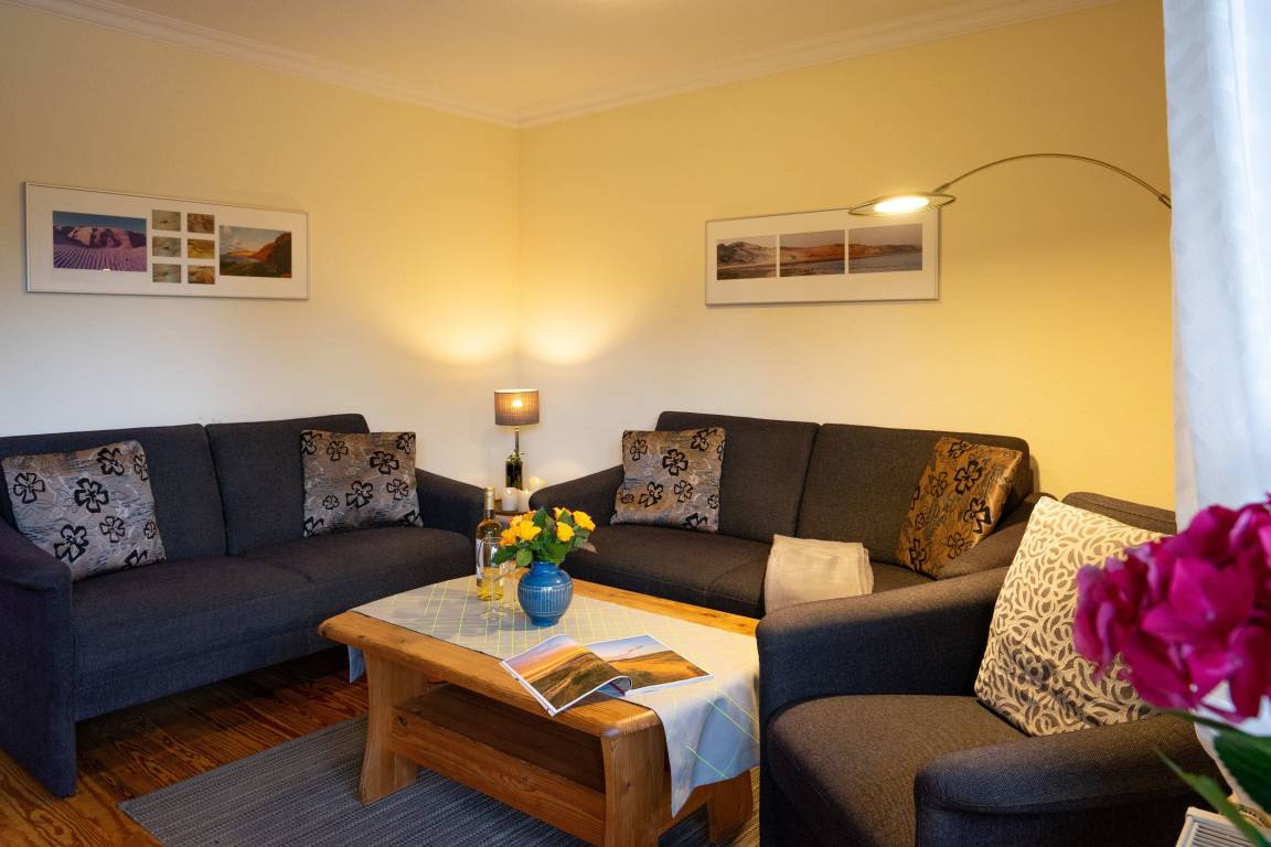 Der einladende Wohnbereich lädt zu entspannten Stunden und gemütlichen Abenden nach einem erlebnisreichen Inseltag ein. Ergänzt wird das Appartement durch eine separate Küche mit Essbereich, die Ihnen viel Freiraum für einen unkomplizierten Urlaub bietet. Ihnen stehen zwei Schlafzimmer zur Verfügung, davon eines mit Doppelbett. Das moderne Badezimmer mit ebenerdiger Dusche sorgt zusammen mit Waschmaschine und Trockner für zusätzlichen Komfort während Ihres Aufenthalts.
