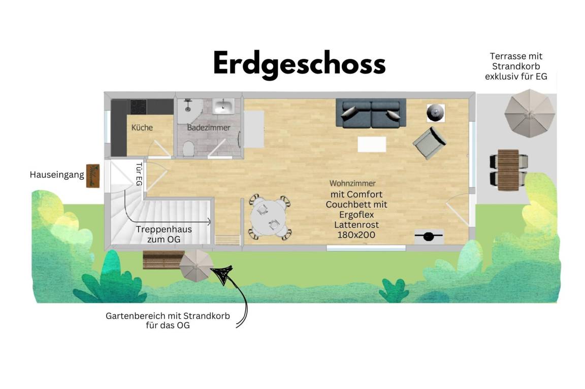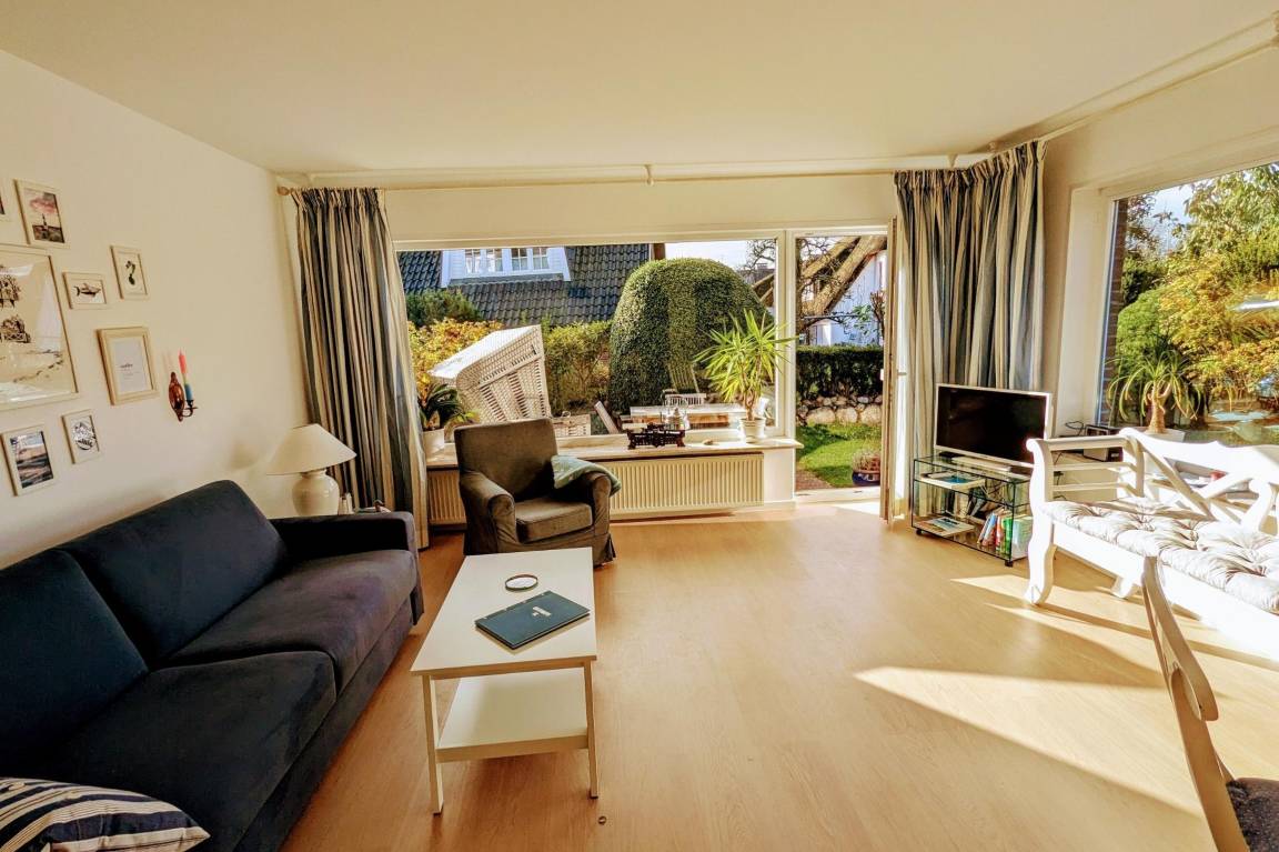 Vom Wohnzimmer aus haben Sie direkten Zugang zu Ihrer eigenen Sonnenterrasse, ausgestattet mit einem gemütlichen Strandkorb, einem Tisch und Stühlen, ideal für entspannte Stunden im Freien.