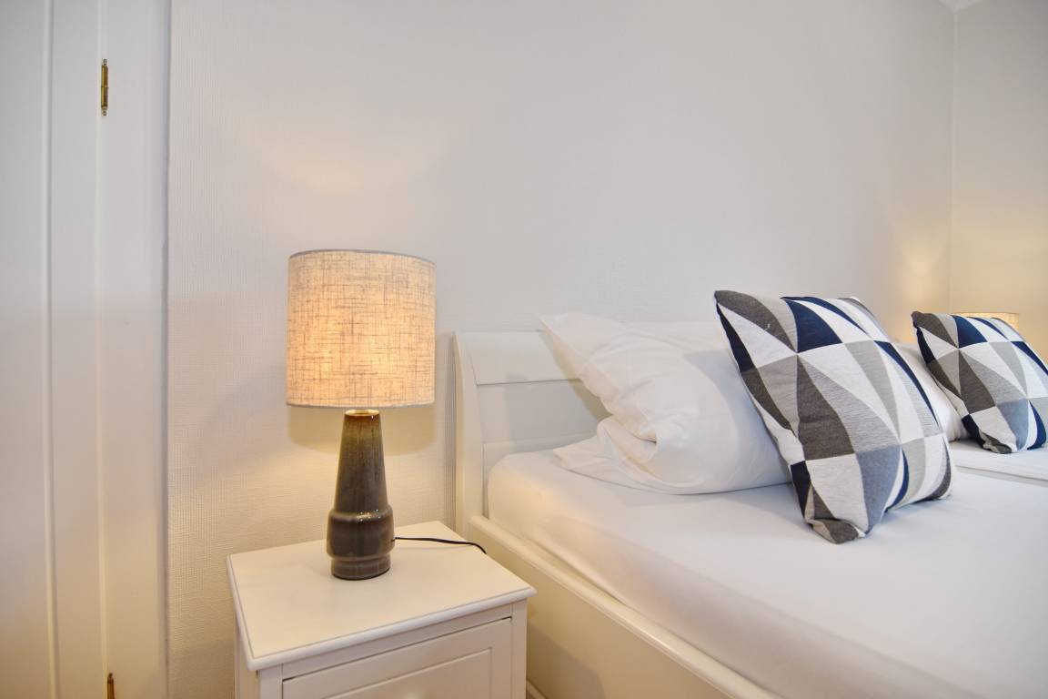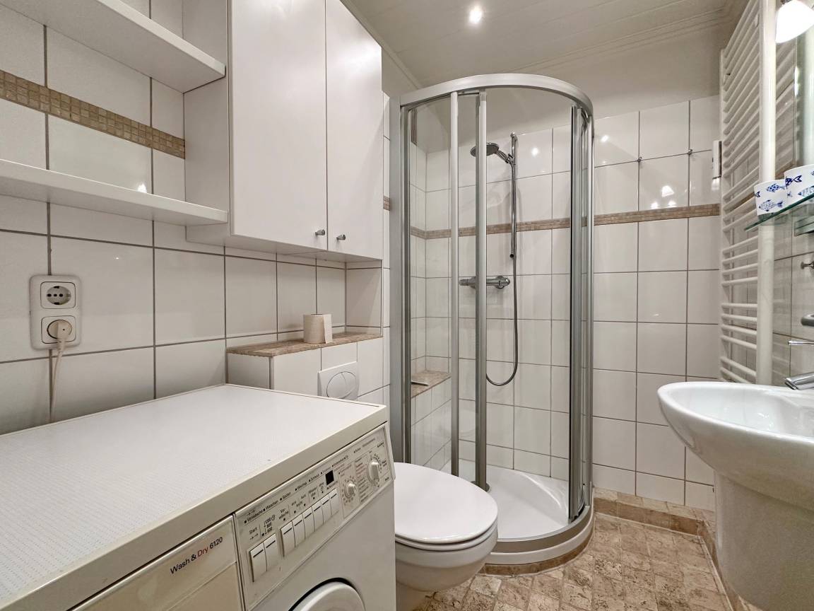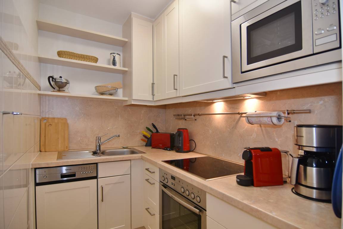 Das Schlafzimmer ist mit einem komfortablen Doppelbett (2 x 90 x 200 cm), einer Kommode und einem praktischen Einbauschrank ausgestattet. In der separaten Küche finden Sie alles, was Sie für die Selbstversorgung benötigen, darunter Backofen, Geschirrspüler, Ceranherd mit 4 Kochfeldern, Wasserkocher, Kaffeemaschine, Nespressomaschine, Toaster etc. Das Duschbad / WC mit Wasch-Trockner rundet die Ausstattung der Wohnung ab.