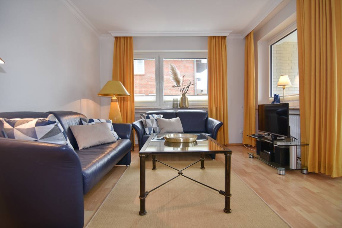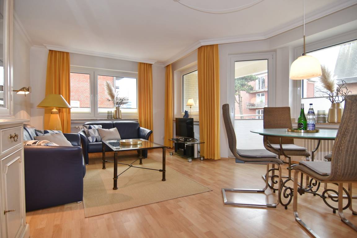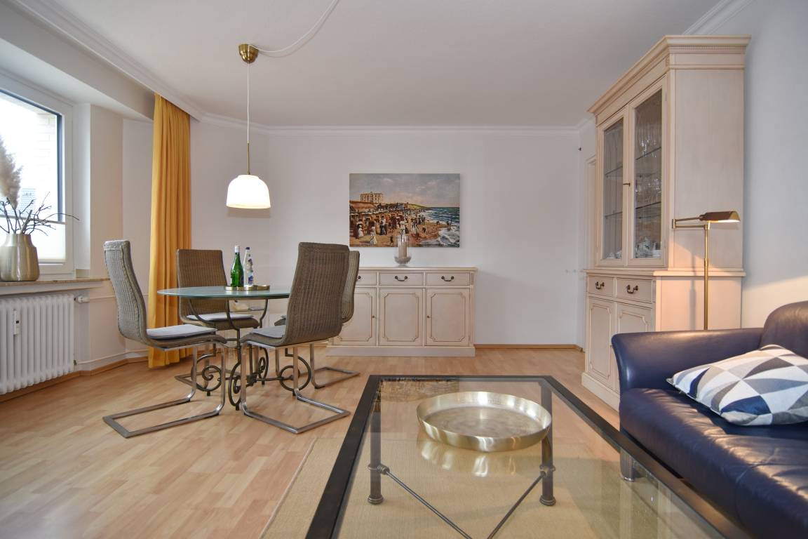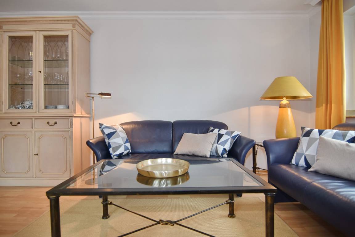 Der gemütliche Wohnbereich lädt mit einer komfortablen Couchecke, Glastisch und Esstisch zum Verweilen ein. Zur Unterhaltung stehen Ihnen ein Flat-TV, DVD-Player, eine Stereoanlage sowie Telefon und Internet-Flatrate zur Verfügung. Vom Wohnzimmer aus gelangen Sie auf den Westbalkon mit Tisch und Stühlen.