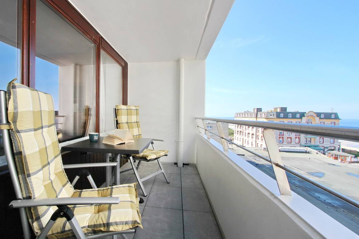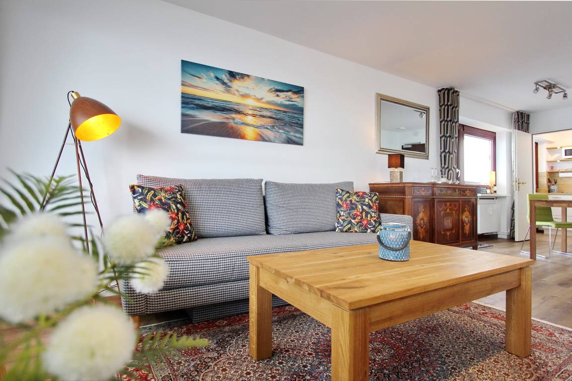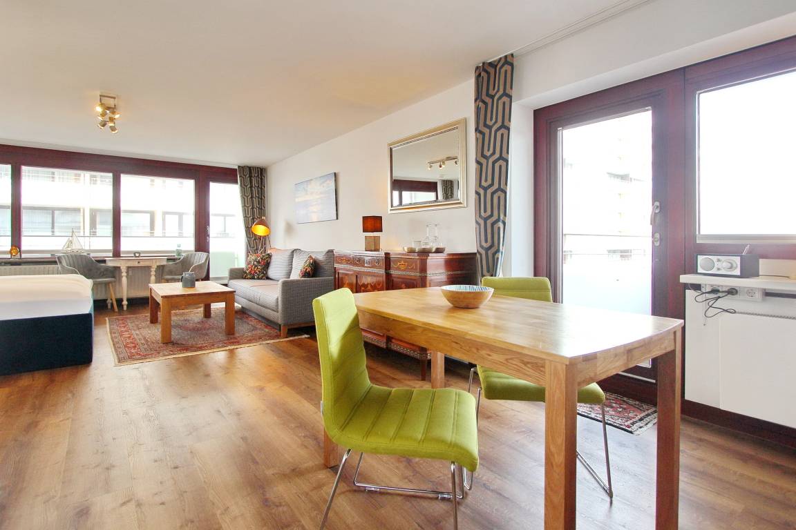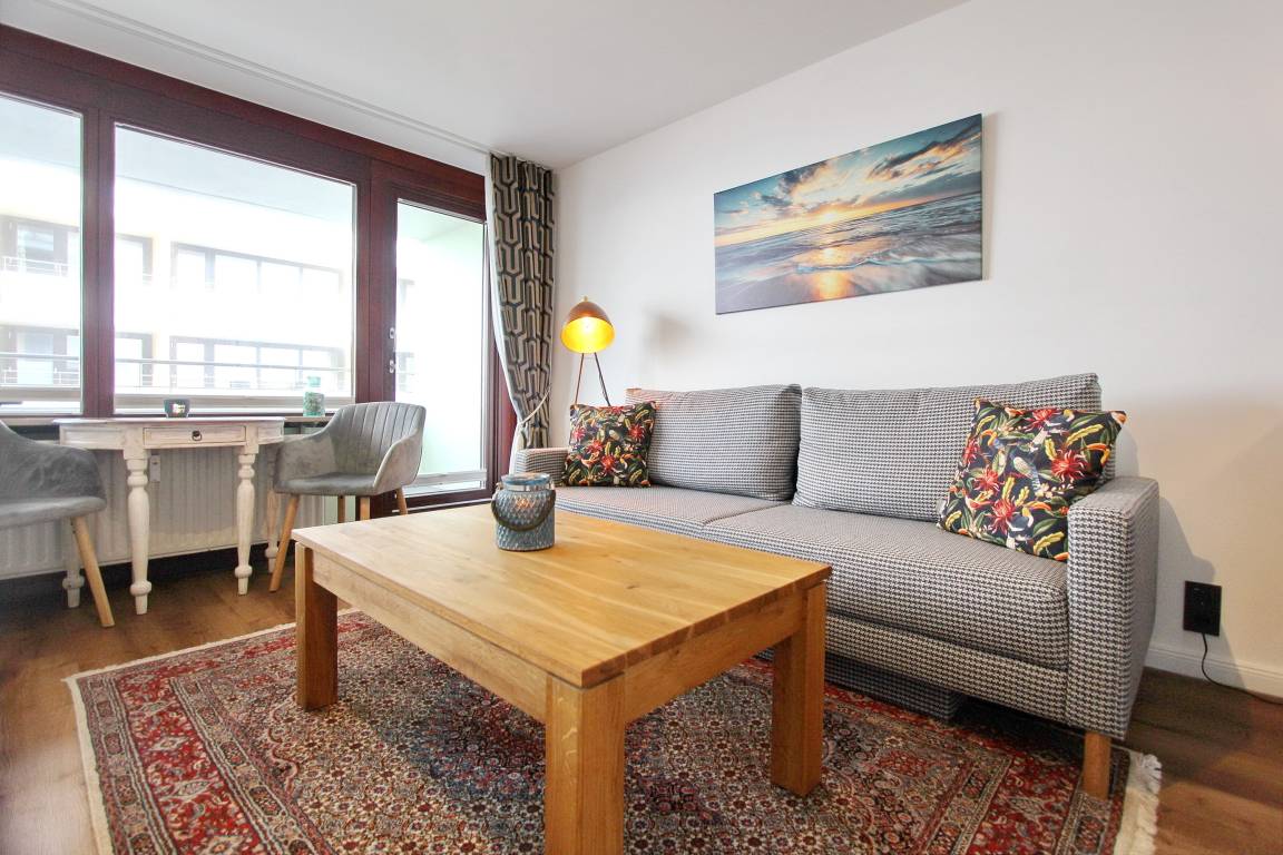 Diese freundlich eingerichtete 1-Zimmer-Wohnung befindet sich im Haus am Meer in der 4. Etage zur Nord-/Westseite und ist nur wenige Schritte von der Friedrichstraße und vom Hauptstrand entfernt. Die Wohnung verfügt über 2 Balkone, einen zur Nordseite und einen zur Westseite - dieser ist mit gemütlichen Balkonmöbeln versehen. Vom Westbalkon haben Sie einen einen schönen Blick auf die Nordsee. Der kombinierte Wohn-/Schlafraum ist mit Designbodenbelag in Holzoptik, mit einem feststehendem Doppelbett, einer Couchgarnitur und einem Essplatz ausgestattet. In der kleinen separaten Küche finden Sie eine Mikrowelle, einen Kühlschrank mit Gefrierfach und einem 4 Platten-Cerankochfeld mit Backofen. Das Badezimmer verfügt über eine Badewanne mit Duschmöglichkeit und WC, Handtuchheizkörper und eine Waschmaschine. Den offenen Hotspot (WEG Haus am Meer - Passwortfrei - ohne Gewähr) können Sie kostenfrei nutzen. Zur technischen Ausstattung gehört ein Flachbild-TV und ein Radio. Nichtraucherwohnung. Haustiere nicht gestattet. Wohnungsgröße ca. 48 m².
