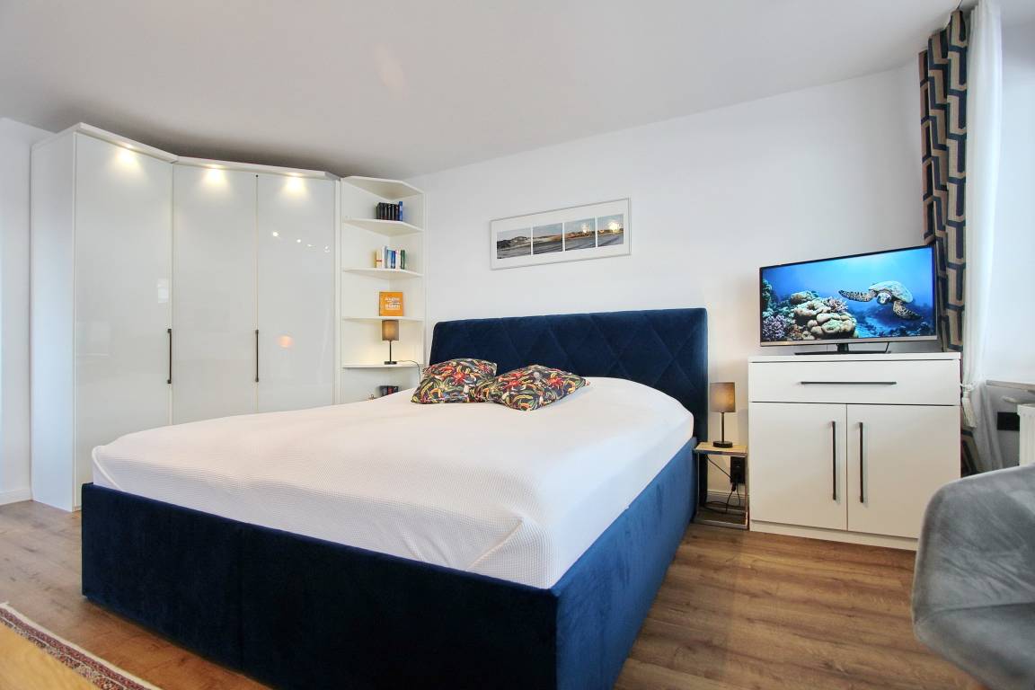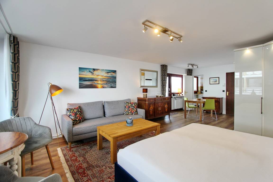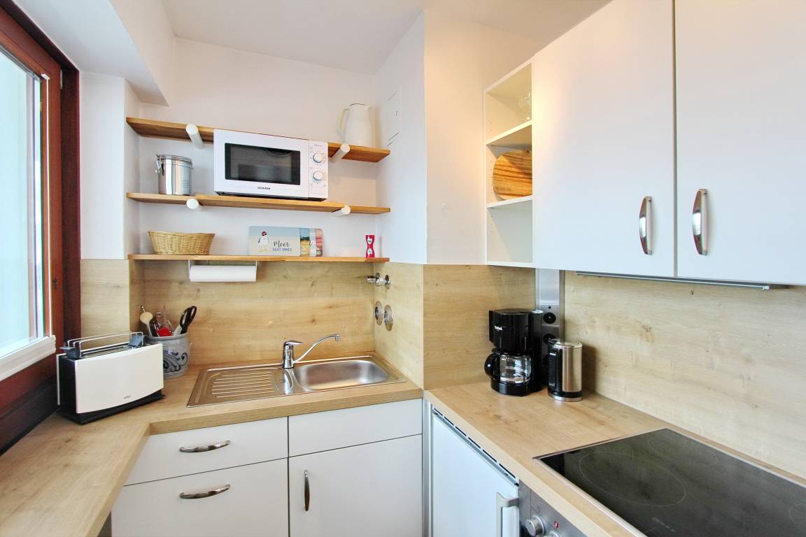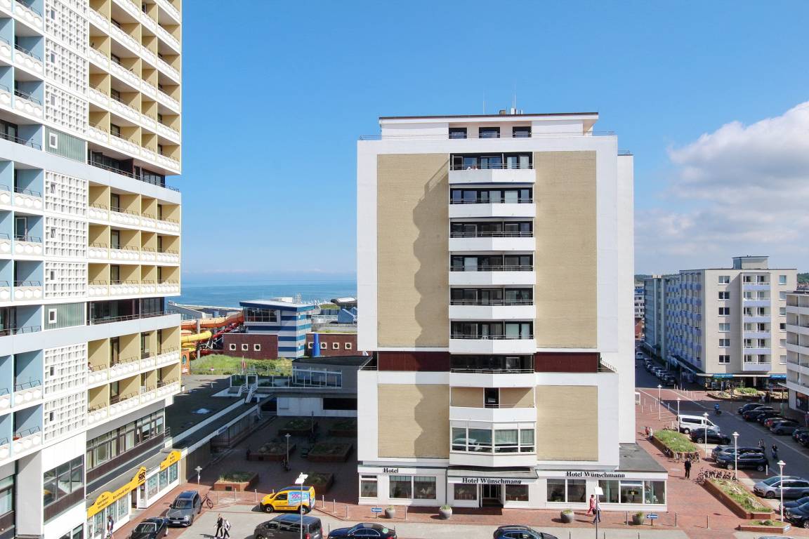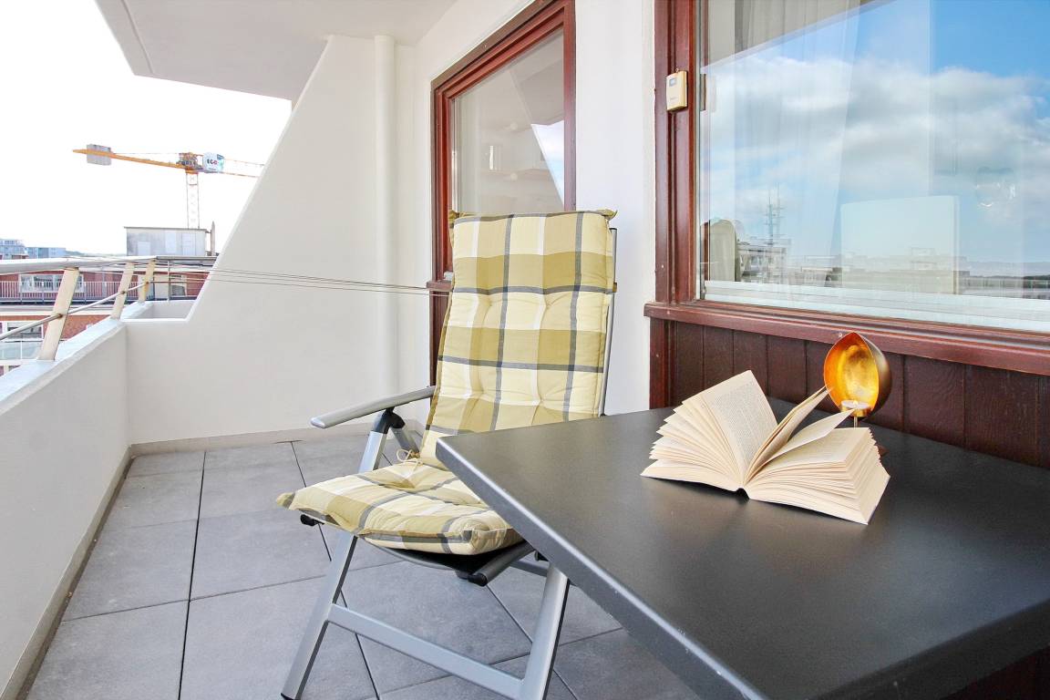 Diese freundlich eingerichtete 1-Zimmer-Wohnung befindet sich im Haus am Meer in der 4. Etage zur Nord-/Westseite und ist nur wenige Schritte von der Friedrichstraße und vom Hauptstrand entfernt. Die Wohnung verfügt über 2 Balkone, einen zur Nordseite und einen zur Westseite - dieser ist mit gemütlichen Balkonmöbeln versehen. Vom Westbalkon haben Sie einen einen schönen Blick auf die Nordsee. Der kombinierte Wohn-/Schlafraum ist mit Designbodenbelag in Holzoptik, mit einem feststehendem Doppelbett, einer Couchgarnitur und einem Essplatz ausgestattet. In der kleinen separaten Küche finden Sie eine Mikrowelle, einen Kühlschrank mit Gefrierfach und einem 4 Platten-Cerankochfeld mit Backofen. Das Badezimmer verfügt über eine Badewanne mit Duschmöglichkeit und WC, Handtuchheizkörper und eine Waschmaschine. Den offenen Hotspot (WEG Haus am Meer - Passwortfrei - ohne Gewähr) können Sie kostenfrei nutzen. Zur technischen Ausstattung gehört ein Flachbild-TV und ein Radio. Nichtraucherwohnung. Haustiere nicht gestattet. Wohnungsgröße ca. 48 m².