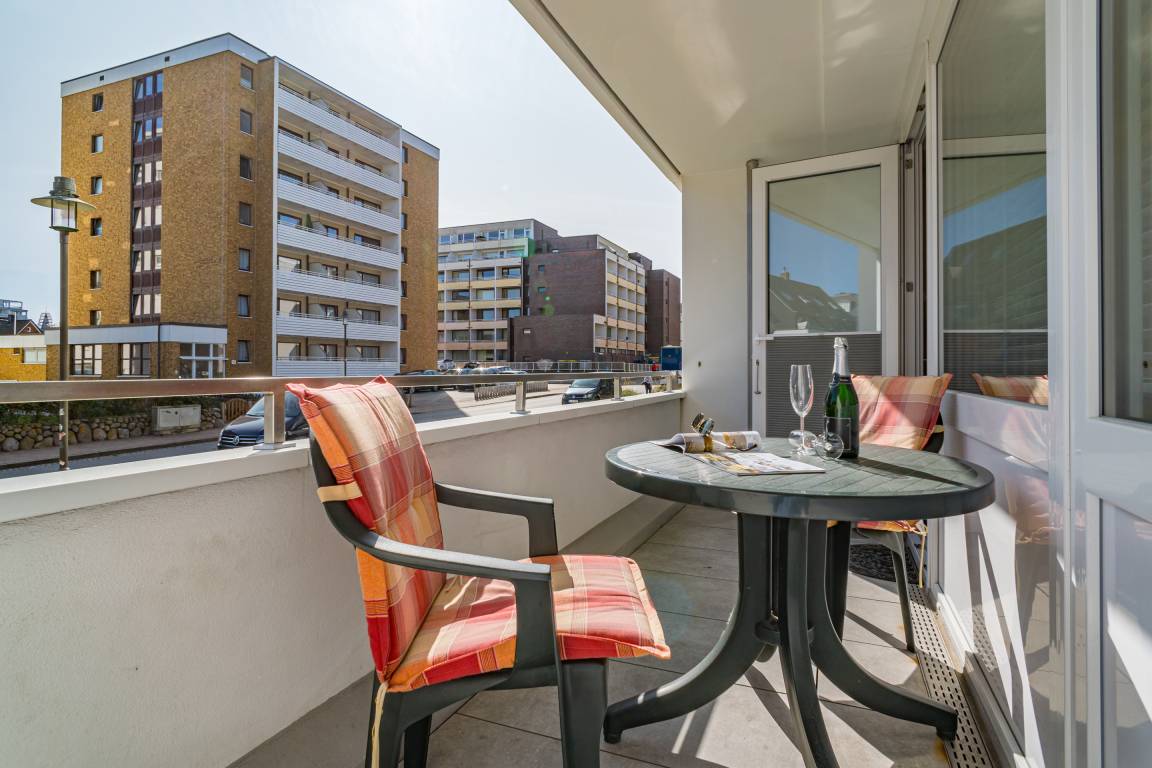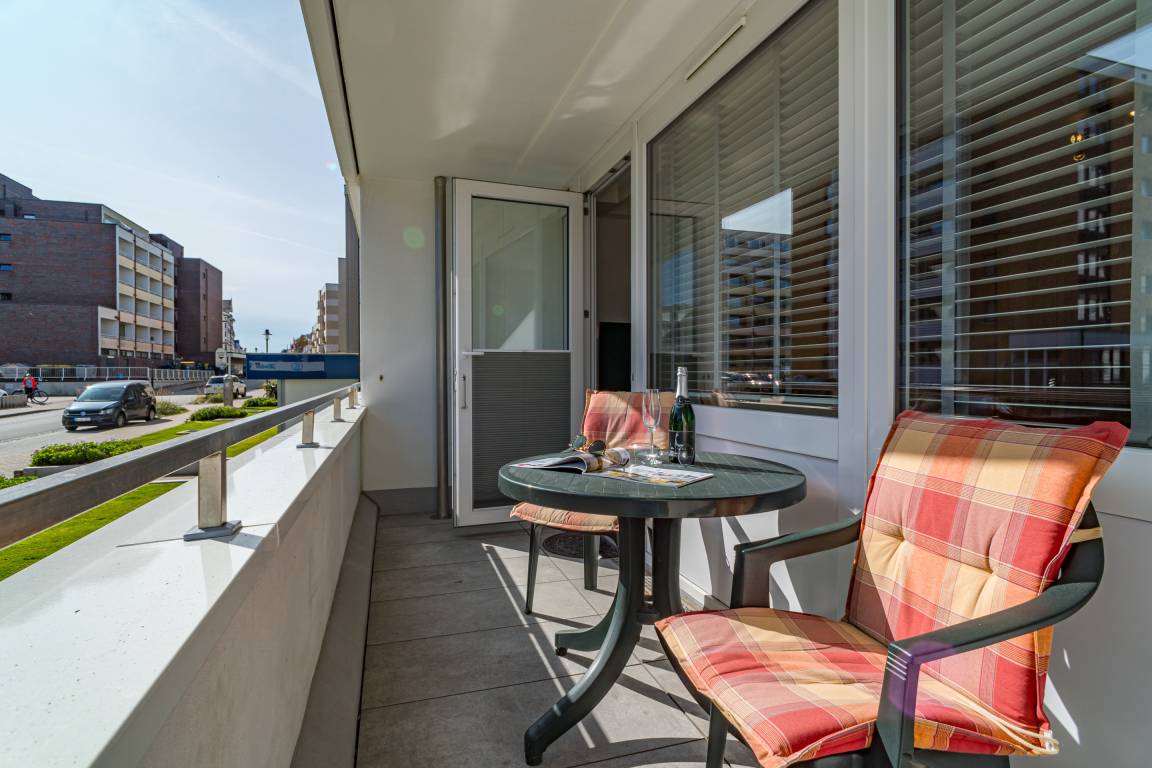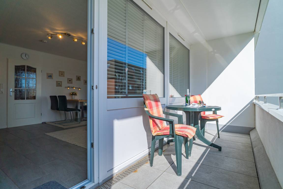 Besonders komfortable, mit großformatigen, schönen Fliesen ausgelegte 1-Zimmer-Nichtraucher-Ferienwohnung (ca. 36 qm) im Parterre zur Landseite mit Ostloggia (Morgensonne, mit Balkonmöbeln und Auflagen) für max. 2 Personen.[nbsp][nbsp]