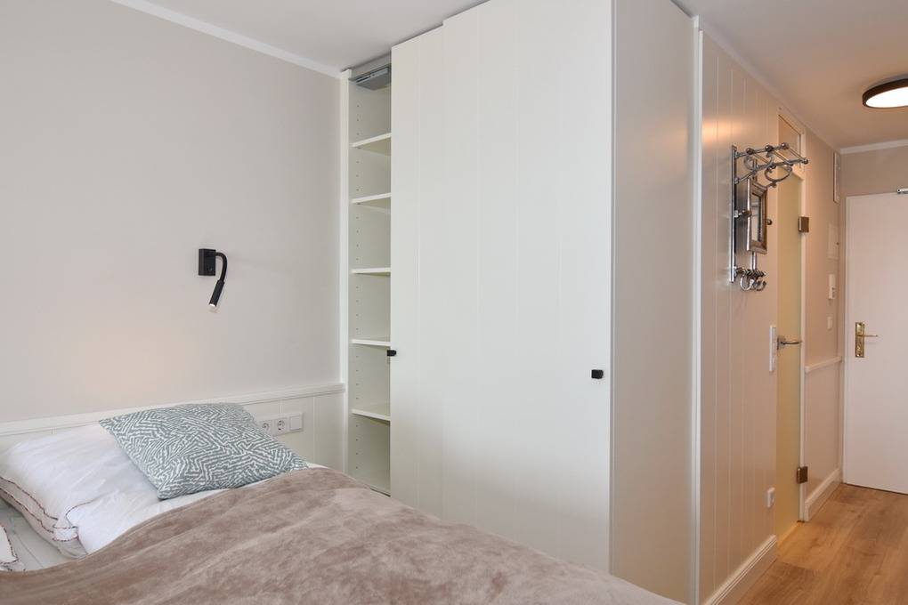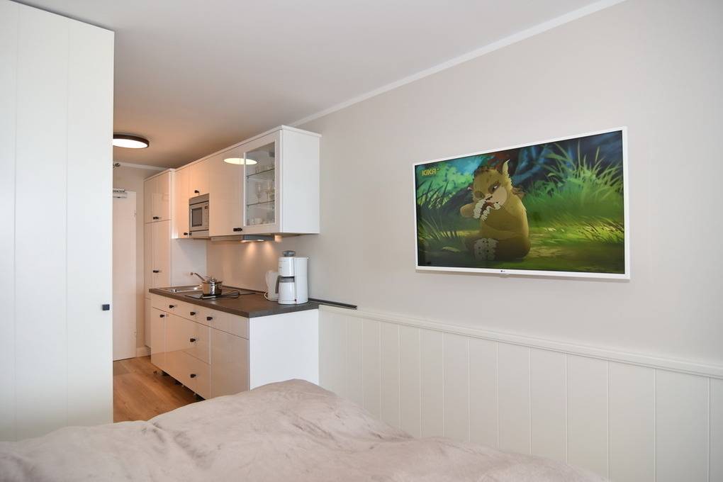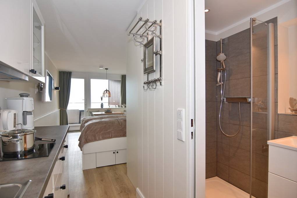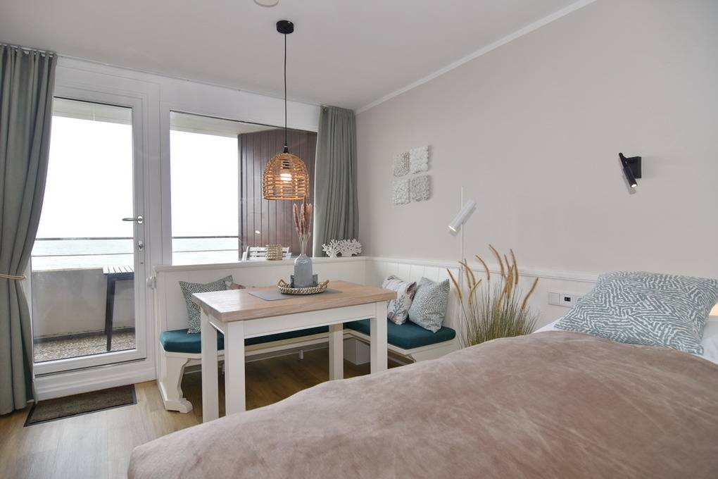 Exklusive 1-Zimmer-Ferienwohnung im 3. OG zur Seeseite mit freiem Blick auf die Nordsee, Nichtraucher-Whg.! Wohn-/Schlafzimmer mit festem Doppelbett (160x200), Einbauschrank, Eckbank und Esstisch, Flat-TV, Radio, Westbalkon mit Balkonmöbeln, Küchenzeile mit Geschirrspüler, Ceranherd und Mikrowelle, Duschbad/WC. W-LAN (ohne Gewähr). Bettwäsche und Handtücher sind zur Anreise aufgezogen. Ein PKW-Stellplatz kann kostenpflichtig zugebucht werden. Tierhaltung ist nicht gestattet! Beginnend vom 15.10.2025 bis 5.4.2026 (Ostern) findet die Fassandensanierung der Landseite (Osten) sowie des Südgiebels statt. Mit Baulärm ist in dieser Zeit zu rechnen.