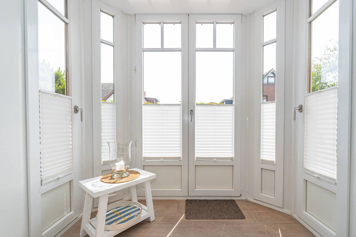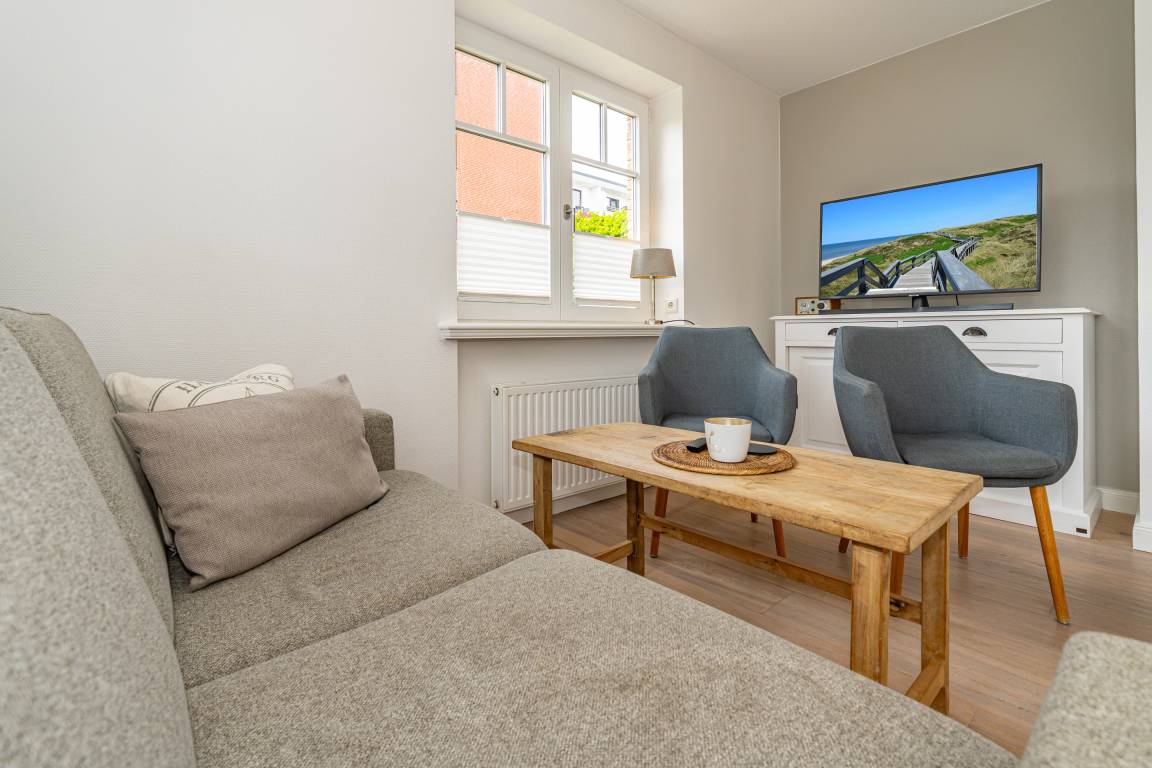 Im Eingangsbereich befindet sich die Diele mit Garderobe. Daran schließt das Wohnzimmer mit direktem Zugang zur geschützten Südterrasse an. Der Wohnraum ist mit einer Sitzgarnitur (2-Sitzer-Couch mit hochwertiger ausziehbarer Schlafmöglichkeit und 2 Sesseln), einem separaten Essplatz, Flachbild-TV, WLAN und einer offene Küche ausgestattet. Die voll ausgestattete weiße Hochglanzküche lässt mit Geschirrspüler, Ceranfeld (4 Felder) und Backofen kaum Wünsche offen. Kaffeemaschine, Wasserkocher und Toaster gehören zur Grundausstattung.[nbsp][nbsp]