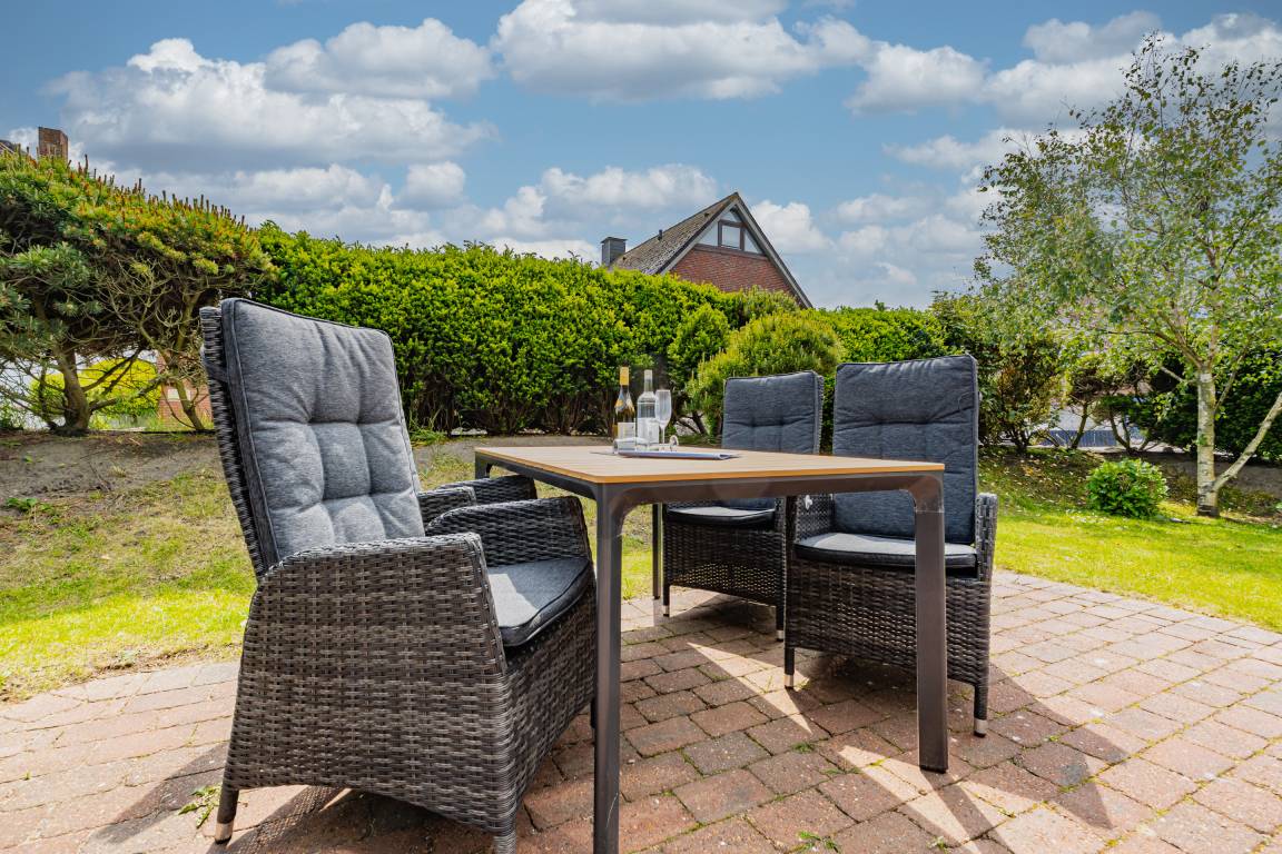 Hochwertig ausgestattete 2,5-Zimmer-Ferienwohnung mit ca. 55 qm zur Südseite mit möblierter Terrasse (mit Balkonmöbeln, Auflagen und Sonnenschirm) für bis zu 4 Personen.