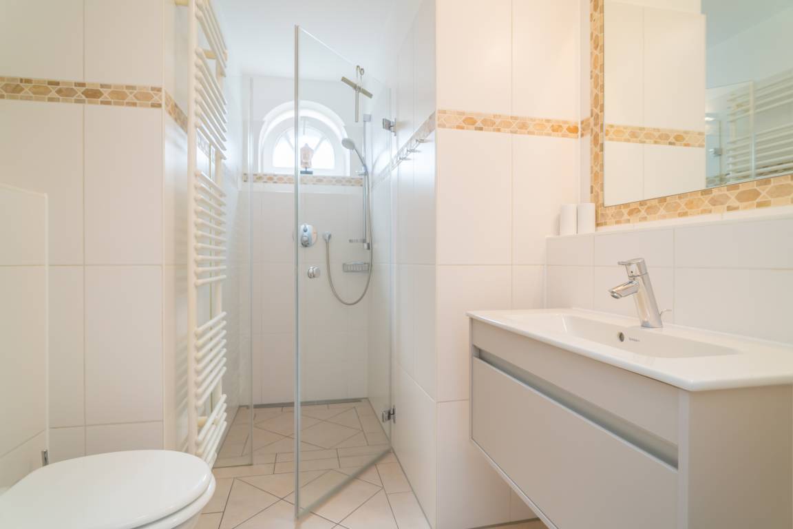Das Badezimmer ist mit Dusche (mit bodengleichem Einstieg), Waschtisch, Handtuchtrockner, Föhn, WC und Fenster ausgestattet.