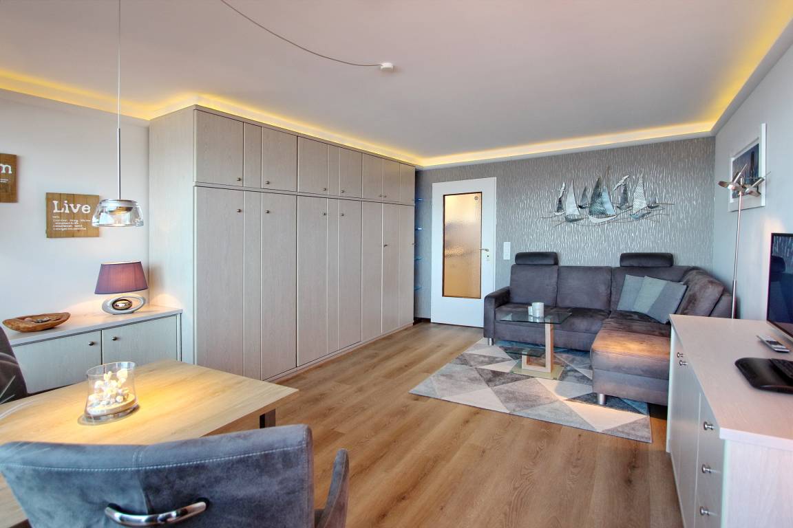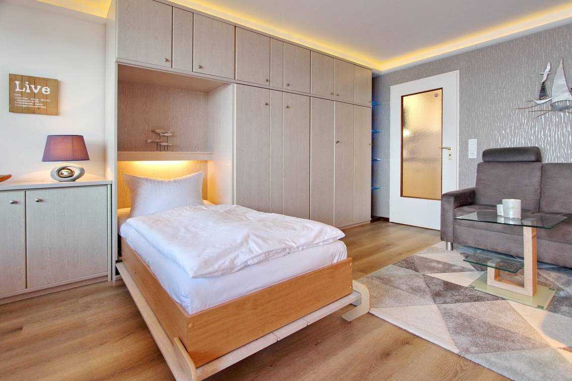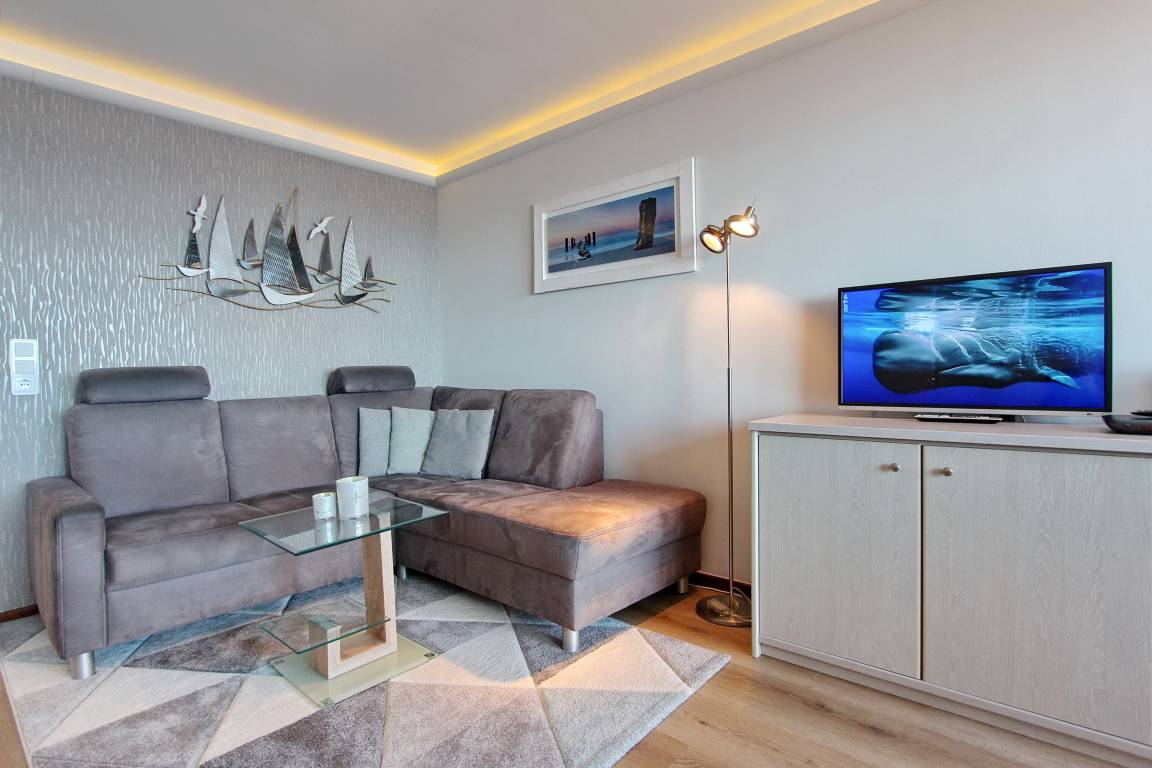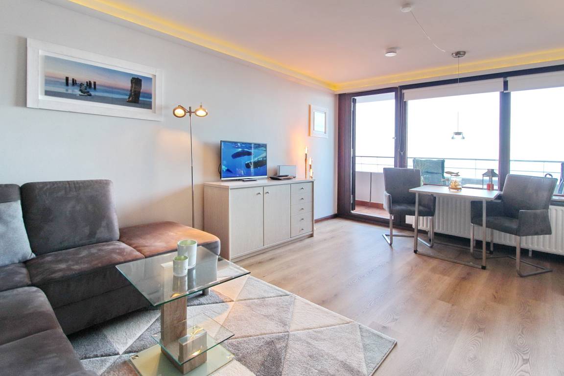 Diese Nichtraucherwohnung in der 3. Etage im Haus Metropol hat einen herrlichen Blick über den Strand und die Nordsee. Der hell und freundlich eingerichtete Wohn-/Schlafraum mit vorgelagertem Westbalkon verfügt über Einzelschrankbetten, einen Essplatz am Fenster mit 2 Stühlen, sowie eine bequemes Sofa. Im modernen Badezimmer gibt es eine Eckdusche, einen Handtuchtrockner, einen Duschhocker und einen Fön. Eine Einbauküche befindet sich im Flur. Stilvoll decken sie den Tisch mit Porzellan von Seltmann Weiden. Zur technischen Ausstattung gehört ein Flachbildfernseher von Panasonic mit integriertem Radio, eine Bluetooth Anlage mit Radio und CD Player von Sony und ein Telefonanschluss mit Flatrate ins dt. Festnetz ist ebenfalls vorhanden. Ein freies WLAN Netzwerk (WEG Haus Metropol - Passwortfrei - ohne Gewähr) und ein eigener Internetzugang des Eigentümers steht ihnen kostenfrei zur Verfügung. Haustiere sind herzlich willkommen. Wohnungsgröße: ca.34 m².