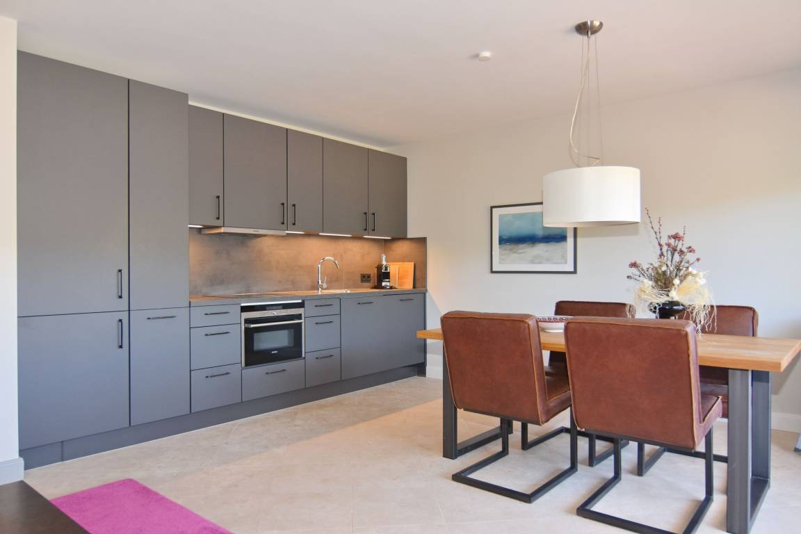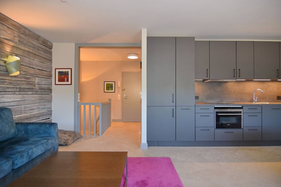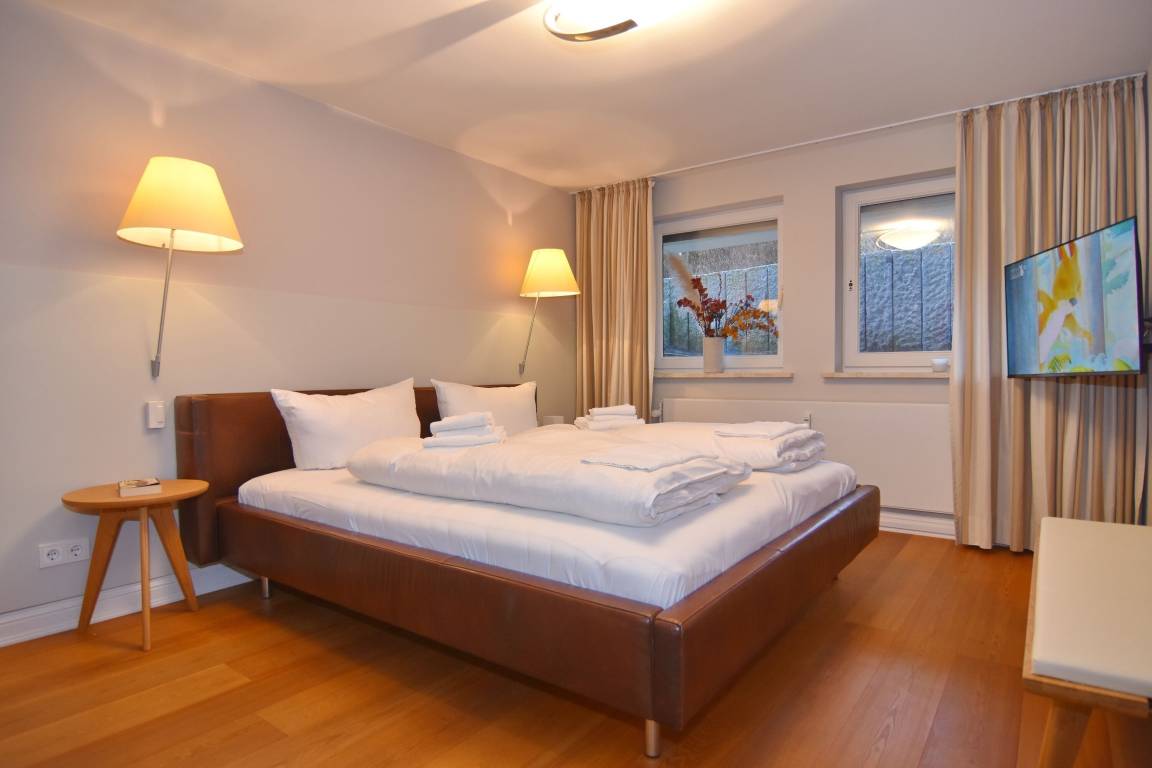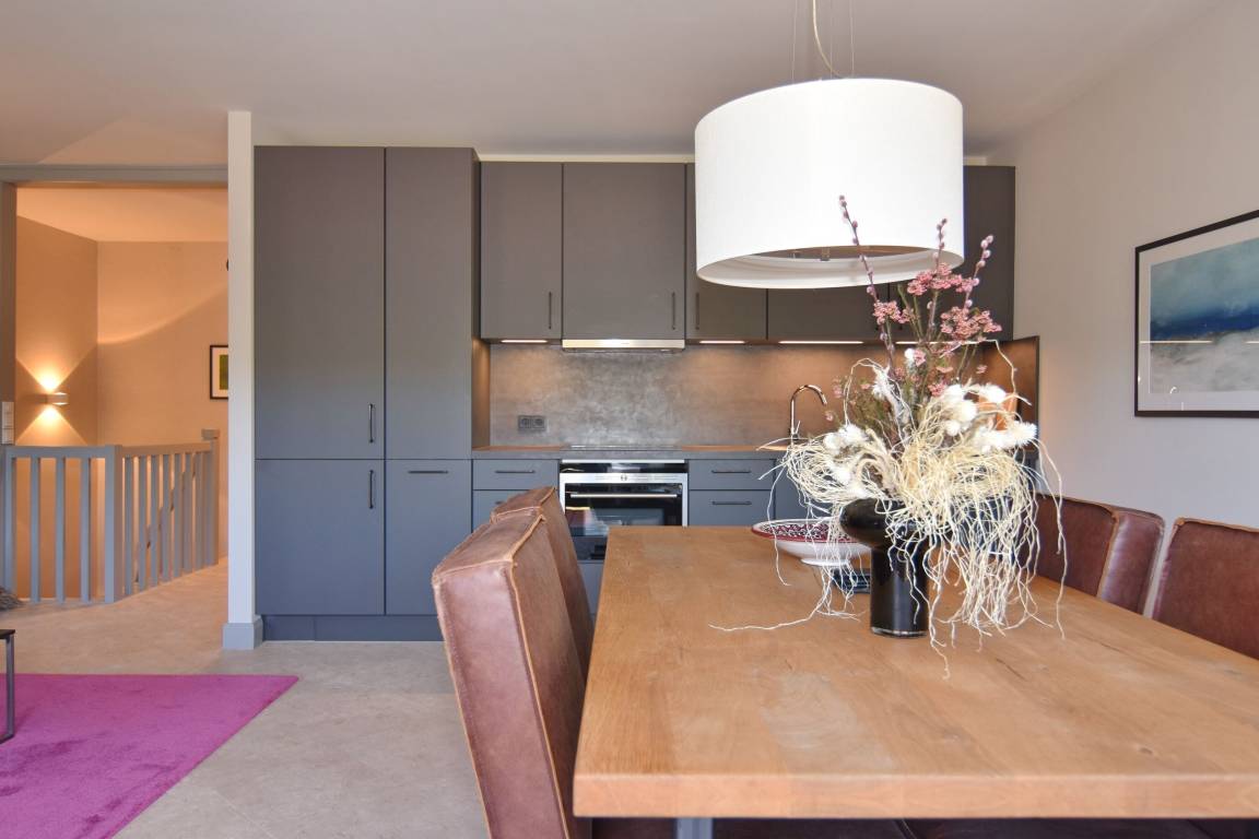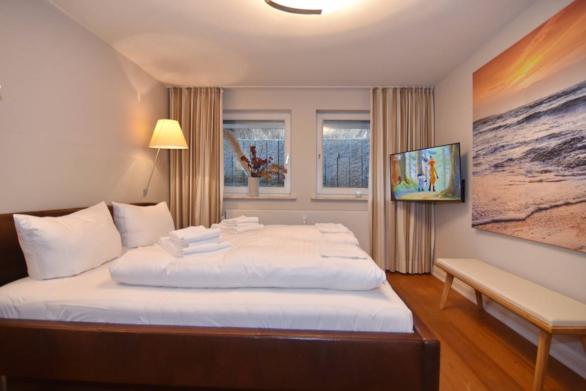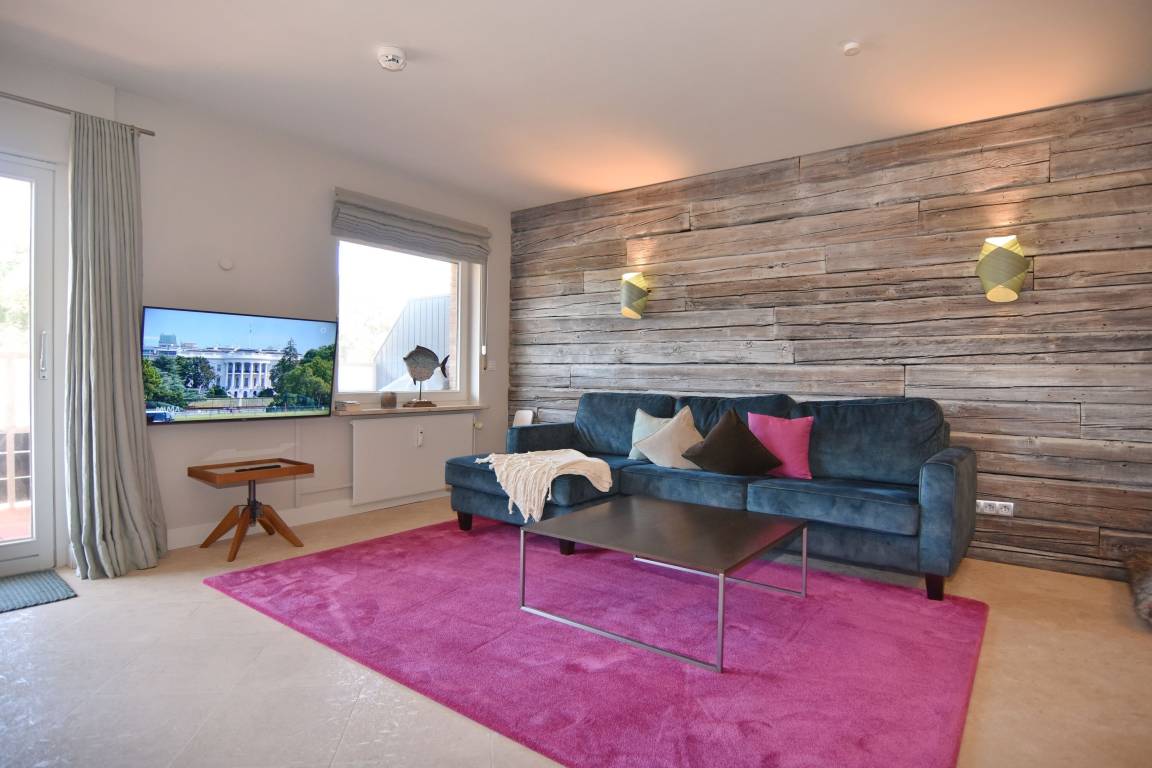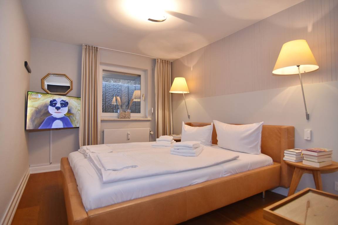 Die geschmackvolle 3-Zimmer-Wohnung erstreckt sich über zwei Ebenen. Im Hochparterre befindet sich das Wohnzimmer mit Sitz- und Essecke, TV, WLAN, offene Küche mit Induktionsherd, Backofen mit Mikrowellenfunktion, Ceranherd und Geschirrspüler, Kühlschrank mit Gefrierfach sowie einem Badezimmer mit Wanne und WC. Vom Wohnzimmer aus gelangen Sie auf den möblierten Westbalkon. Eine offene Treppe ins Souterrain führt zu 2 Schlafzimmern und einem weiteren Badezimmer mit Dusche. Beide Schlafzimmer verfügen über einen großen TV. Das große Schlafzimmer hat einen Kleideschrank. Weitere Schrankflächen befinden sich im Vorflur der Schlafräume.