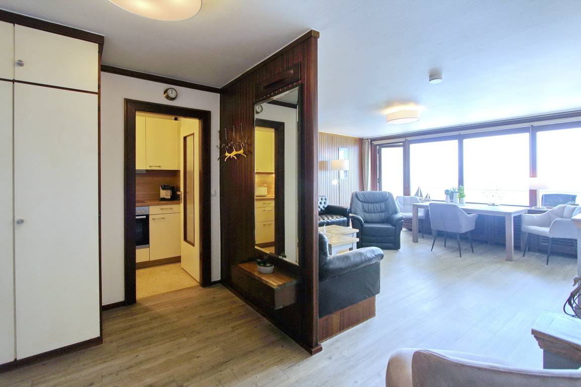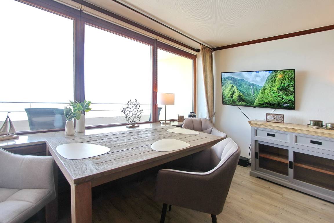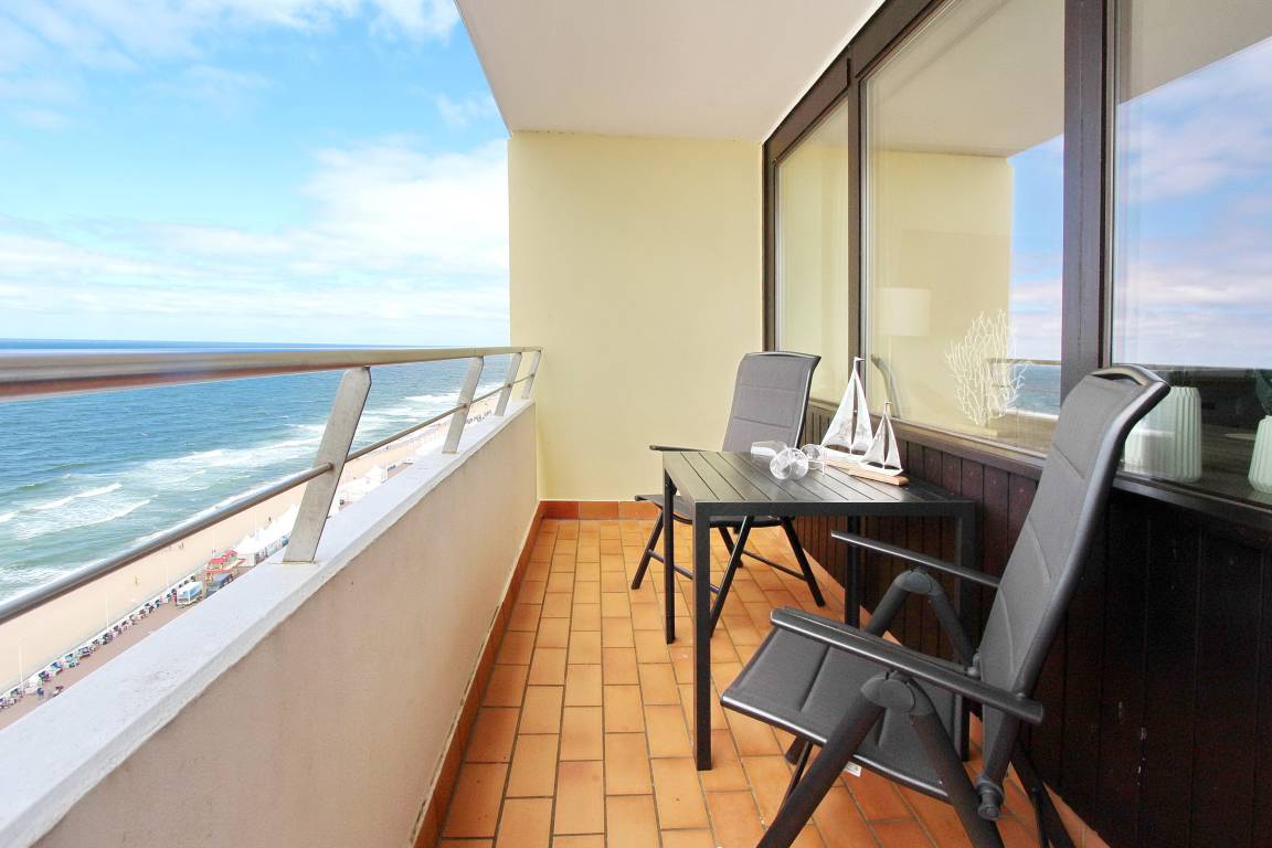 2-Zimmer-Wohnung in der 13. Etage im Haus Metropol mit vorgelagertem Westbalkon und einem herrlichen Blick über den Strand, die Promenade von Westerland und das Meer. Eine große Eckledercouch dominiert den maritim gestalteten Wohnbereich. Einen Lederfernsehsessel mit Fusshocker und einen Essplatz mit 3 Stühlen am Fenster gibt es ebenfalls. In der ganzen Wohnung wurde Designfussboden in Holzoptik verlegt. Das Schlafzimmer hat ein feststehendes Doppelbett, einen Kleiderschrank mit viel Stauraum sowie einen zusätzlichen Zugang zum Badezimmer und einen kleinen Westbalkon. Die moderne Küche verfügt über ein Ceranfeld, einen Backofen und eine zusätzliche Nespressomaschine mit Milchaufschäumer und Kapselhalter. Im Badezimmer gibt es eine Dusche und ein Bidet. Zur technischen Ausstattung der Wohnung gehört ein Flachbildfernseher, eine Stereoanlage und ein Radio. Ein freies WLAN Netzwerk (WEG Haus Metropol - Passwortfrei - ohne Gewähr) steht ihnen kostenfrei zur Verfügung. Diese Wohnung hat eine Größe von 67 m².
