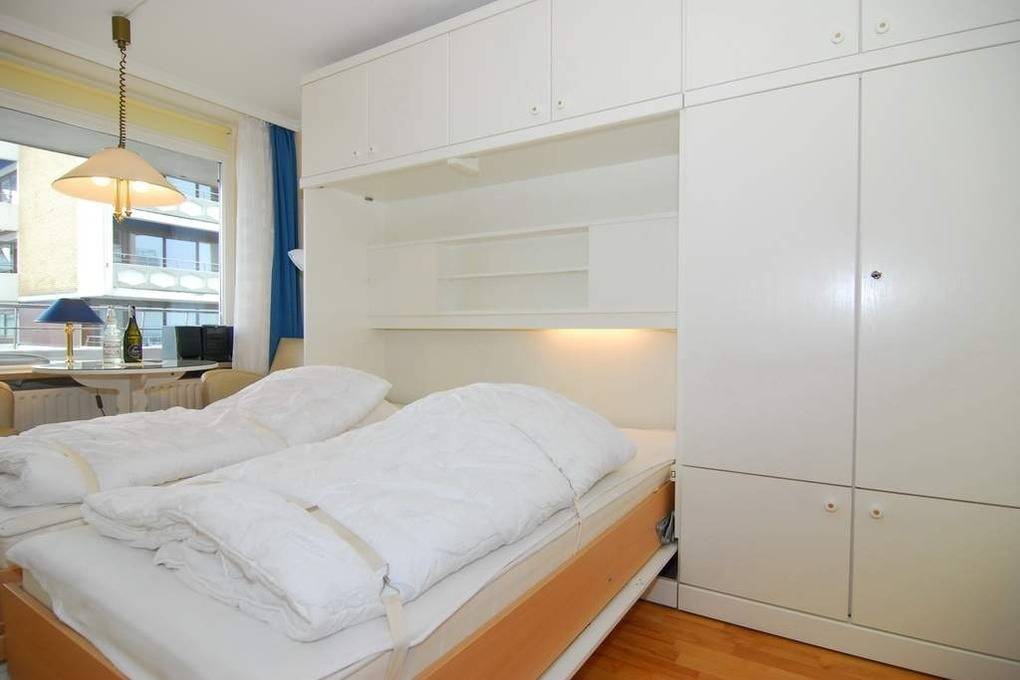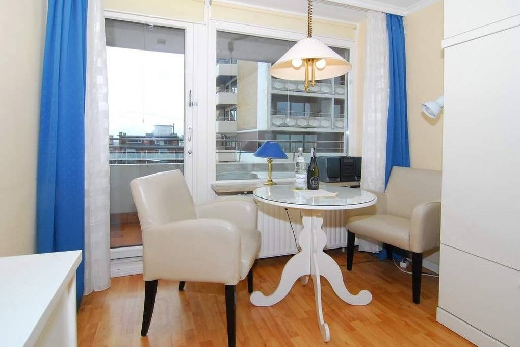 1-Zimmer-Ferienwohnung, 23m², 3. OG, im Haus Metropol zur Landseite. Nichtraucher-Wohnung![nbsp][nbsp]Wohn-/ Schlafraum mit Einzelschrankbetten, Essplatz am Fenster, Kabel-TV, Radio, W-Lan (ohne Gewähr), Ostbalkon mit Balkonmöbeln, neue Küchenzeile im Flurbereich mit Mikrowelle, Geschirrspüler und 2 Platten-Ceranfeld, Duschbad/WC. Das Apartment ist mit Laminat ausgelegt. Bettwäsche und Handtücher sind zur Anreise aufgezogen. Ein PKW-Stellplatz kann kostenpflichtig zugebucht werden.