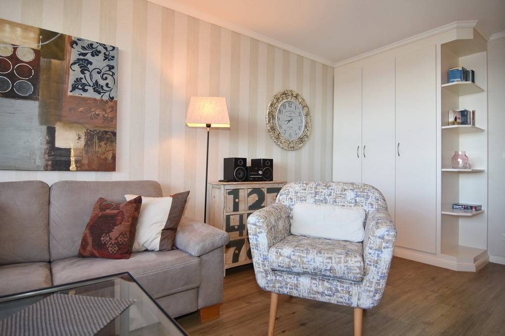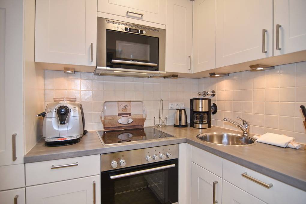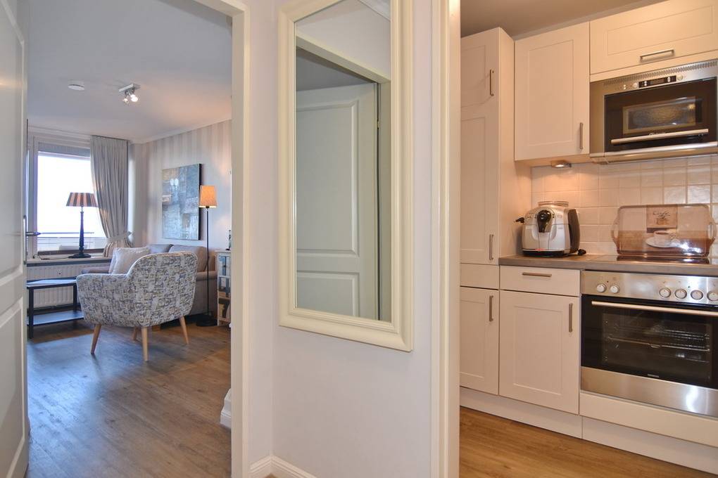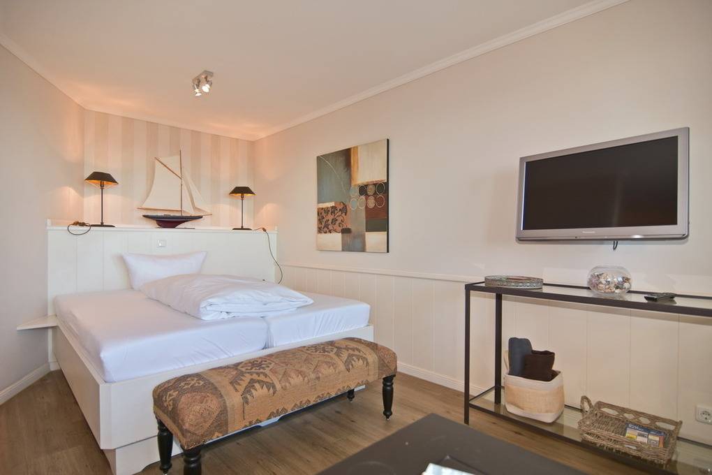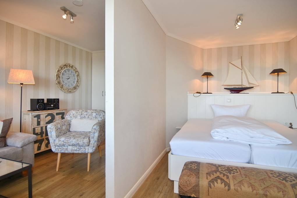 Exklusive 1-Zimmer-Wohnung im 1. OG zur Seeseite mit Westbalkon und Blick zum Wasser. Nichtraucher-Whg.! Vom Flurbereich der Wohnung gelangen Sie in die separate Küche mit Geschirrspüler, Mikrowelle und Backofen. Der Ceranherd verfügt über 4 Kochfelder und der Kühlschrank über ein Gefrierfach. Das Duschbad/ WC ist geräumig und hat eine Türbreite von 68cm. Der Schlafbereich des kombinierten Wohn-/Schlafzimmers ist durch eine Wand abgetrennt, bleibt aber offen zur Fensterfront. Das Doppelbett hat mit 2 Matratzen eine Liegefläche von 160 x 200cm. Der Wohnbereich bietet ein 2-Sitzer-Sofa, 1 Sessel sowie einem Essplatz am Fenster. Kostenloser Hotspot über gemeinschaftlichen Hausanschluss vorhanden (ohne Gewähr). PKW-Stellplatz/Garage kann kostenpflichtig gebucht werden. Bettwäsche und Handtücher sind zur Anreise aufgezogen. Tierhaltung ist nicht gestattet.