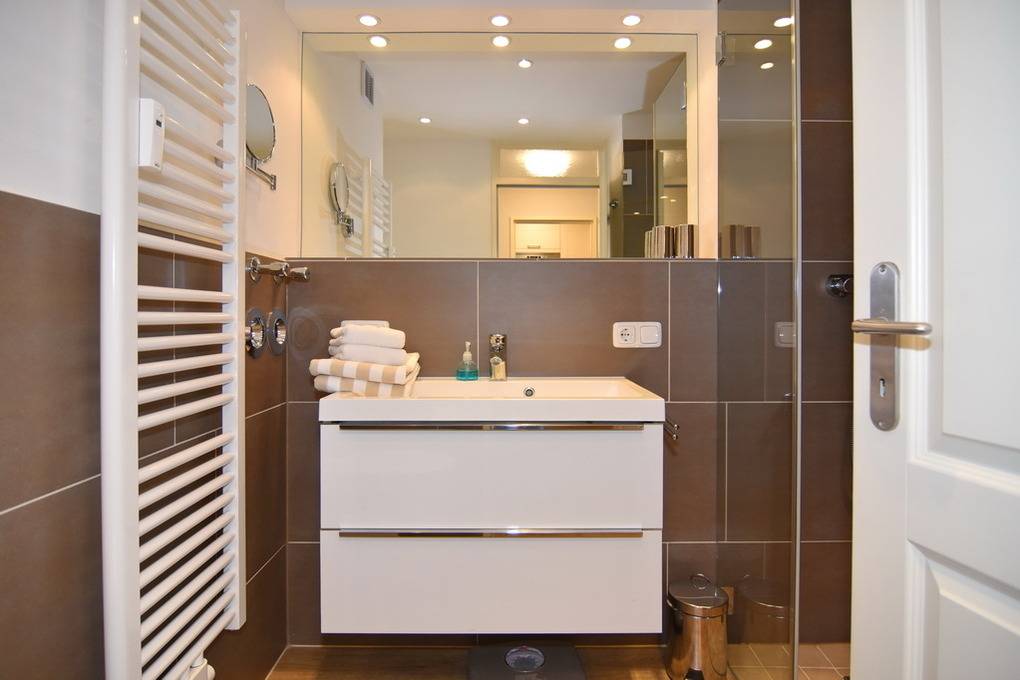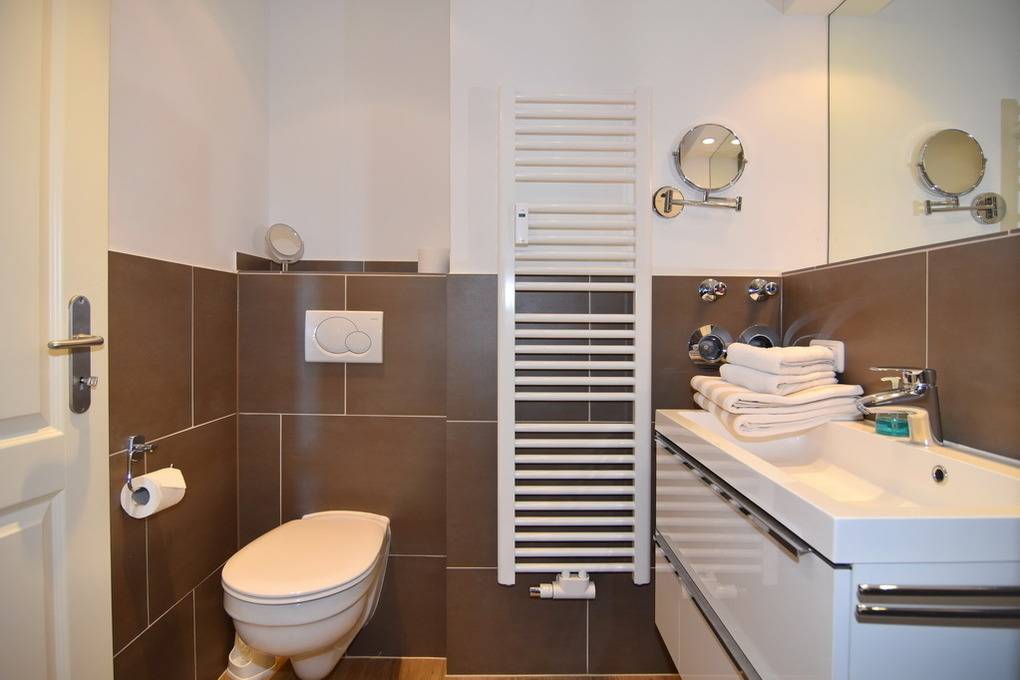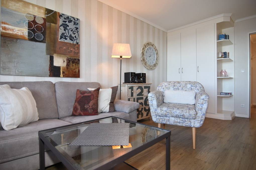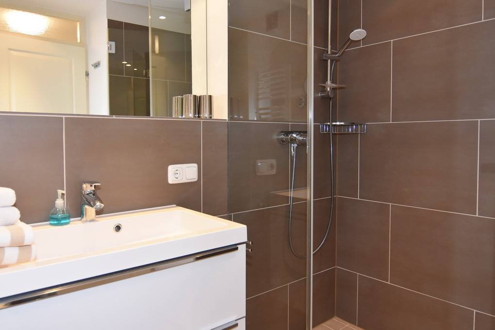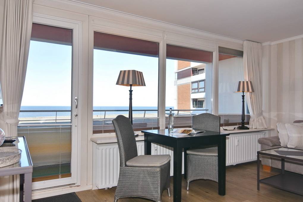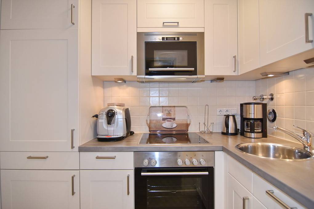 Exklusive 1-Zimmer-Wohnung im 1. OG zur Seeseite mit Westbalkon und Blick zum Wasser. Nichtraucher-Whg.! Vom Flurbereich der Wohnung gelangen Sie in die separate Küche mit Geschirrspüler, Mikrowelle und Backofen. Der Ceranherd verfügt über 4 Kochfelder und der Kühlschrank über ein Gefrierfach. Das Duschbad/ WC ist geräumig und hat eine Türbreite von 68cm. Der Schlafbereich des kombinierten Wohn-/Schlafzimmers ist durch eine Wand abgetrennt, bleibt aber offen zur Fensterfront. Das Doppelbett hat mit 2 Matratzen eine Liegefläche von 160 x 200cm. Der Wohnbereich bietet ein 2-Sitzer-Sofa, 1 Sessel sowie einem Essplatz am Fenster. Kostenloser Hotspot über gemeinschaftlichen Hausanschluss vorhanden (ohne Gewähr). PKW-Stellplatz/Garage kann kostenpflichtig gebucht werden. Bettwäsche und Handtücher sind zur Anreise aufgezogen. Tierhaltung ist nicht gestattet.
