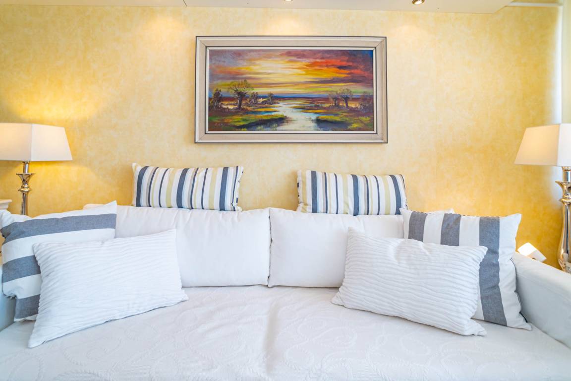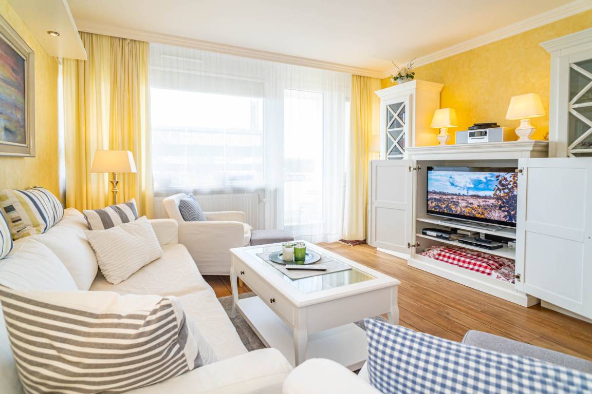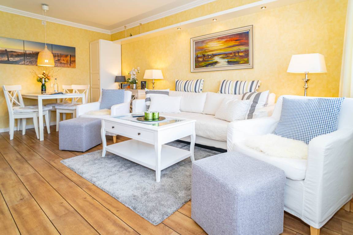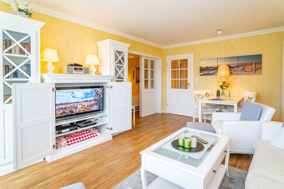 Der Wohnraum besteht aus einer gemütlichen Sitzgarnitur, einem Essplatz, Flachbild-HDTV und Blue-Ray-Player, Radio und einem Telefon inklusive Flatrate für Gespräche ins deutsche Festnetz (Handynummern gesperrt), Verdunklungsrollos.