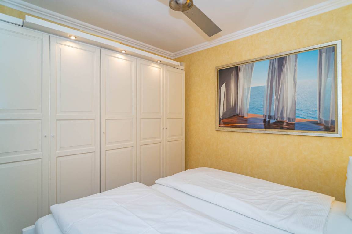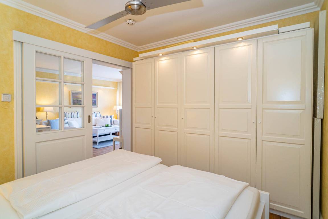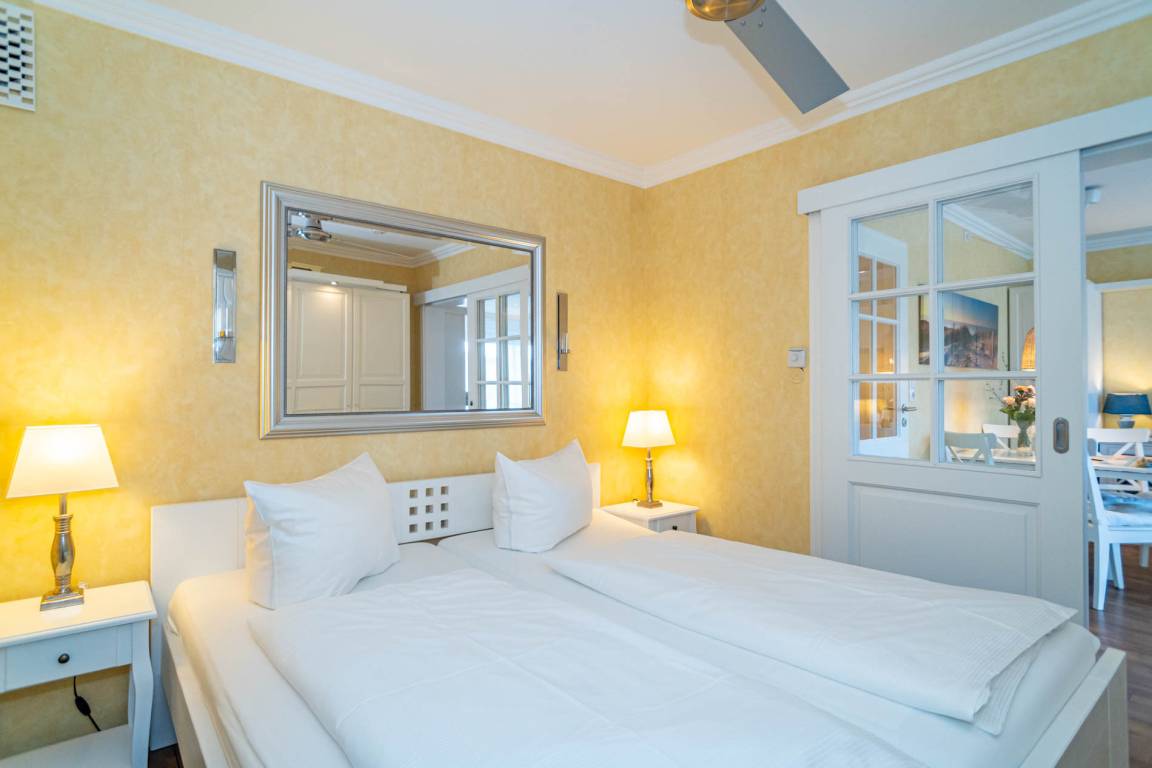 Die Schlafnische (durch eine Schiebetür mit Glasfenster vom Wohnzimmer abgetrennt) hat ein Doppelbett mit zwei Einzelmatratzen.