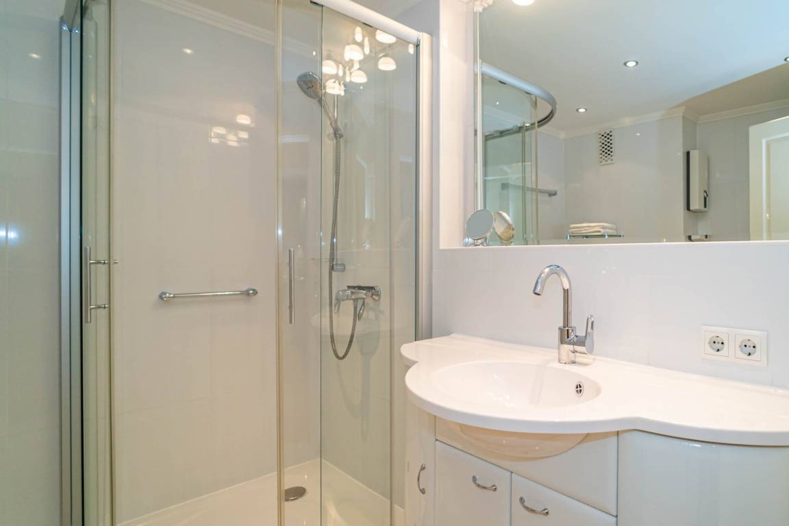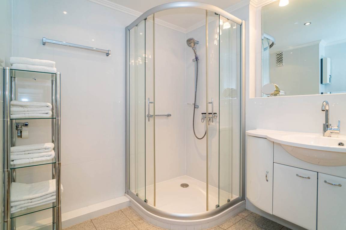 Im Bad befinden sich eine Dusche, ein WC, ein Waschtisch, Radio und ein Fön.