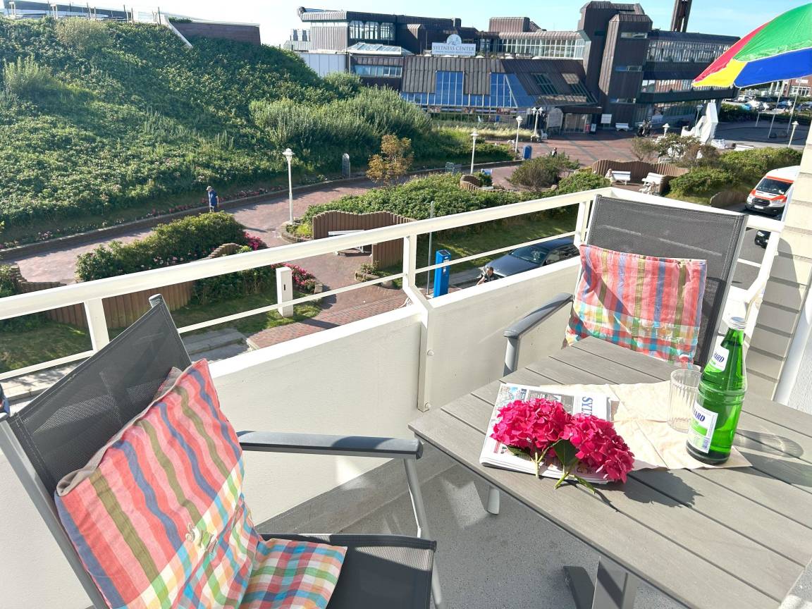 Balkon in Richtung Westen mit Blick auf den Strandübergang an der Sylter Welle. Gemütliche Balkonmöblierung. Dieses Appartement hat keinen Stellplatz- in etwa 400 m Entfernung gibt es kostenlose Parkplätze- vor dem Haus darf kostenlos das Auto be.- und entladen werden.