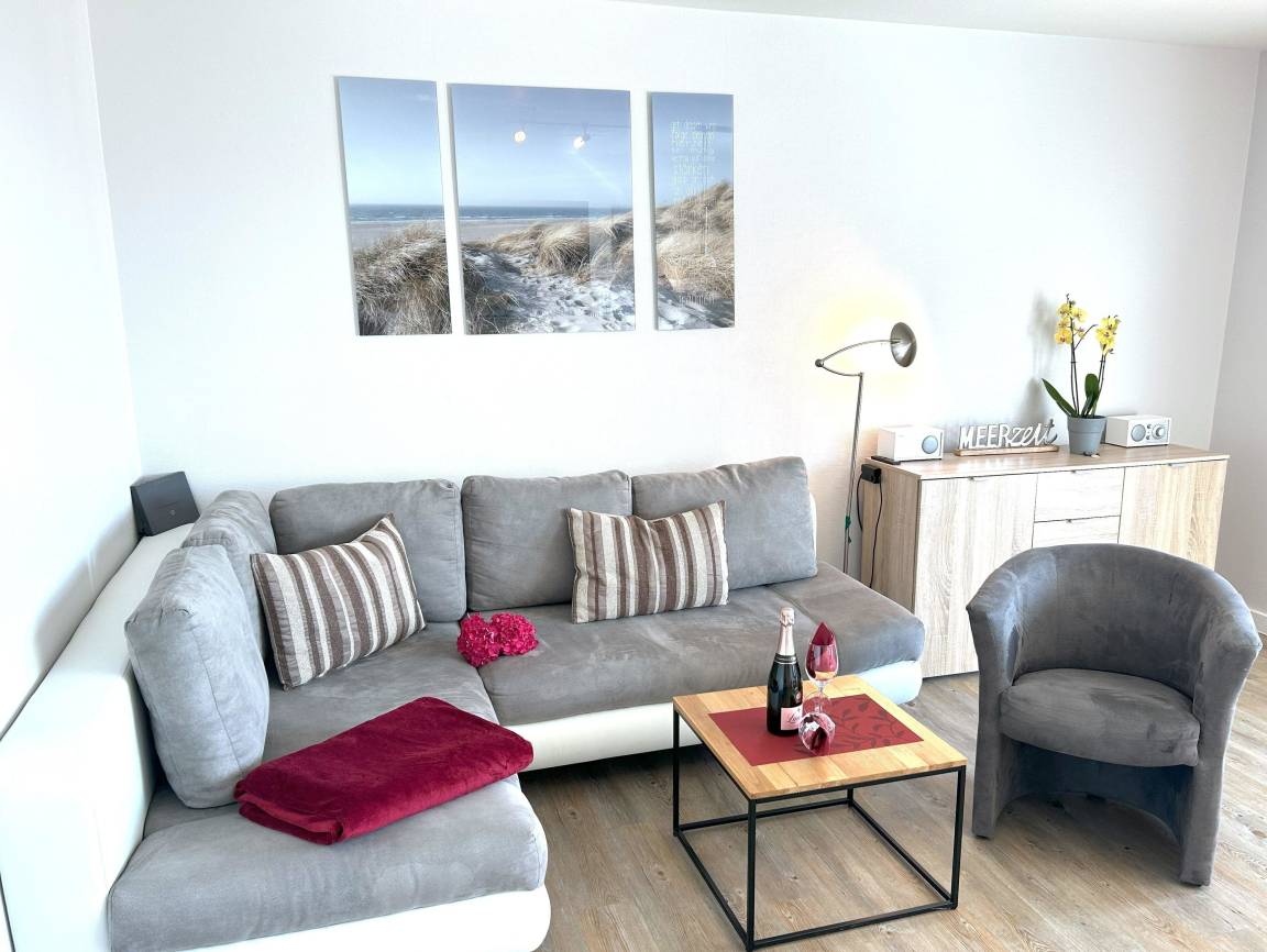 Die moderne ausgestattete 2-Zimmer-Wohnung ist ca.47 m² groß eine stilvolle, mit viel Liebe zum Detail ausgesuchte Einrichtung und Platz für bis zu vier Personen. Sie liegt in der 2. Etage (Fahrstuhl) des beliebten Appartementhauses und ist zur Seeseite ausgerichtet. Der gemütlich eingerichtete Wohnraum hat einen Essplatz direkt am großen Fensterelement mit Blick auf die "Düne" der "Sylter Welle", eine bequeme Schlaf- Couchgarnitur mit Couchtisch, neuen großen Flachbild-TV sowie Stereo Radio-Center und einem Schrankbett (Maße je 0,90 x 2 ,00m),...