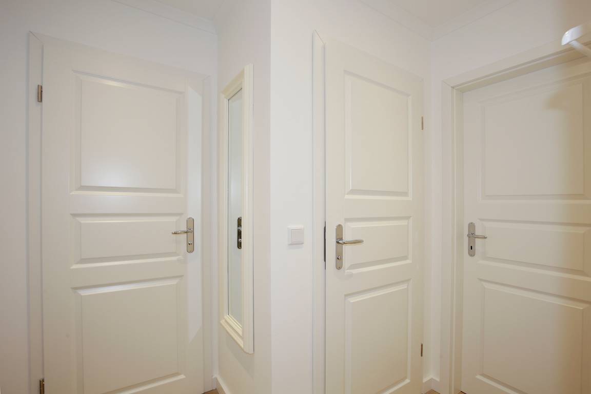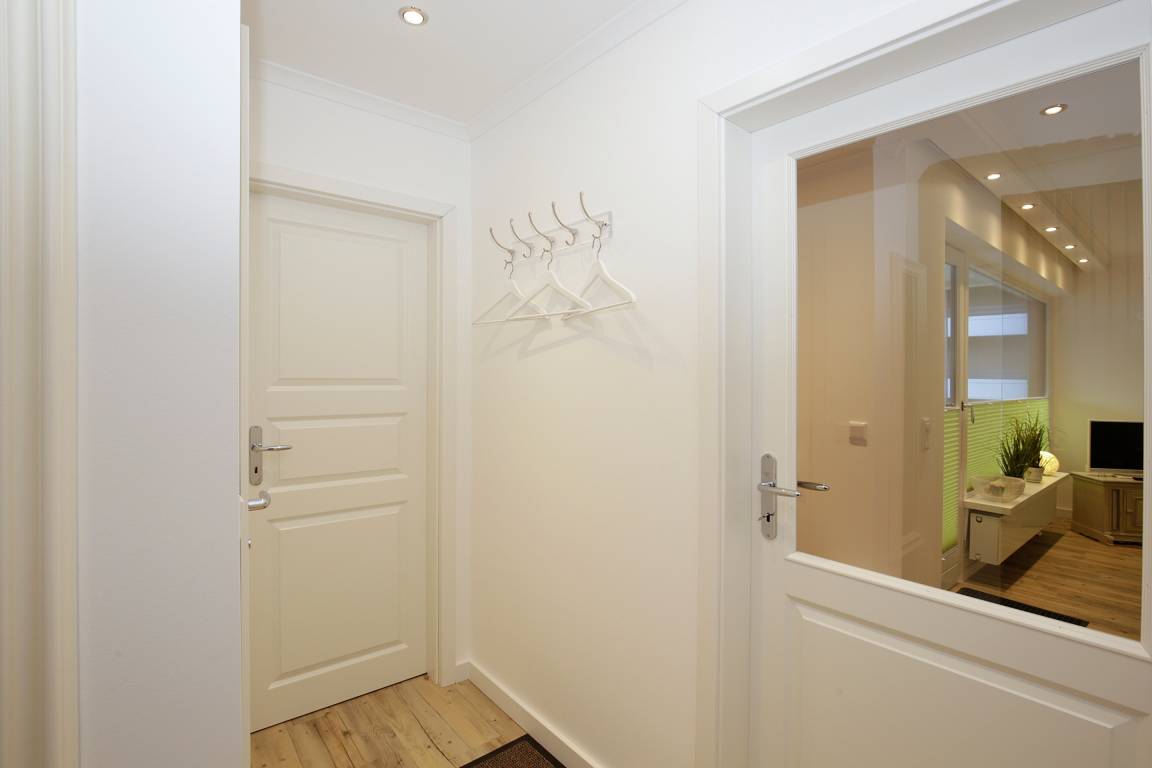 Beim Betreten gelangen Sie über einen einladenden Vorflur mit Garderobe in die offen gestalteten Bereiche der Wohnung. Der angrenzende Wohnbereich beeindruckt mit einer hochwertigen Ledercouch, die eine Schlaffunktion mit separater Matratze in optimaler Liegehöhe bietet, sowie einem komfortablen Cocktailsessel mit Fußhocker von Bielefelder Werkstätten. Ein separater Essplatz lädt zu geselligen Mahlzeiten ein, während Flachbild-TV, DVD-Player, Radio/CD-Player, ein Telefon mit Flatrate ins deutsche Festnetz (Handynummern gesperrt) und kostenloses WLAN für beste Unterhaltung sorgen.